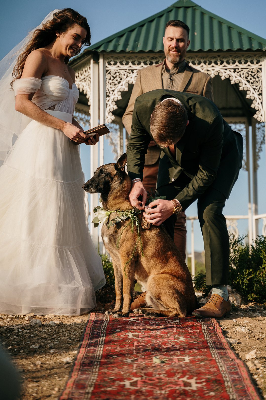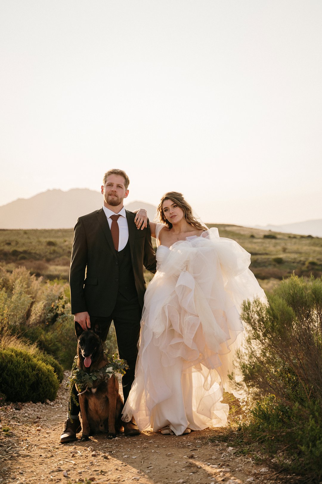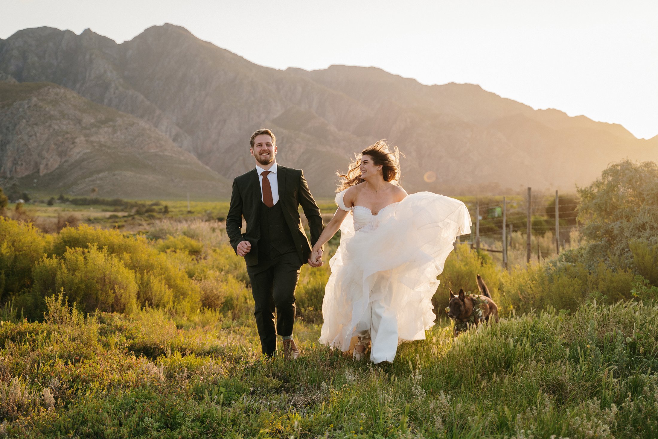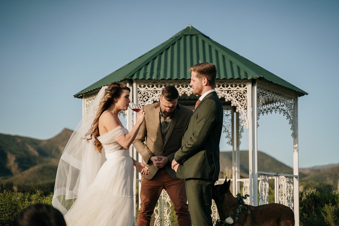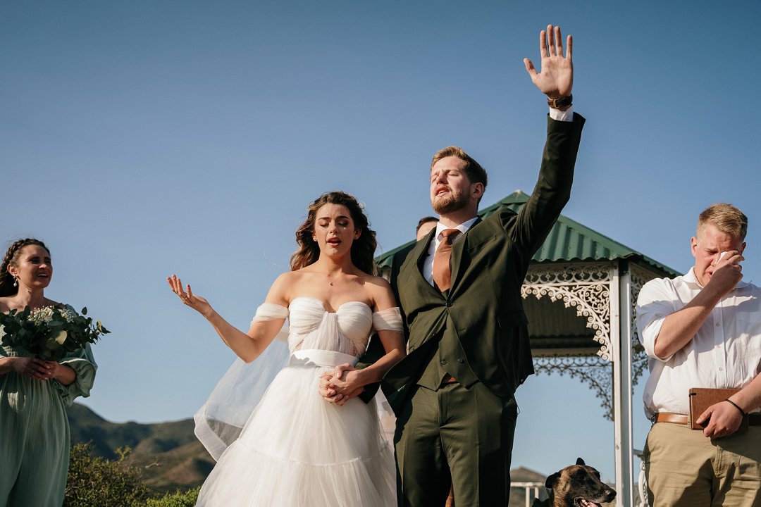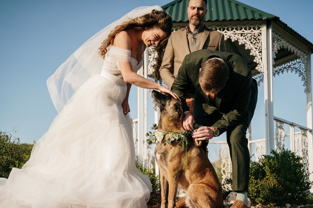 Ek het afgestap van die wittebroodsuite, wat teen die heuwel af was – ʼn loop van omtrent drie minute. Die gaste en my man het die hele tyd gekyk hoe ek die pad afstap, wat vir almal meer tyd gegee het om die oomblik werklik in te neem. Die berge het as die pragtige agtergrond gedien, en my hond en sy doggy cousins het opgewonde voor ons uitgehardloop met kranse om hul nekke, terwyl hulle uitbundig geblaf het.