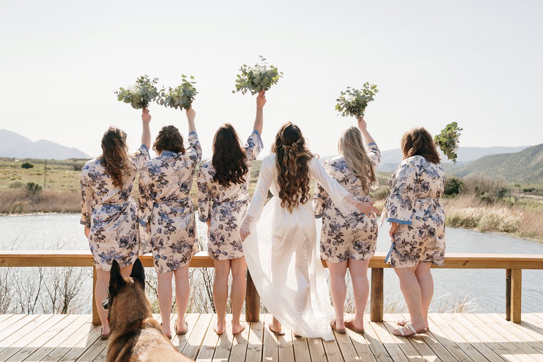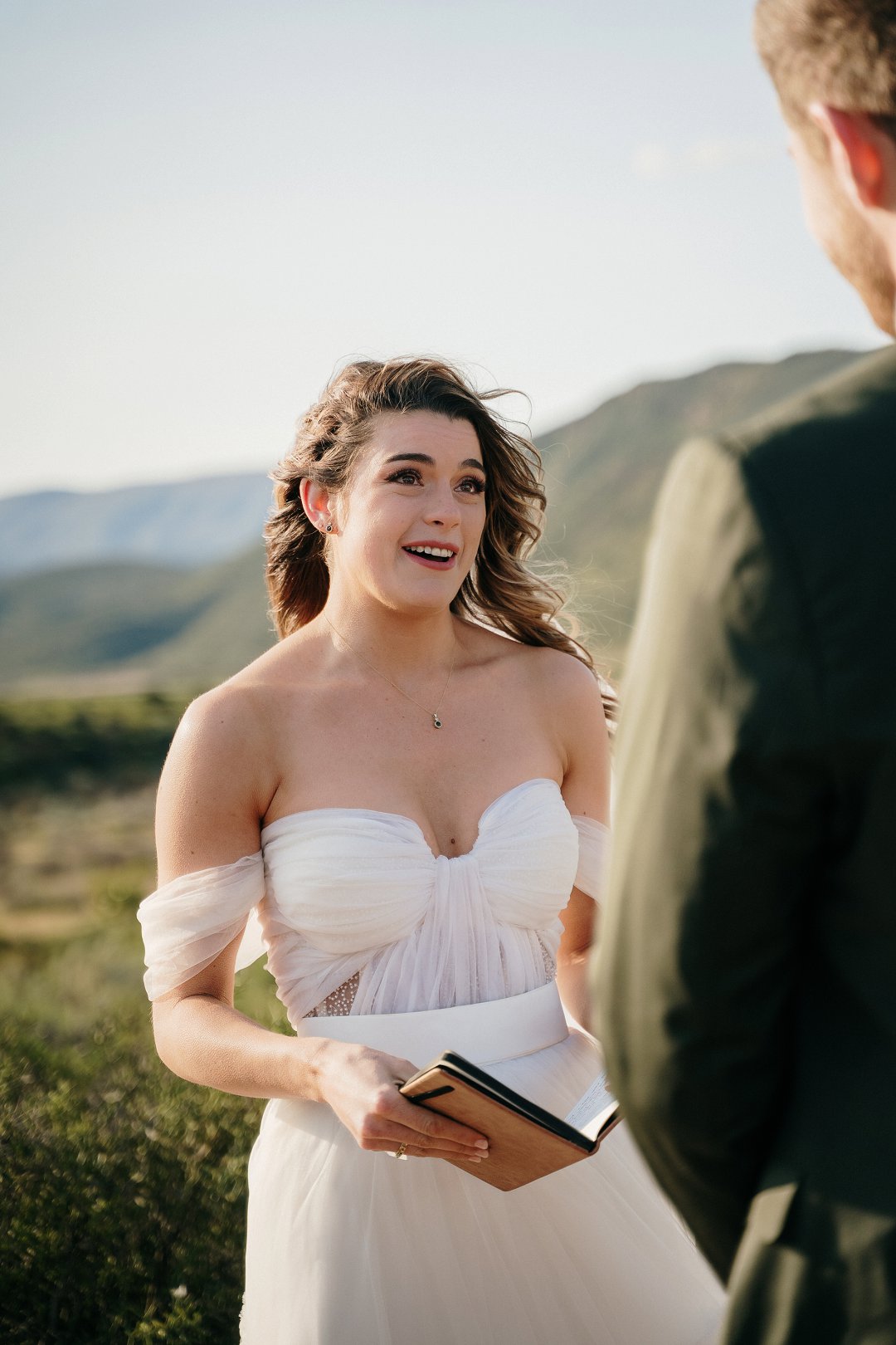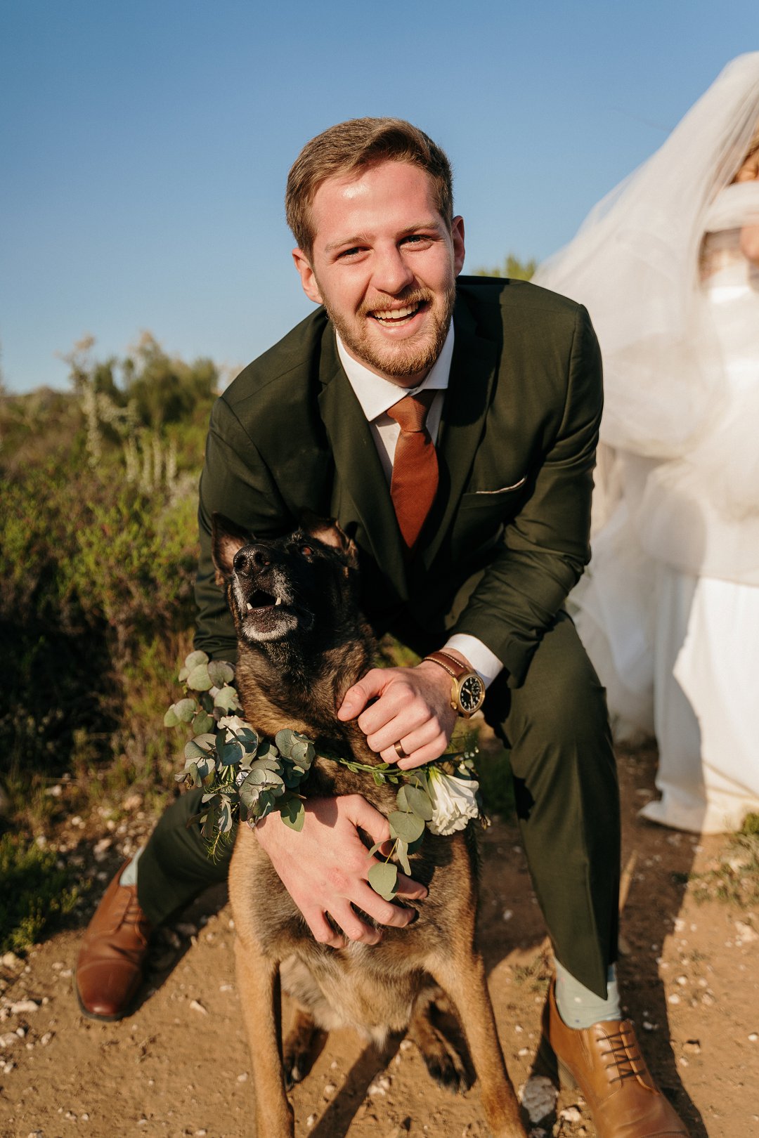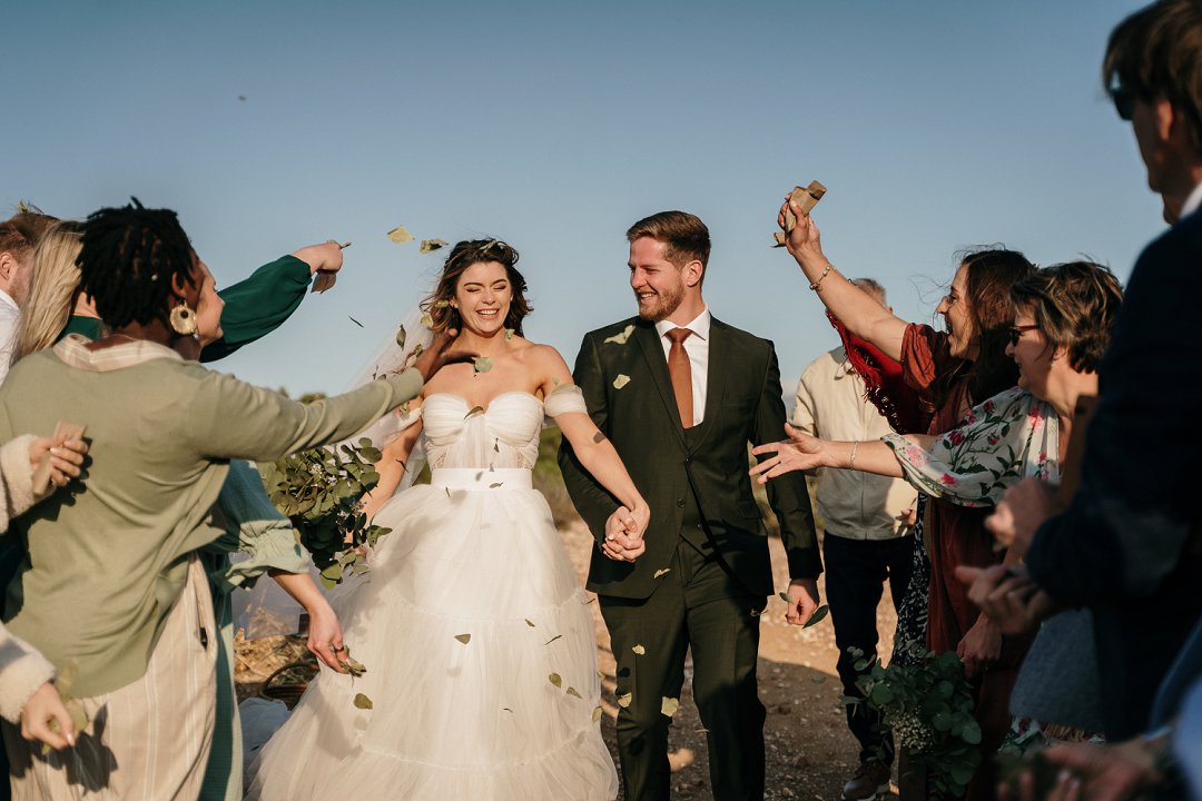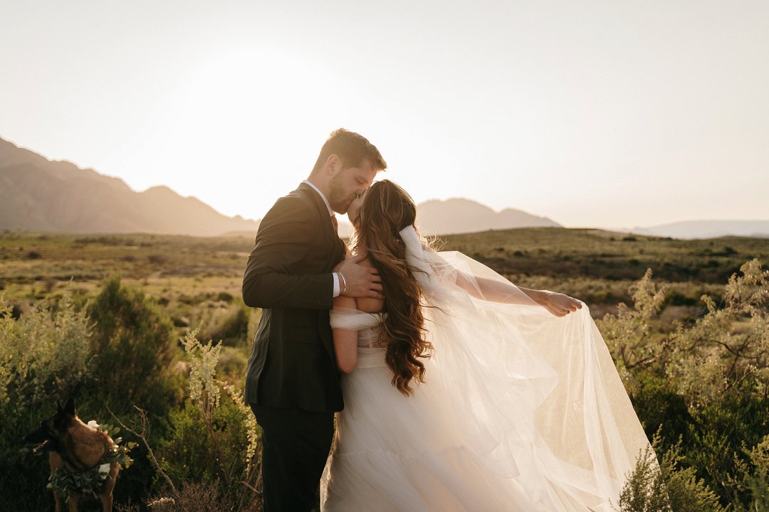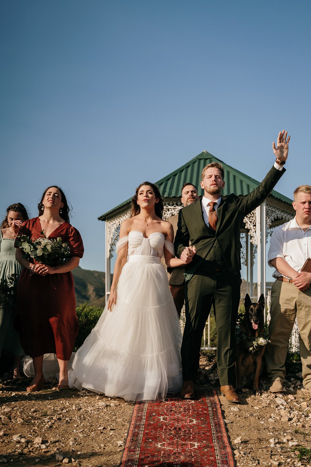 Ek het afgestap van die wittebroodsuite, wat teen die heuwel af was – ʼn loop van omtrent drie minute. Die gaste en my man het die hele tyd gekyk hoe ek die pad afstap, wat vir almal meer tyd gegee het om die oomblik werklik in te neem. Die berge het as die pragtige agtergrond gedien, en my hond en sy doggy cousins het opgewonde voor ons uitgehardloop met kranse om hul nekke, terwyl hulle uitbundig geblaf het.