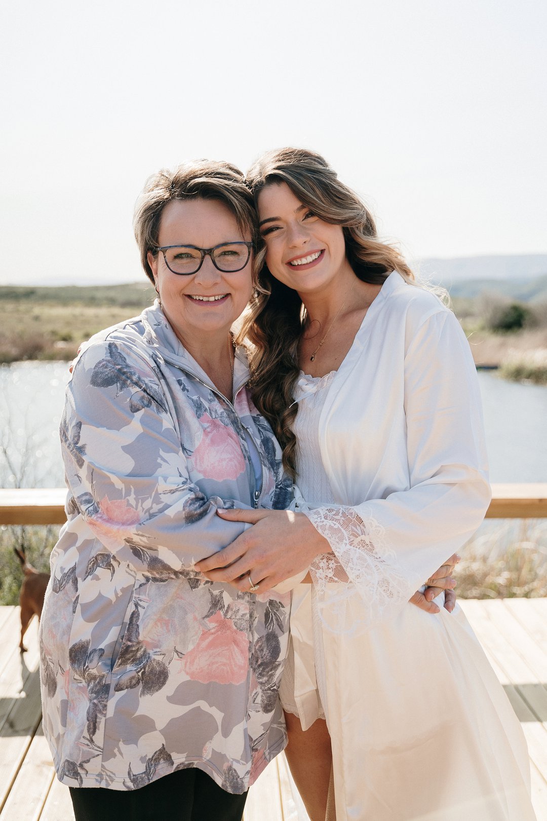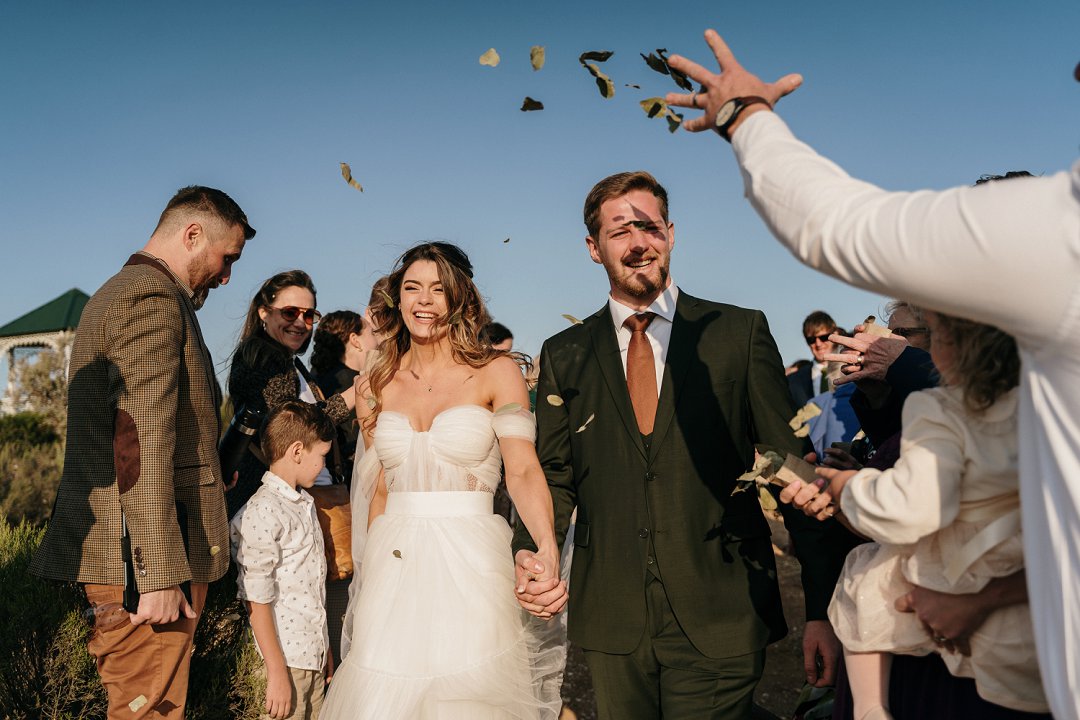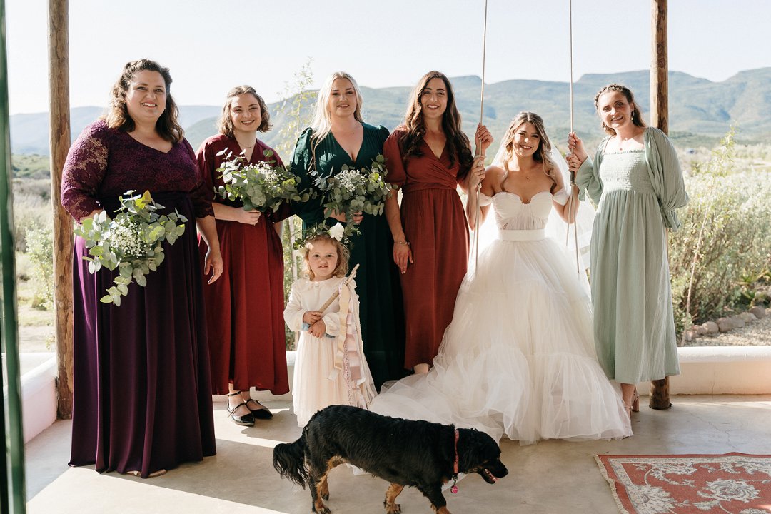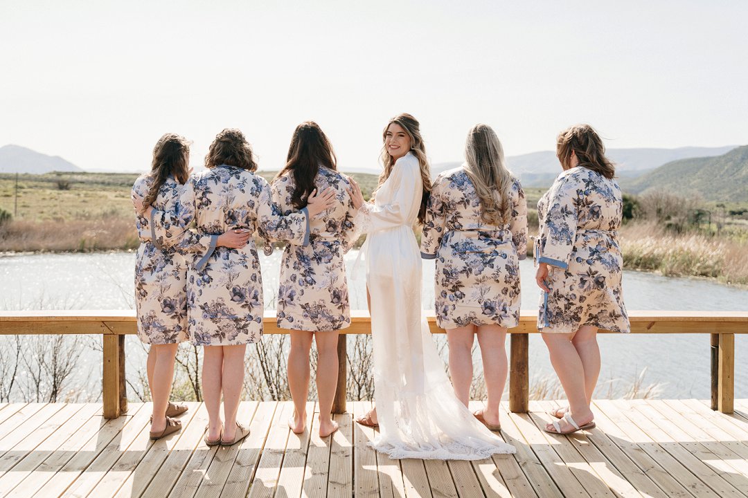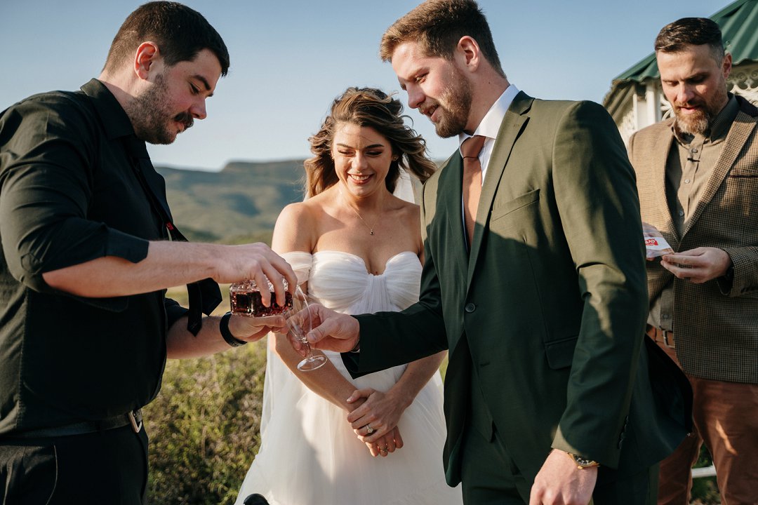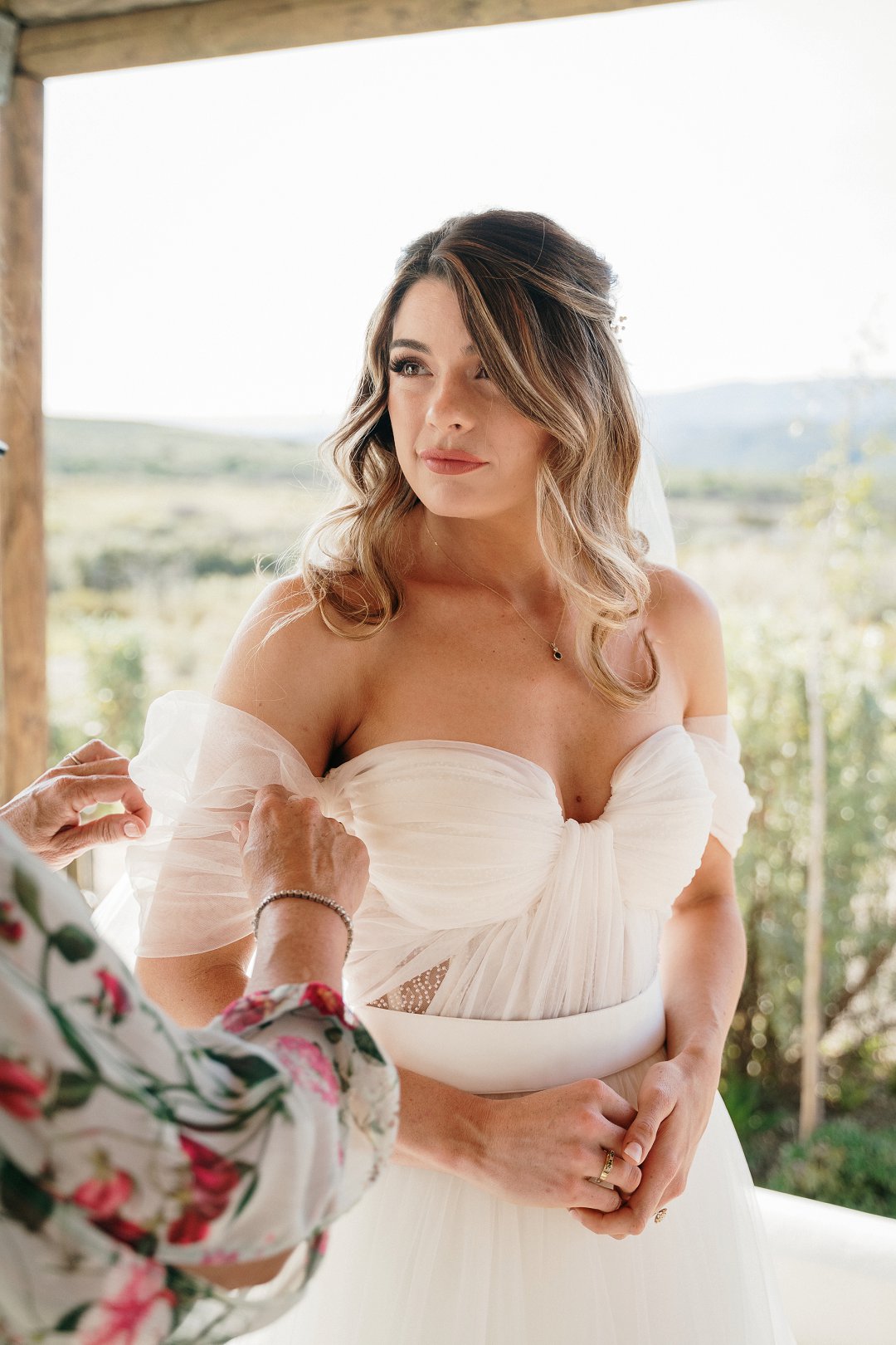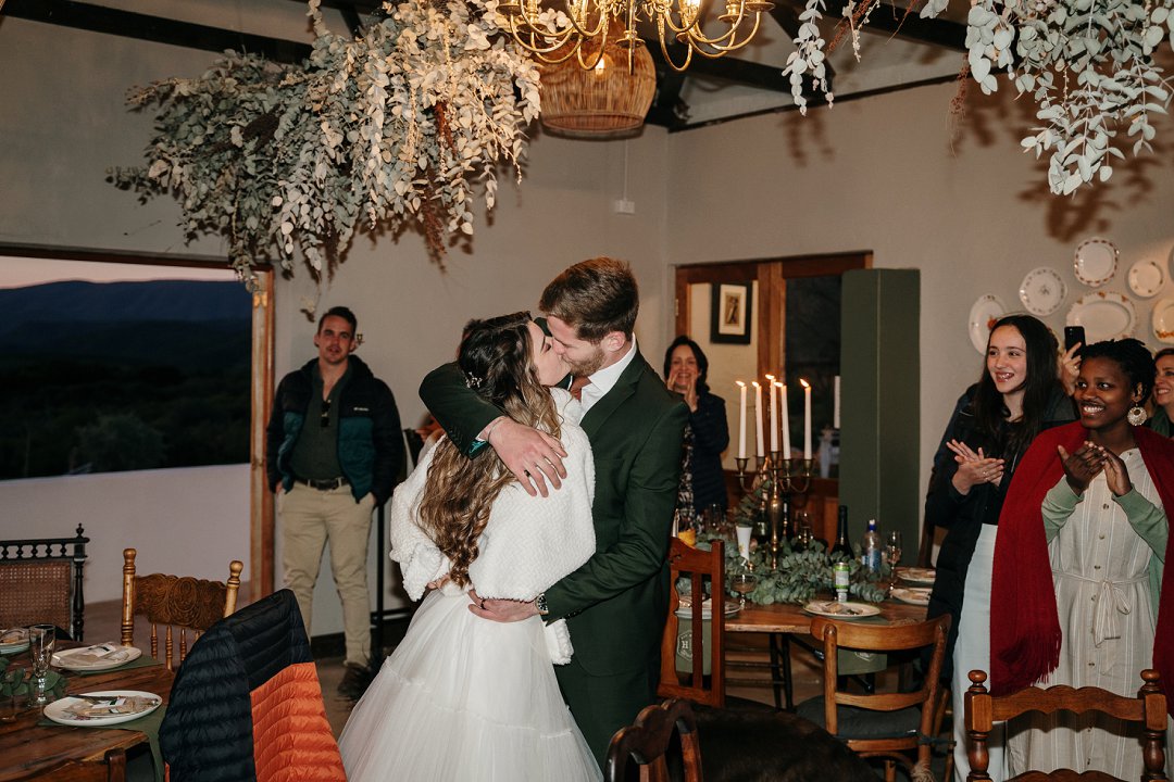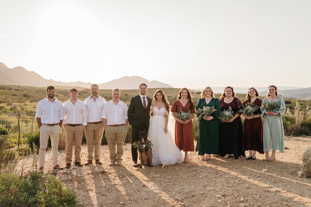 Ek het afgestap van die wittebroodsuite, wat teen die heuwel af was – ʼn loop van omtrent drie minute. Die gaste en my man het die hele tyd gekyk hoe ek die pad afstap, wat vir almal meer tyd gegee het om die oomblik werklik in te neem. Die berge het as die pragtige agtergrond gedien, en my hond en sy doggy cousins het opgewonde voor ons uitgehardloop met kranse om hul nekke, terwyl hulle uitbundig geblaf het.