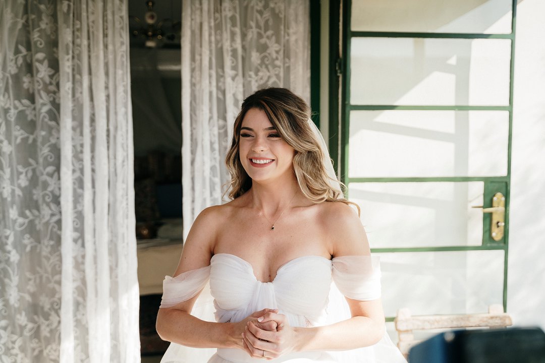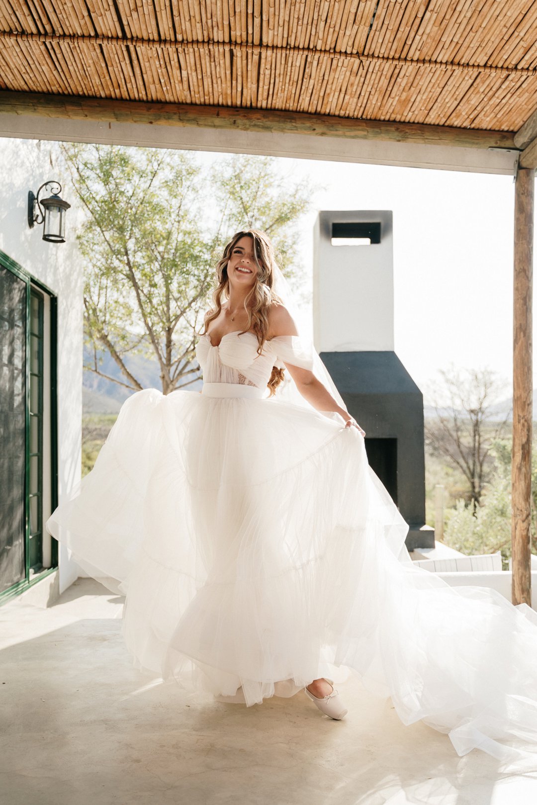 Die rok was perfek vir ons seremonie op ʼn heuwel omring deur fynbos en blomme. Gaste kon nie ophou sê hoe goed dit my gepas het nie. Ek het met die sluier en tule-romp afgestap en ook my eerste dans met my pa gedoen. Toe dit tyd was vir Kai en my se dans, het ek hom verras deur vinnig my moue, sluier en romp af te haal en terug te kom in ʼn meer sexy weergawe van die rok. Hy was geskok en het tegelykertyd gebloos en gelag!