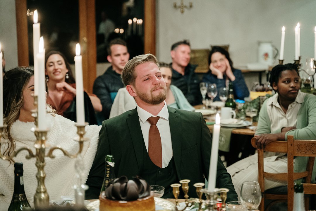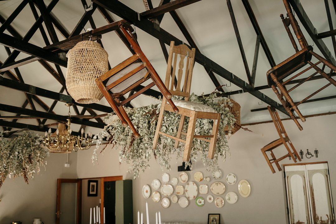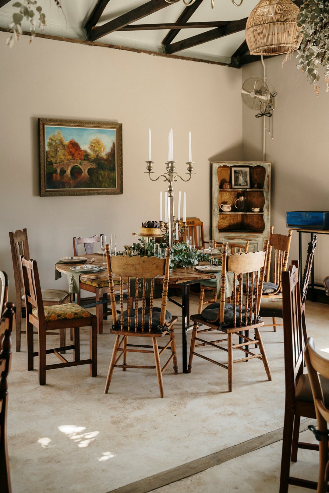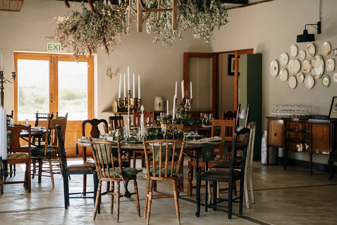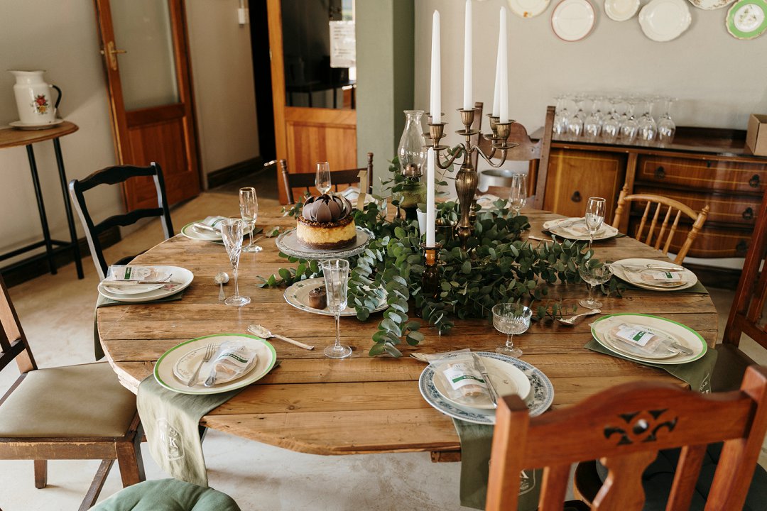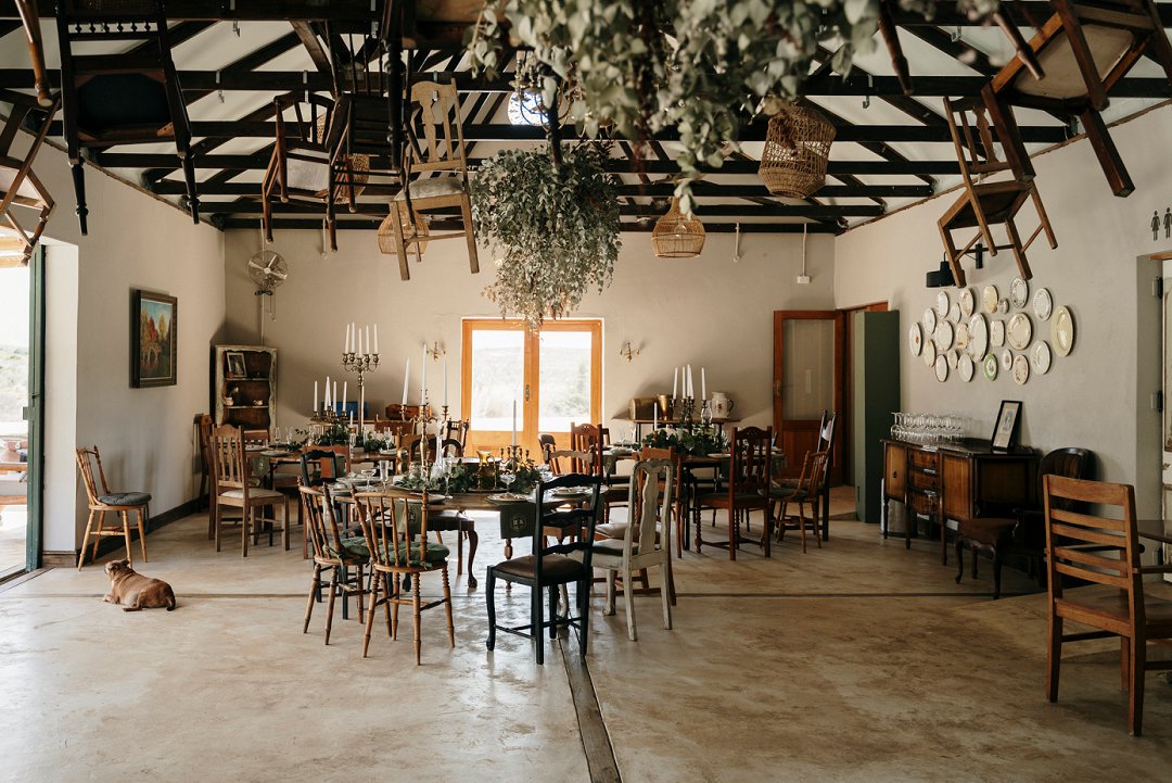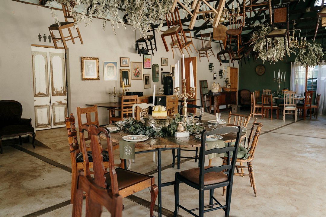 Ronde houttafels met verskillende stoele het die onthaal styl beklemtoon. Pragtige vintage kandelare en glasware het die tafels versier. Die kandelare en kerse het ʼn gesellige, romantiese atmosfeer geskep. Elke gaste tafel het sy eie koek gehad, wat ons absoluut oulik gevind het. Die venue het ook verseker dat die gaste heerlike kos en gerieflike verblyf geniet.