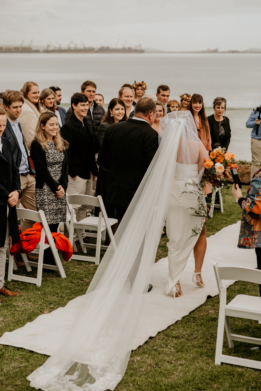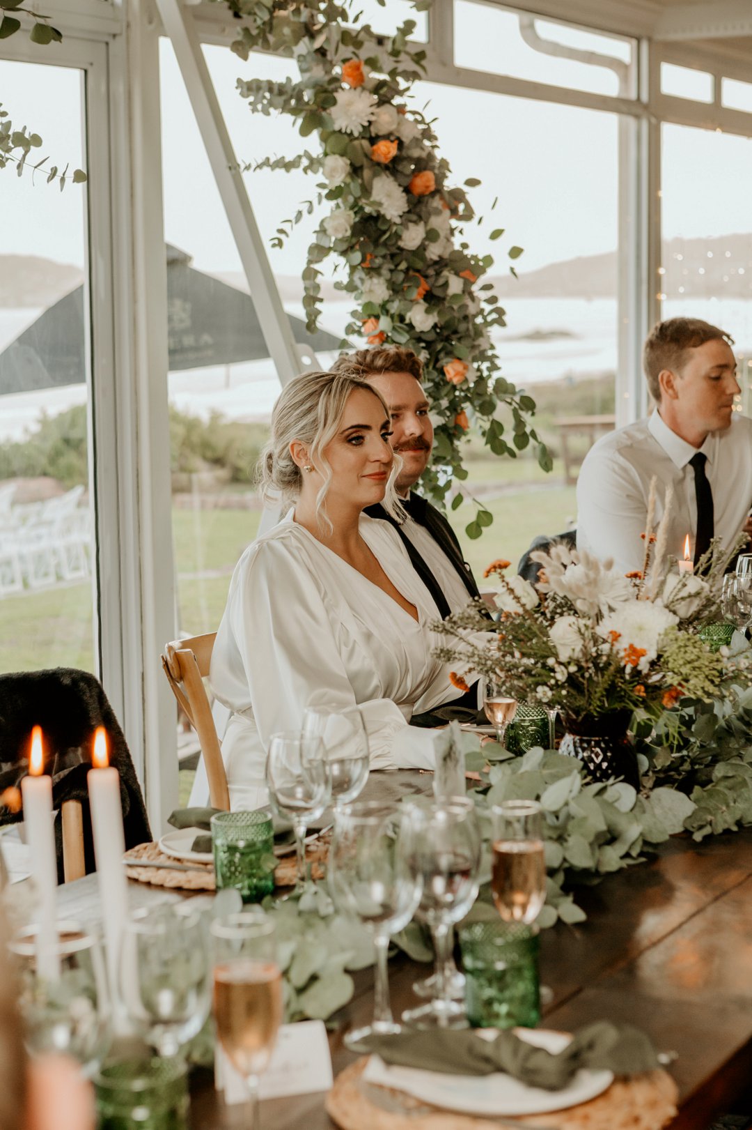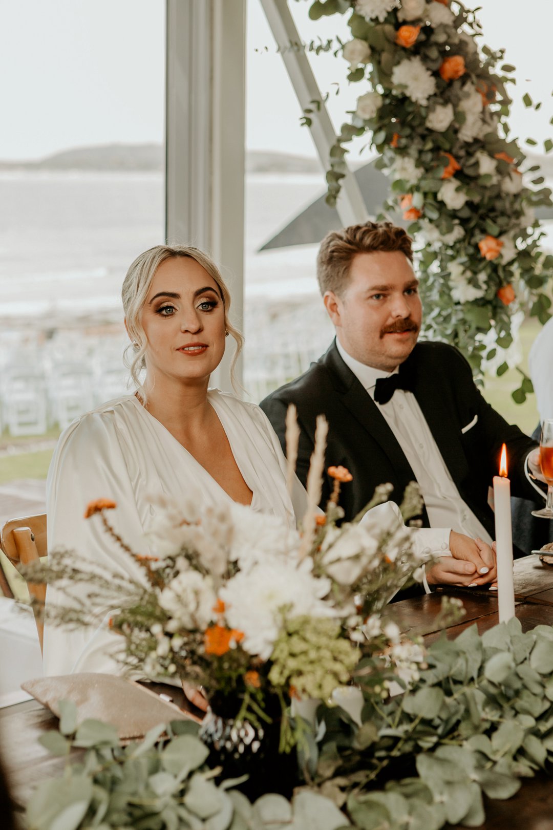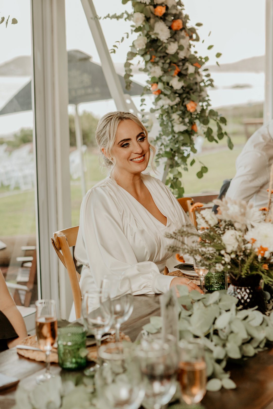 Die weer het perfek saamgespeel, wat ons in staat gestel het om buite op die grasperk voor die see ons seremonie te hou. Dit het ʼn balans geskep tussen die ongerepte natuurlike omgewing en ons intieme troustyl. Ons troue was gemaklik, warm, en vrolik – ʼn naweek vol liefde, lag, en die spesiale mense in ons lewens, alles teen die asemrowende agtergrond van die Weskus strand.
