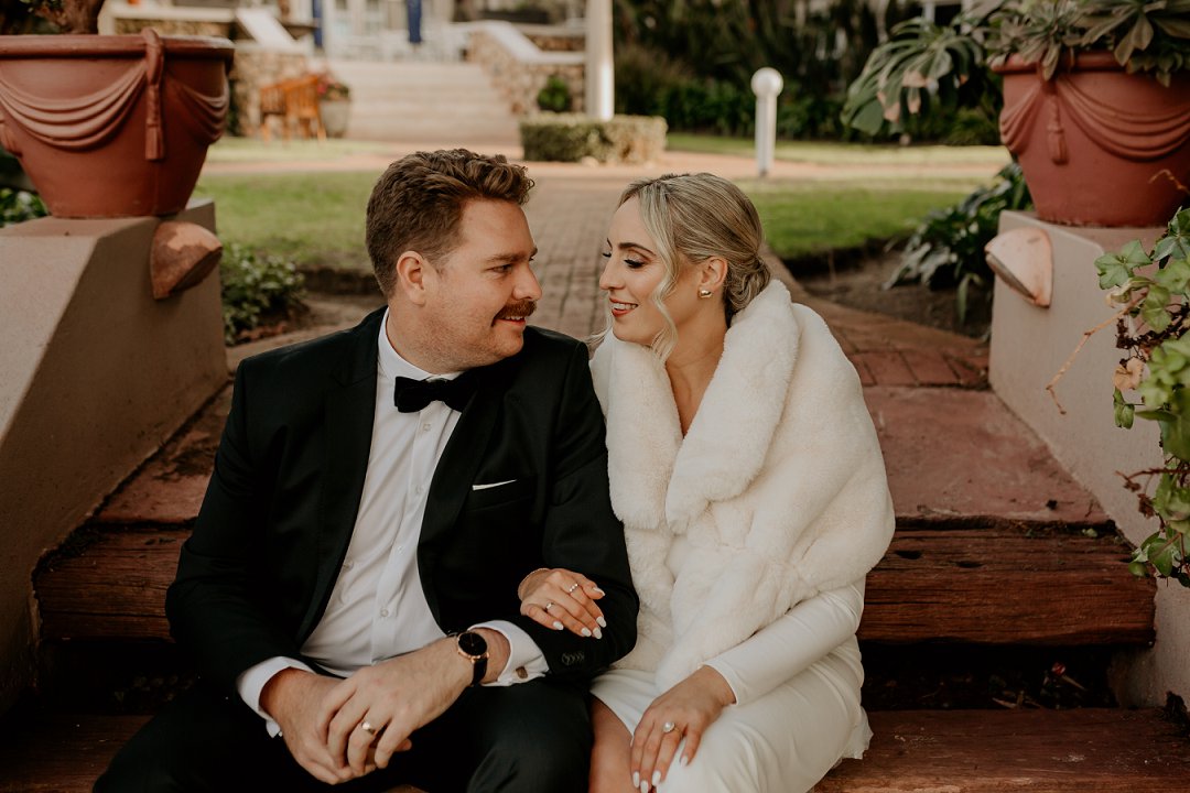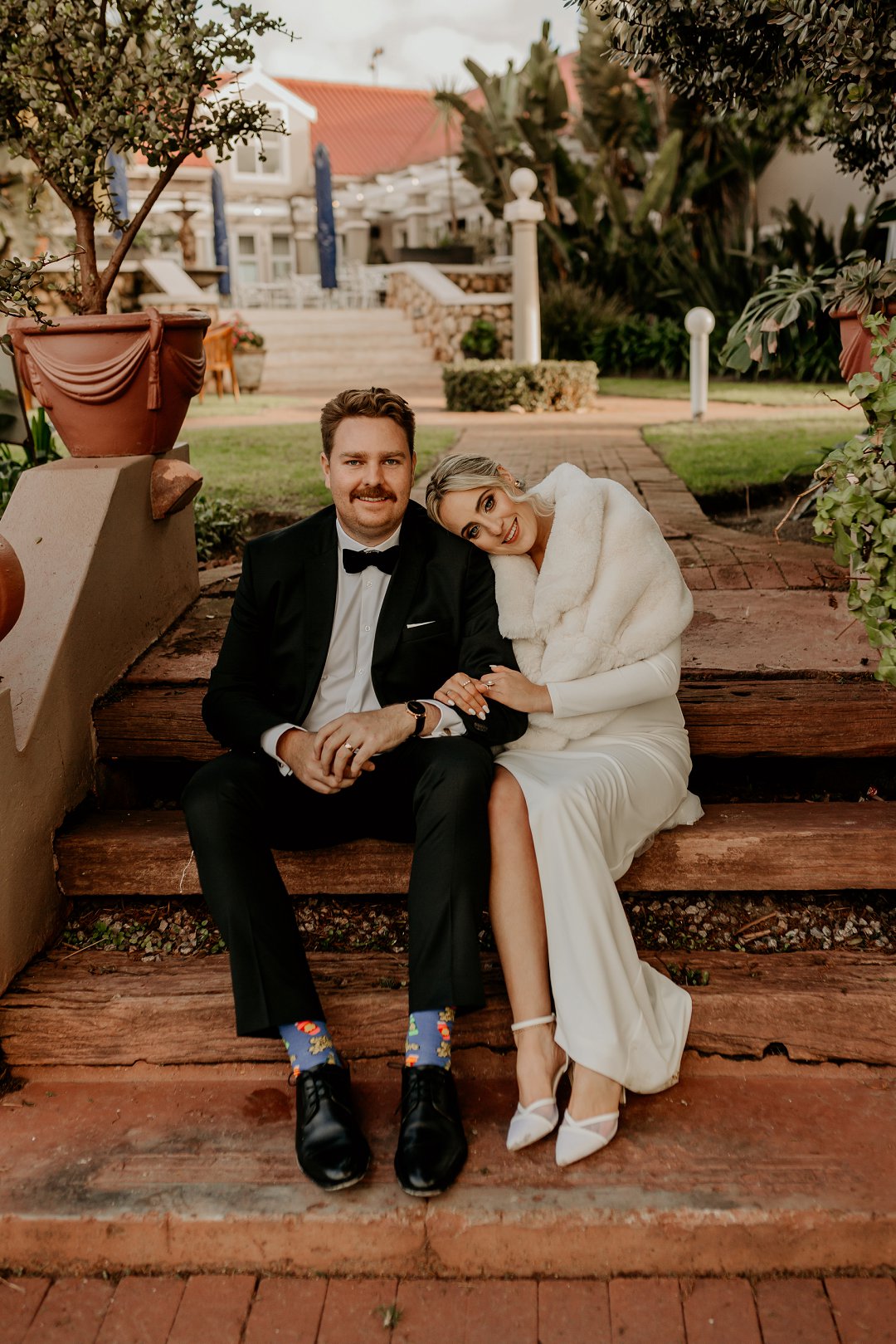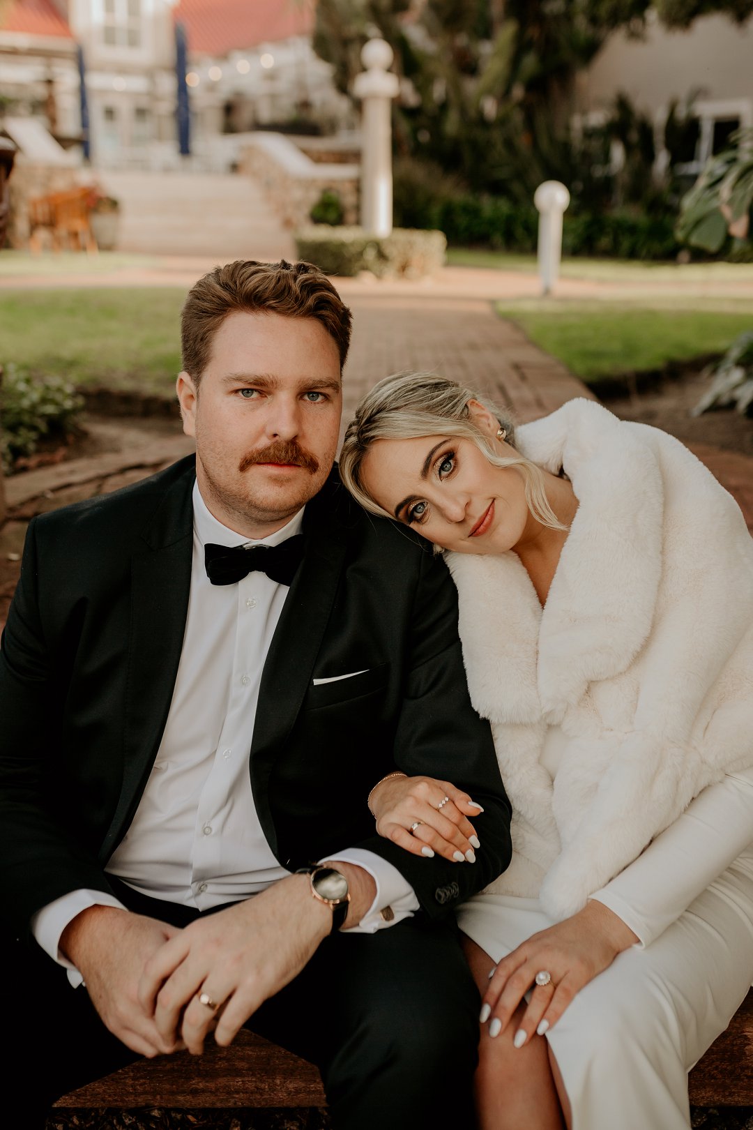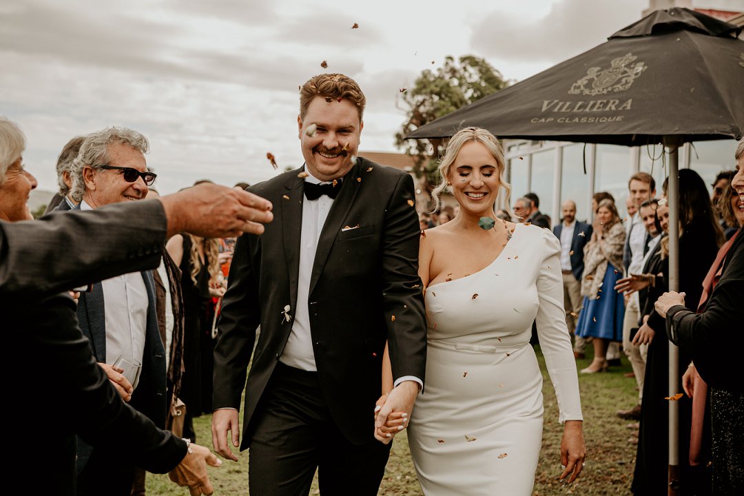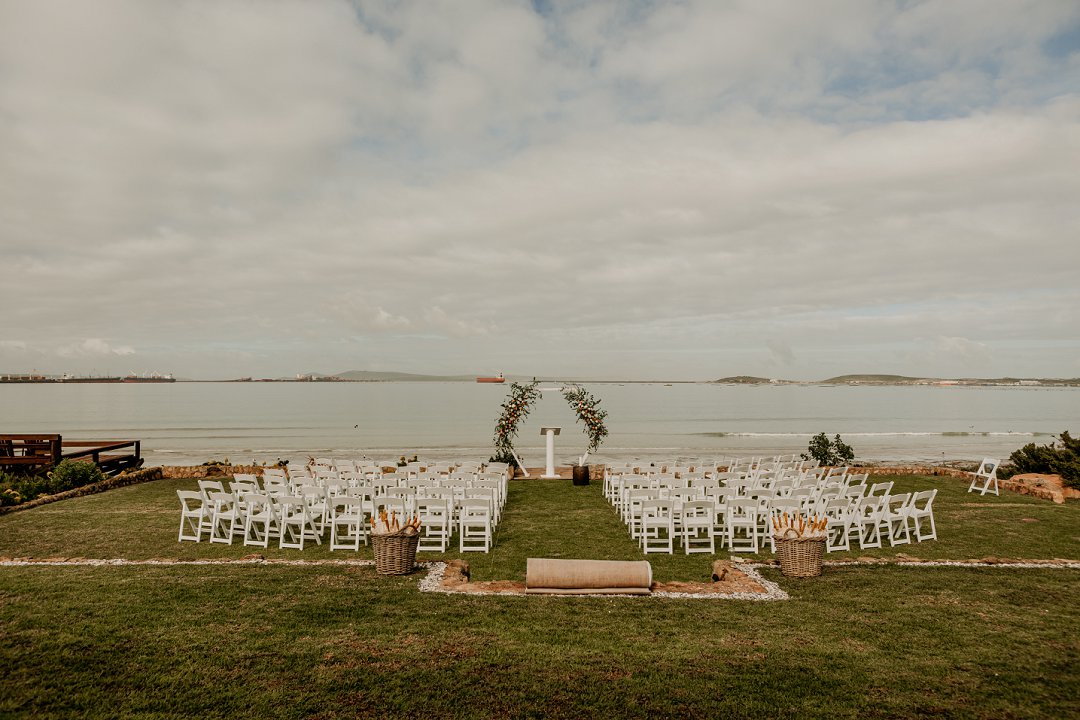 Die winterweer was perfek vir hul seremonie op die goedversorgde grasperke van Blue Bay Lodge met ʼn pragtige uitsig oor Saldanhabaai.
