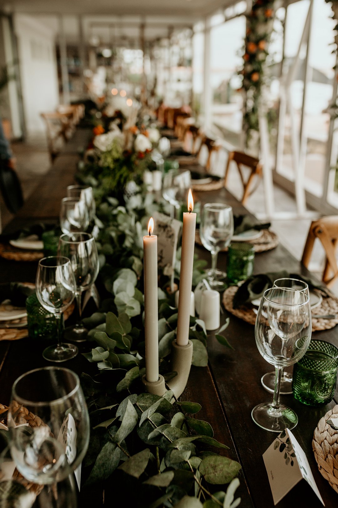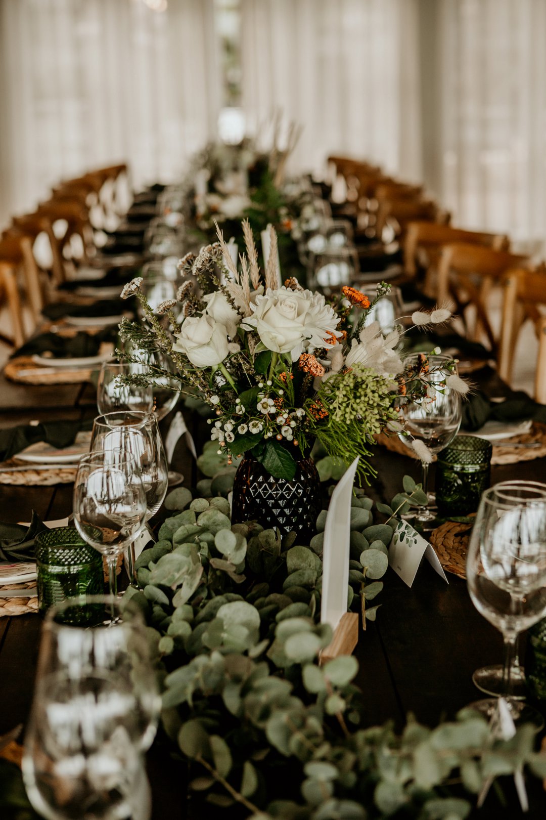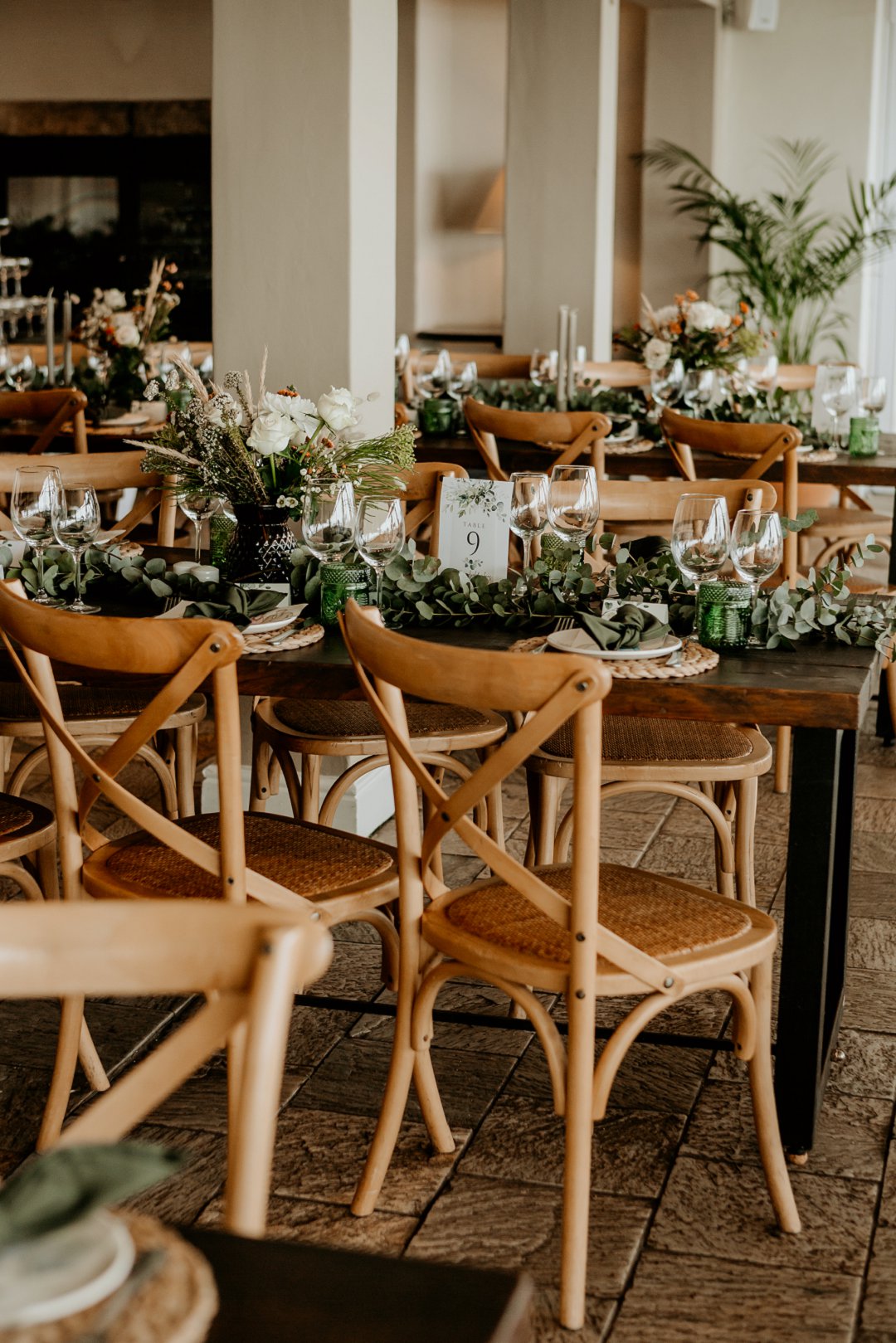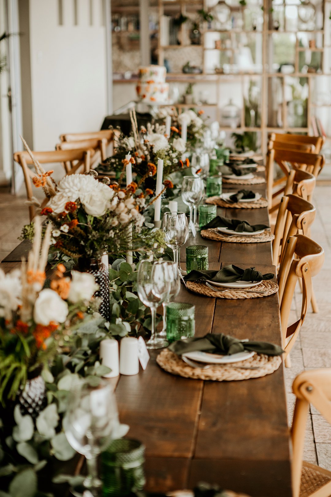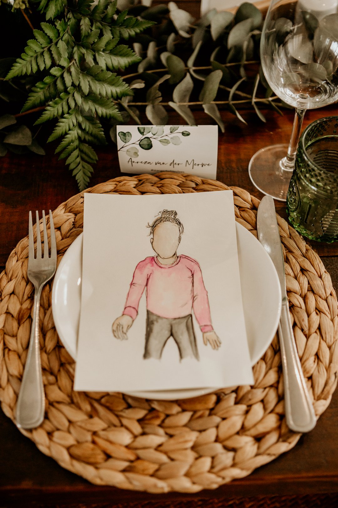 Ons kleurskema was ʼn kombinasie van wit en groen, met ʼn speelse tikkie oranje om ʼn vrolike en helder aksent te bied. Die dekor is eenvoudig gehou om die venue se natuurlike skoonheid te komplementeer. Ons het tafels versier met vars loof, terwyl Carla se ouma liefdevol blomrangskikkings gedoen het vir elke tafel. Olyfgroen waterglase, kershouers, kerse en -lapservette het die gewenste gevoel afgerond, terwyl elke gas ʼn persoonlike skets van hulle as geskenk op hul bord ontvang het.