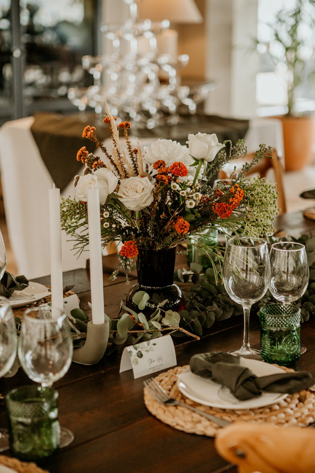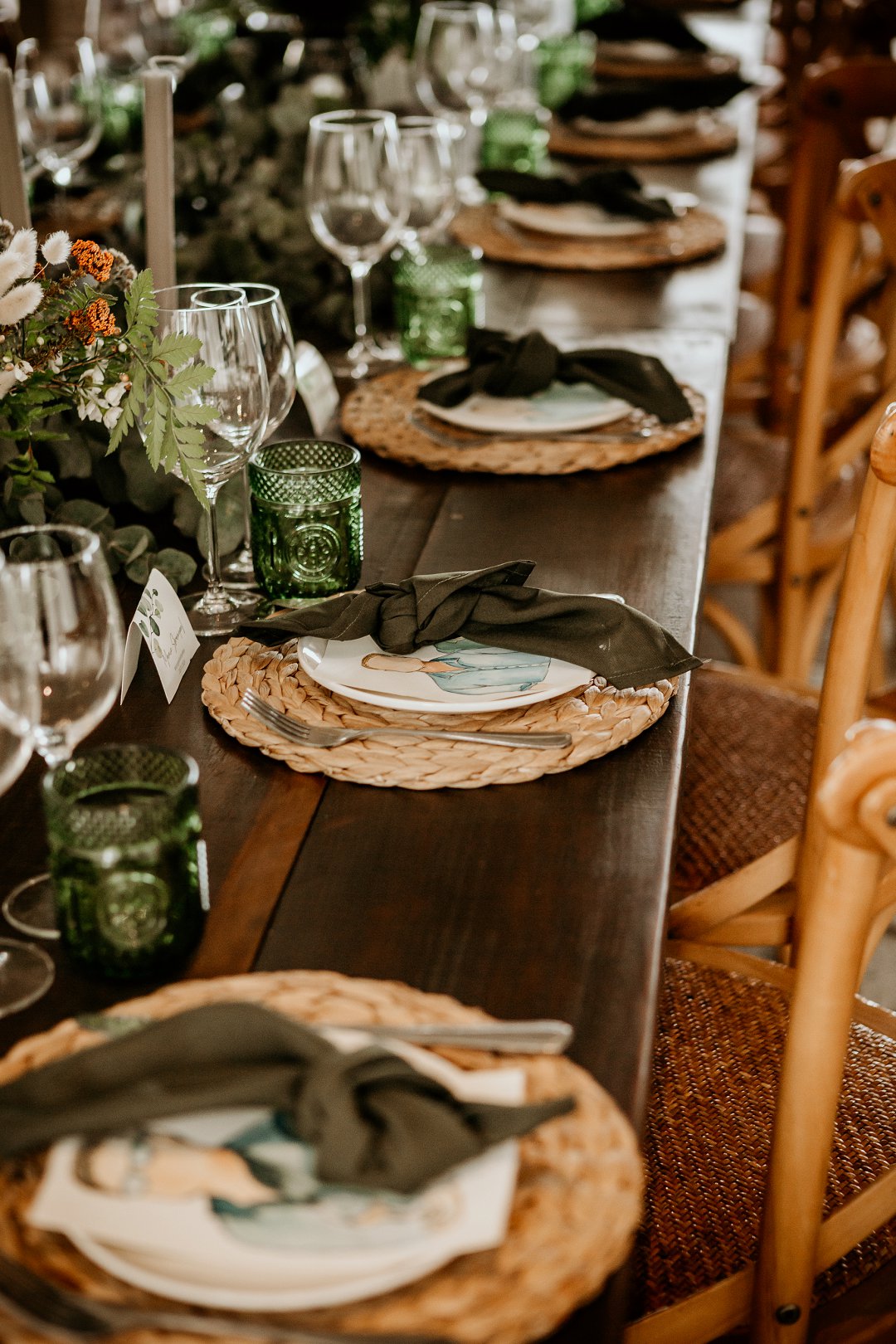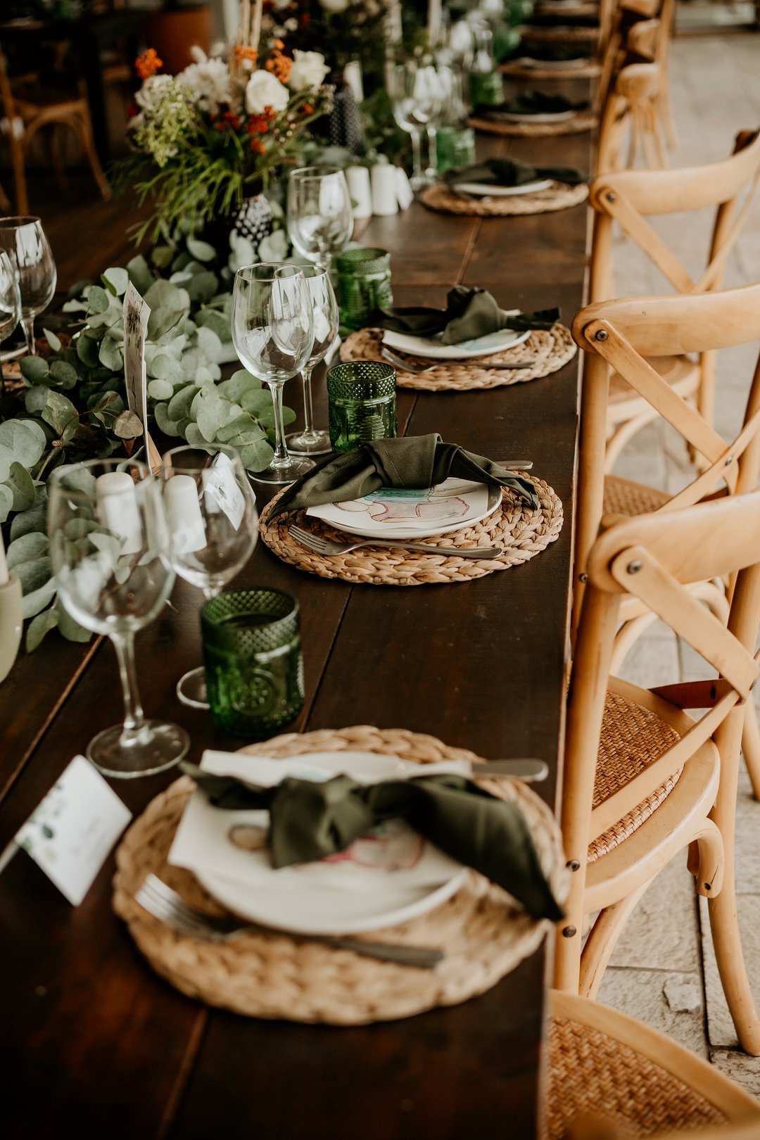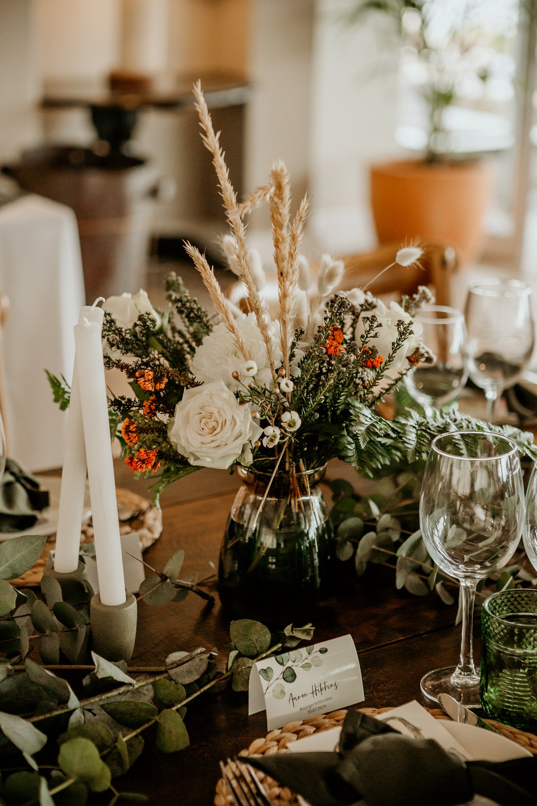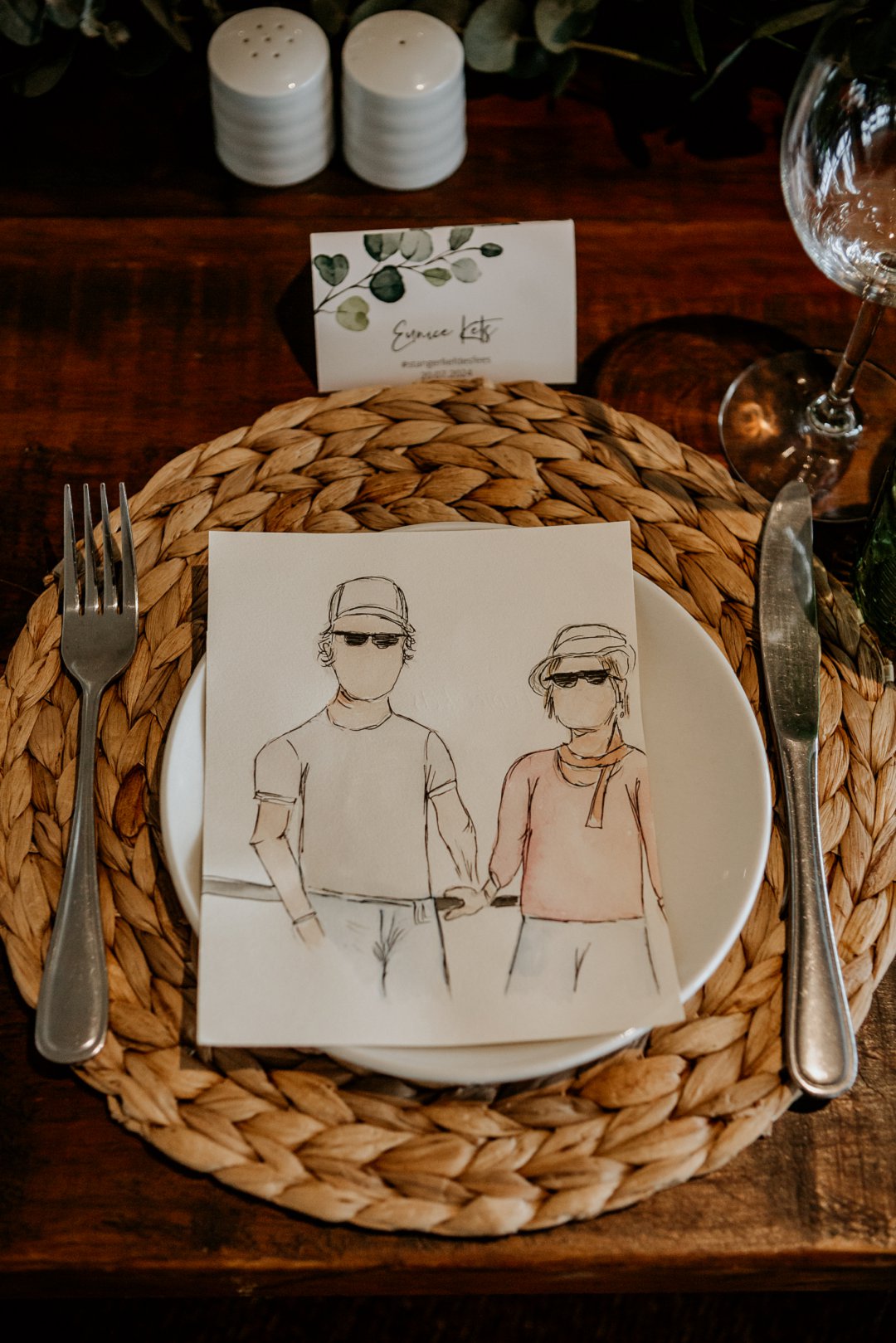 Ons kleurskema was ʼn kombinasie van wit en groen, met ʼn speelse tikkie oranje om ʼn vrolike en helder aksent te bied. Die dekor is eenvoudig gehou om die venue se natuurlike skoonheid te komplementeer. Ons het tafels versier met vars loof, terwyl Carla se ouma liefdevol blomrangskikkings gedoen het vir elke tafel. Olyfgroen waterglase, kershouers, kerse en -lapservette het die gewenste gevoel afgerond, terwyl elke gas ʼn persoonlike skets van hulle as geskenk op hul bord ontvang het.
