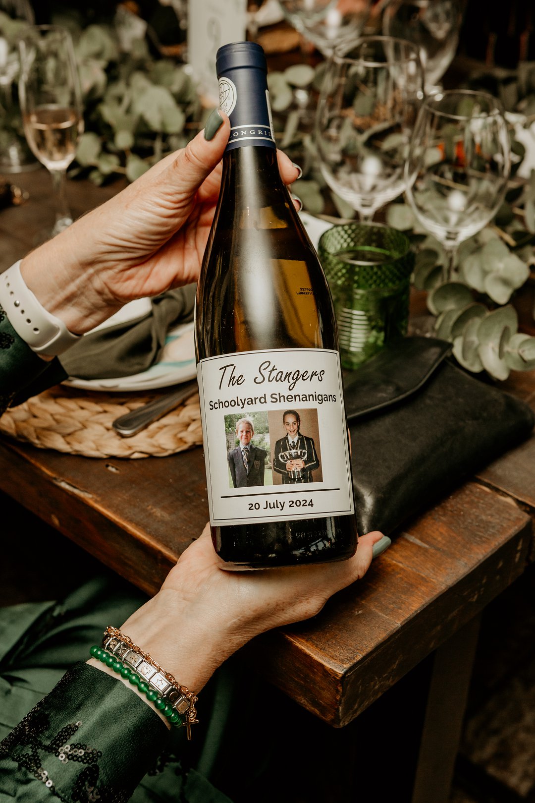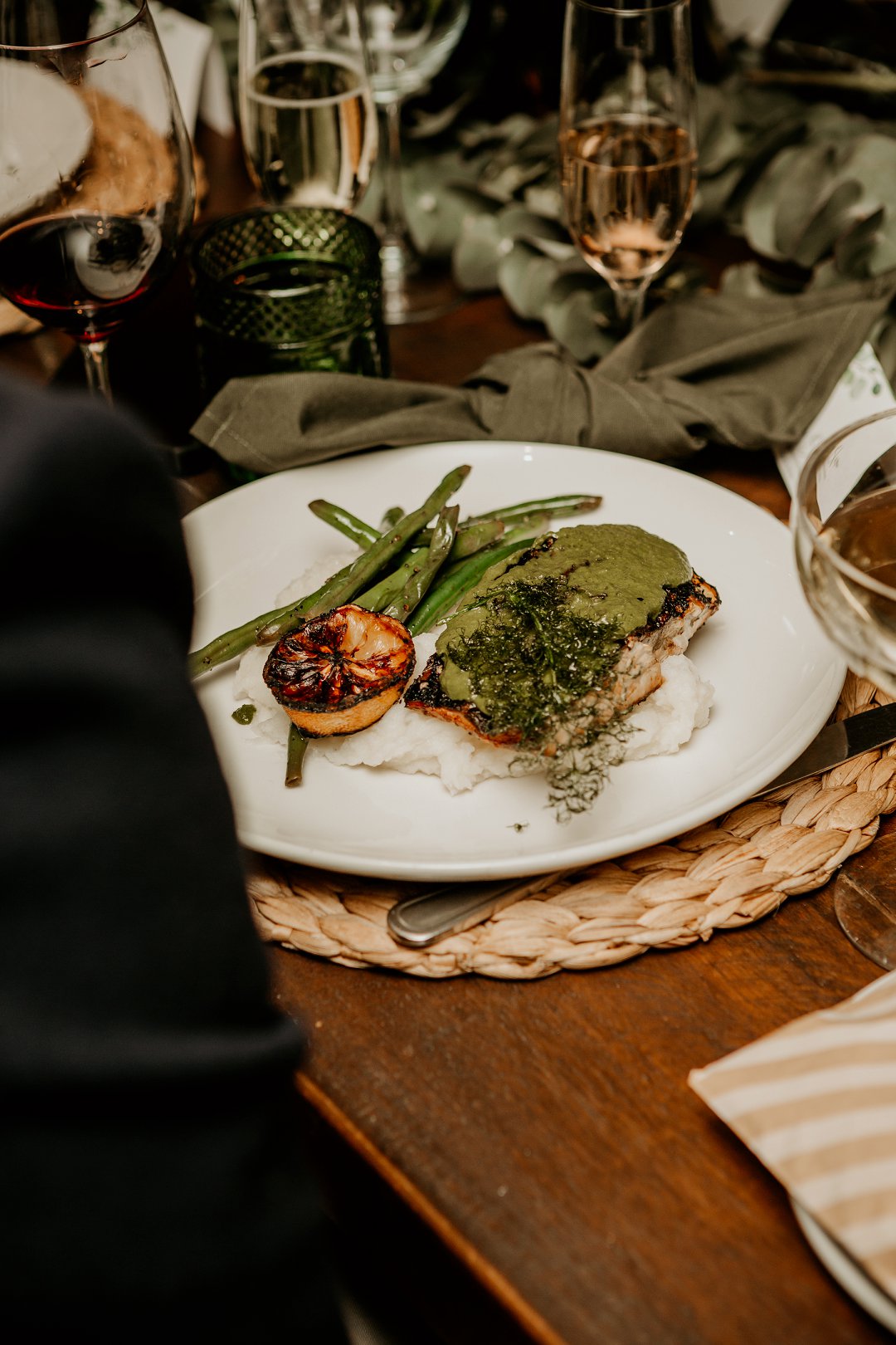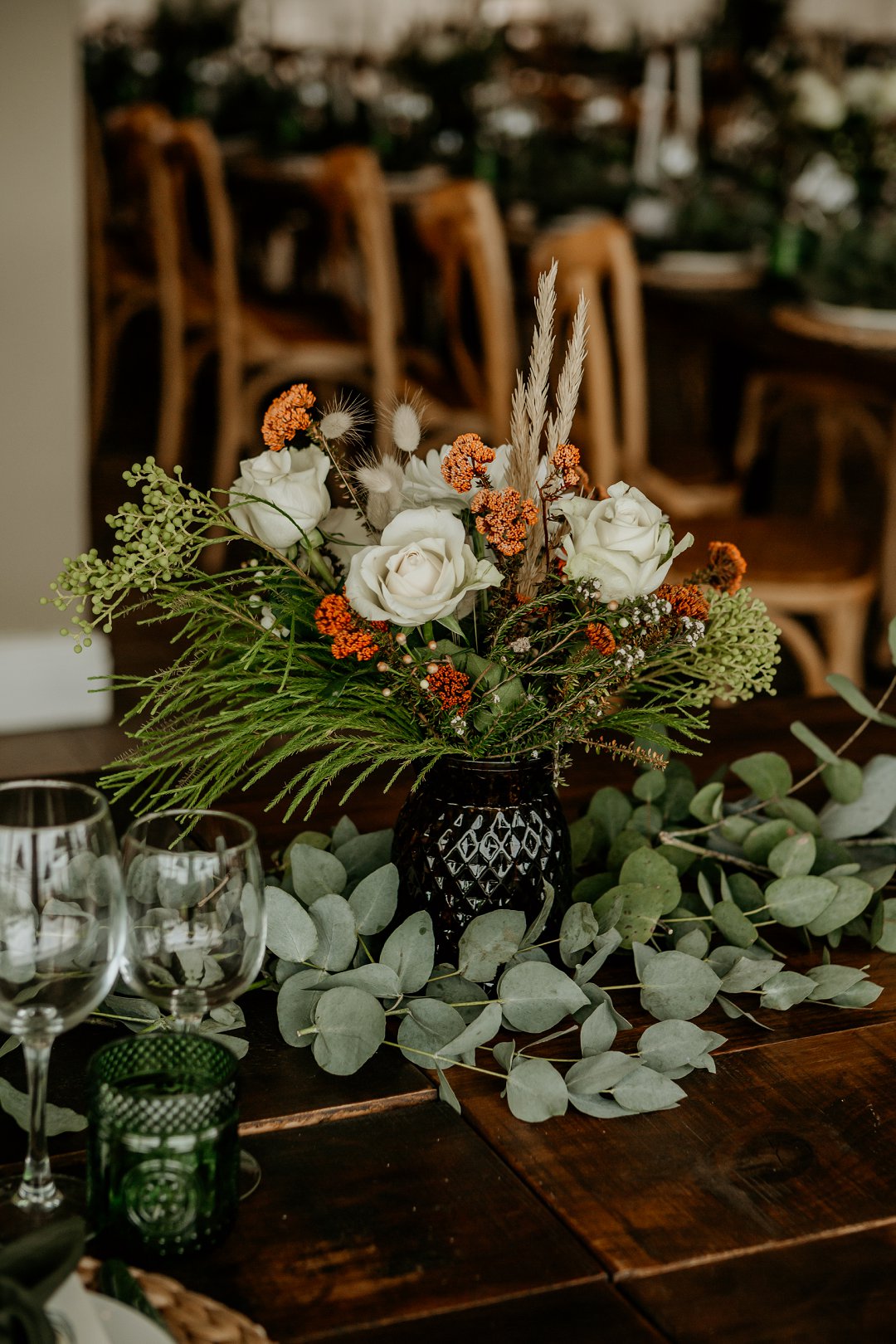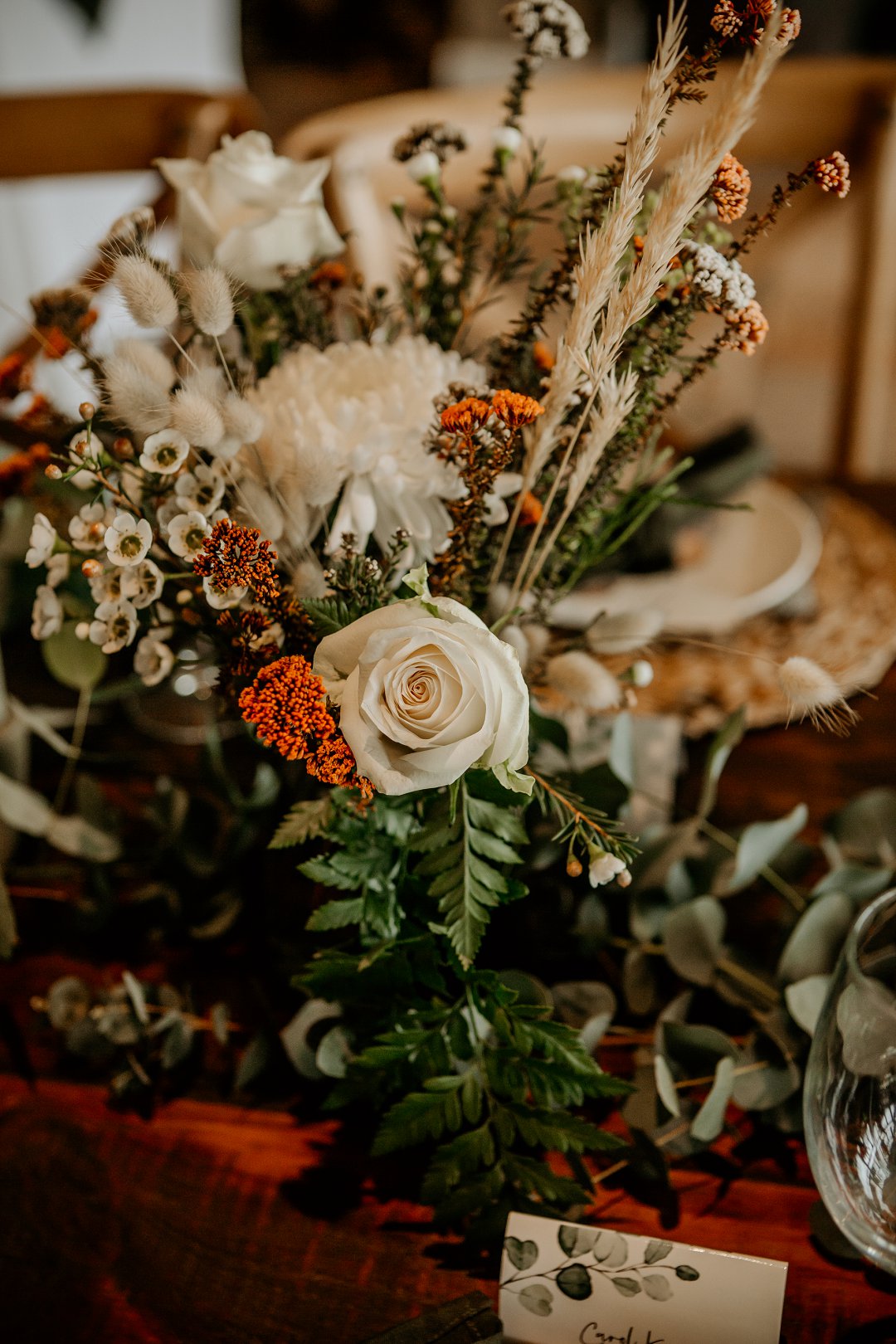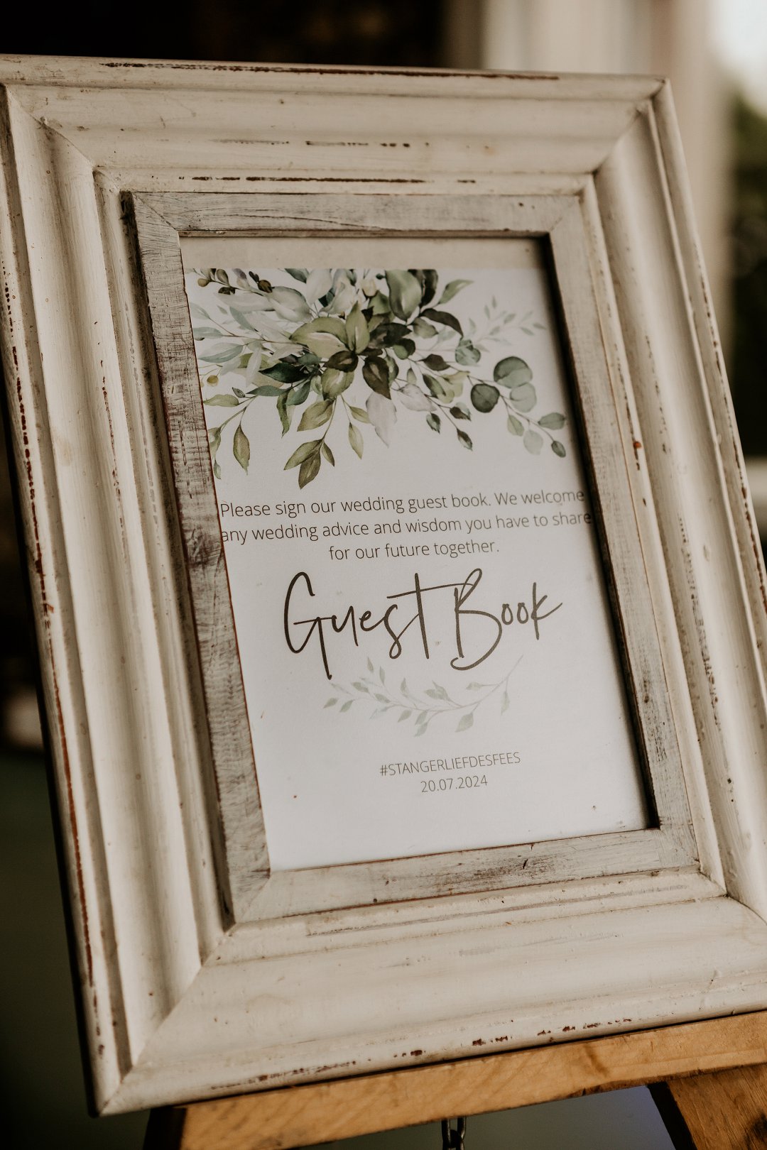 Ons kleurskema was ʼn kombinasie van wit en groen, met ʼn speelse tikkie oranje om ʼn vrolike en helder aksent te bied. Die dekor is eenvoudig gehou om die venue se natuurlike skoonheid te komplementeer. Ons het tafels versier met vars loof, terwyl Carla se ouma liefdevol blomrangskikkings gedoen het vir elke tafel. Olyfgroen waterglase, kershouers, kerse en -lapservette het die gewenste gevoel afgerond, terwyl elke gas ʼn persoonlike skets van hulle as geskenk op hul bord ontvang het.