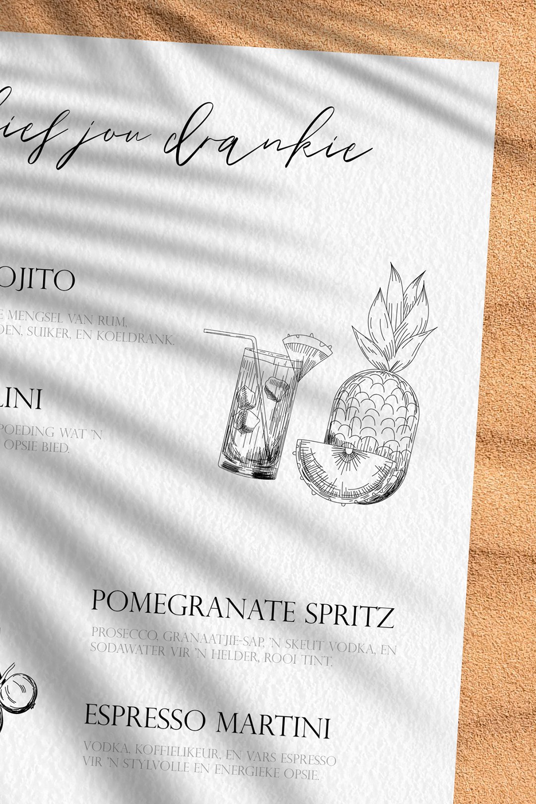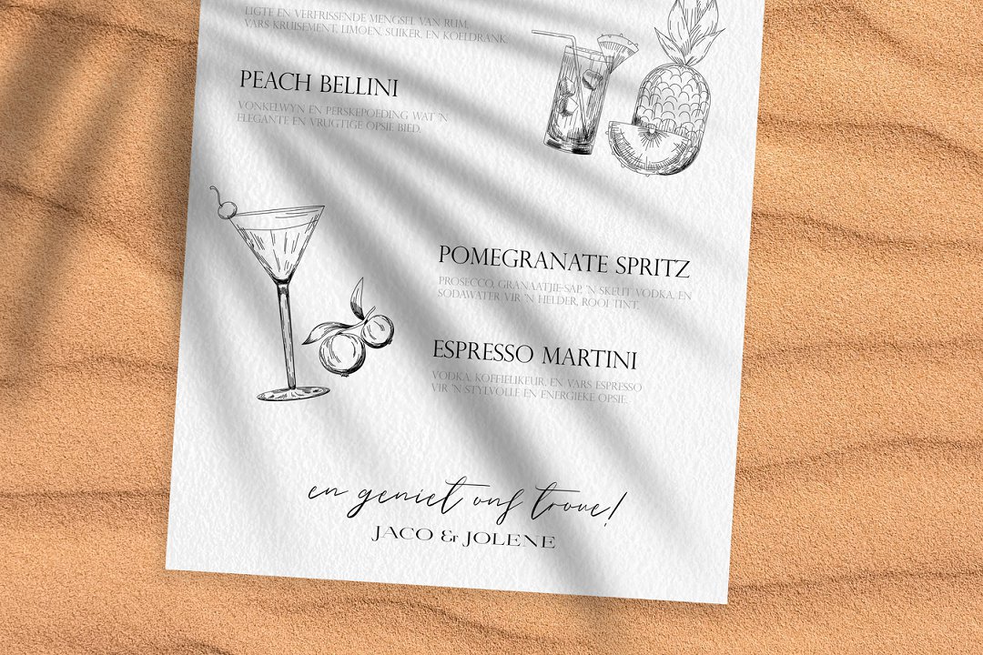 Die fyn illustrasies van die drankies gee ʼn prettige, maar stylvolle en elegante voorkoms aan die skemerkelkie spyskaart. Dit maak die spyskaart nie net interessant nie, maar ook visueel aantreklik. Julle kan jul trou-skryfbehoefte-ontwerper vra om pragtige illustrasies van spesifieke drankies en hul bestanddele te skep. Dit gee ʼn kreatiewe en opvallende voorkoms.