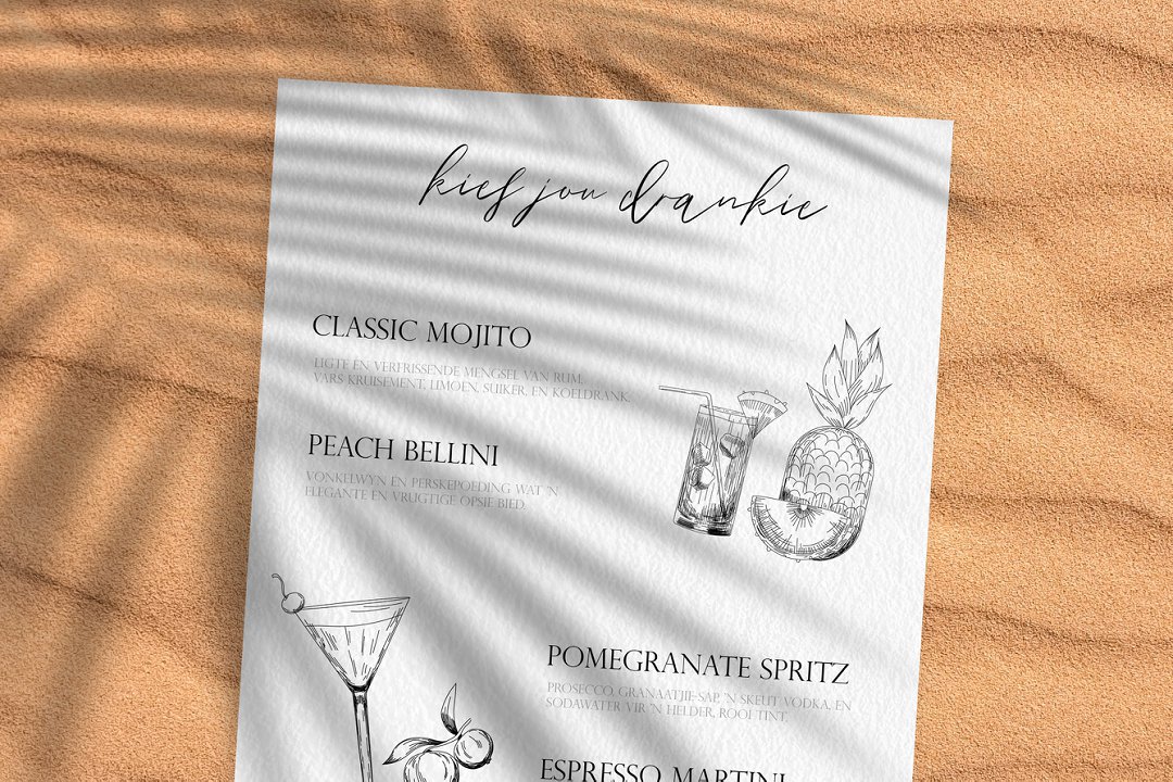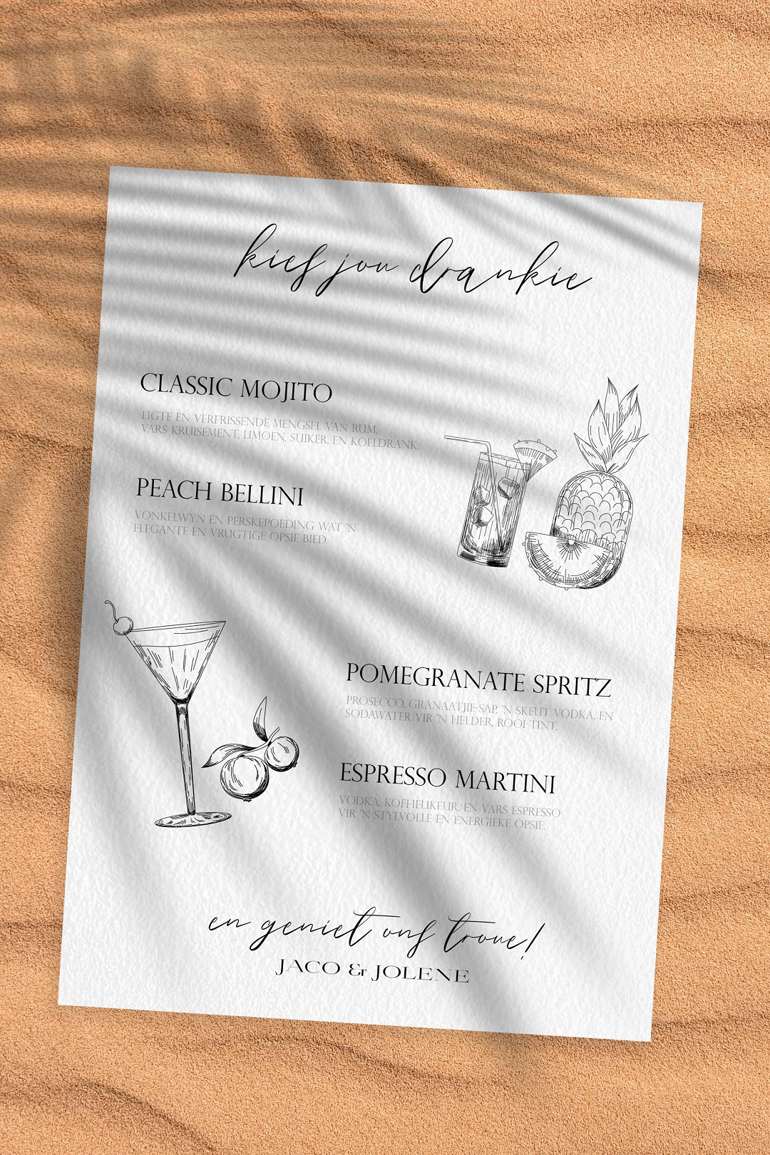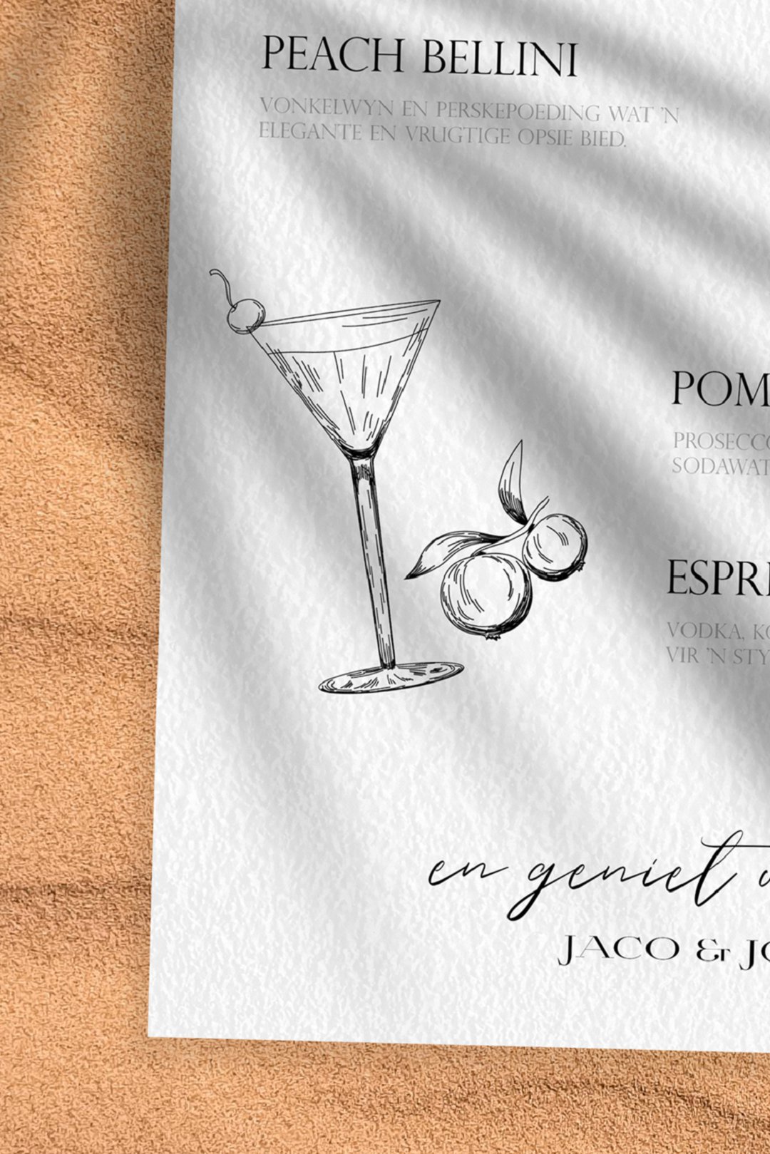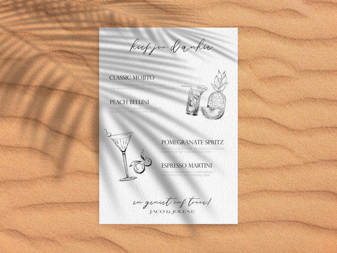 Hierdie stylvolle skemerkelkie spyskaart vir troues is ʼn fantastiese manier om gaste se aandag te trek na julle drankie-stasie. Dit is altyd slim om ʼn spyskaart met beskikbare drankies te hê, veral tydens die paartjie se fotosessie. Gaste is dikwels op soek na ʼn verfrissende drankie terwyl hulle gesels. Drankie-opsies kan ook nie-alkoholies wees en steeds pret en lekker wees.