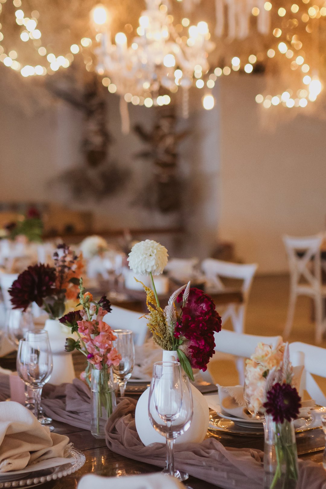 Die dekor was eenvoudig en tydloos – niks oordadig nie, maar tog vol betekenis. Ons het geput uit die Karoo se natuurlike skoonheid en die dekor het die rustigheid en elegansie van die plaas omgewing weerspieël. Ek is mal oor blomme, so ek het vir die Sauergroup gesê dat hulle enige en alle blomme wat by die kleurskema pas, mag gebruik. Ek het hulle heeltemal vertrou om die tafels met blomme te bedek en ek was nie teleurgestel nie. Die blomme het wonderlik gemeng met die stofpienk servette, wat pragtig saamgegaan het met die verskillende wit blompotte en die glas eetgerei op die rustieke houttafels. Daar was liggies op takke, groot kandelare in die saal en kerse op die tafels wat alles saam ʼn magiese en romantiese atmosfeer geskep het.