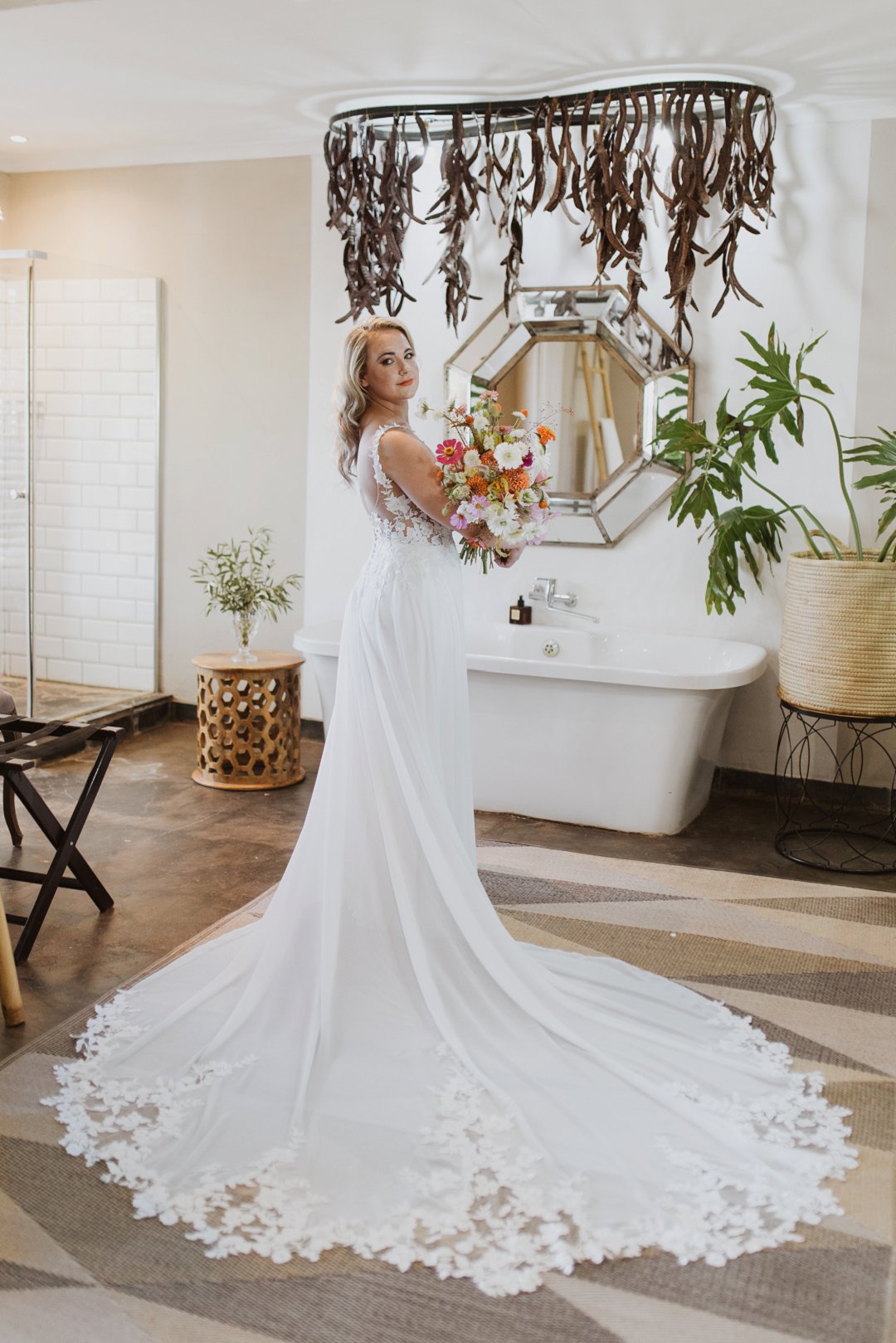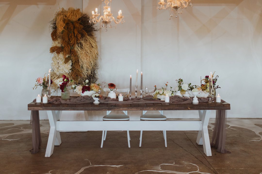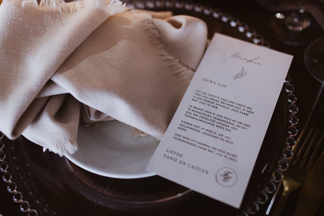Ons kleurskema het ʼn baie neutrale en natuurlike gevoel gehad, wat perfek by die Karoo se skoonheid pas. Kleure soos bruin, beige, stofpienk en pastelblou het die atmosfeer geverf. Dit het die warm, aardse skakerings van die omgewing aangevul en ʼn rustige, romantiese gevoel geskep. Ons het hierdie kleure gekies omdat dit die eenvoud van die Karoo se landskap weerspieël het, maar tog met ʼn bietjie sagte kleur en warmte.