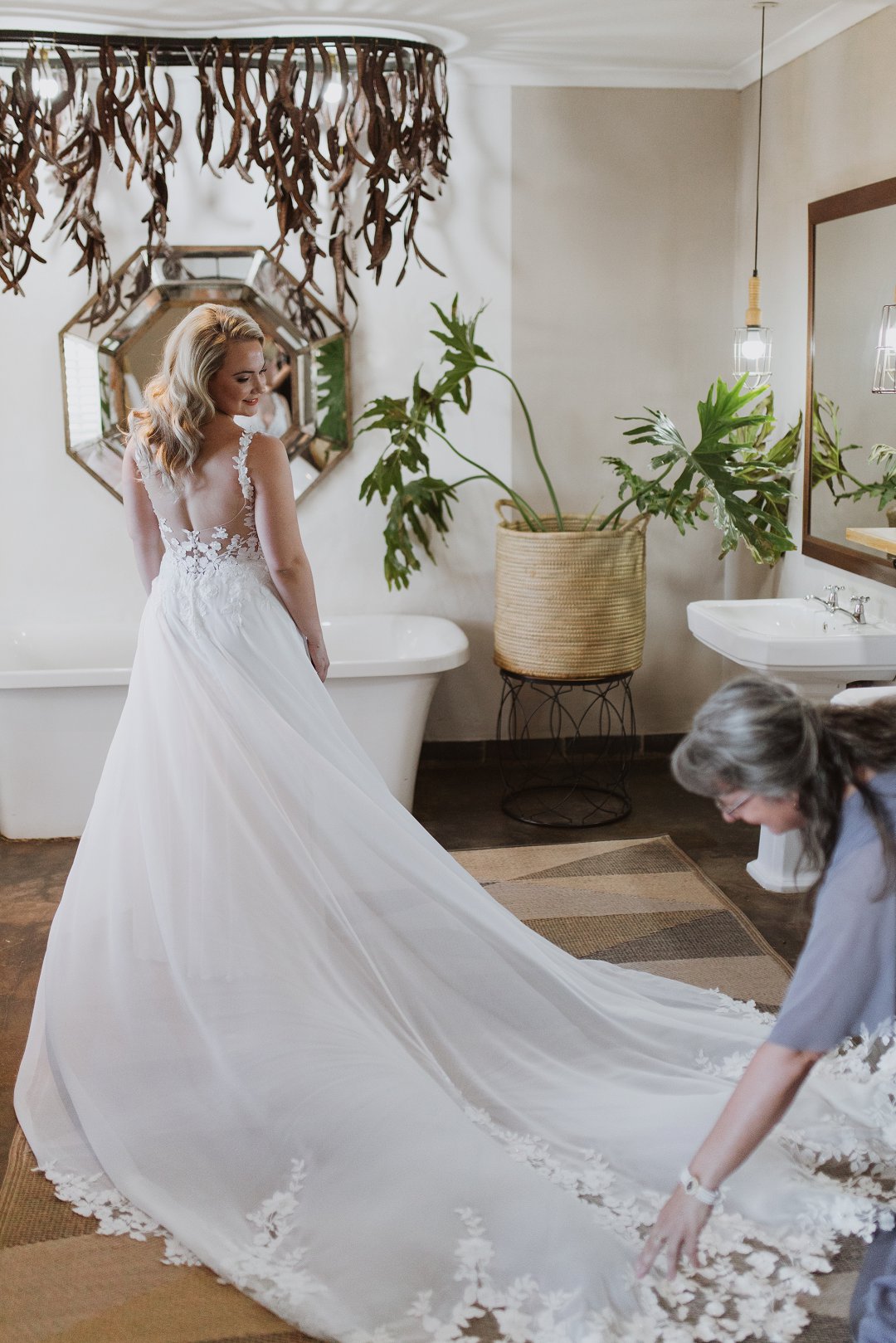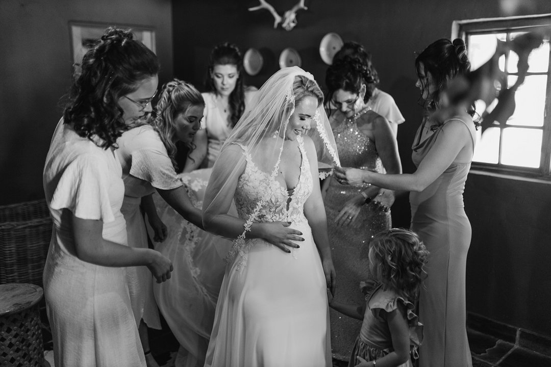 Omdat ek kort is, moes ons die rok effens inkort en om ʼn meer elegante en unieke styl te skep, het ons besluit om ander bandjies aan die rok te las. Amina was die ideale keuse en het alles wat ek van ʼn trourok gedroom het.