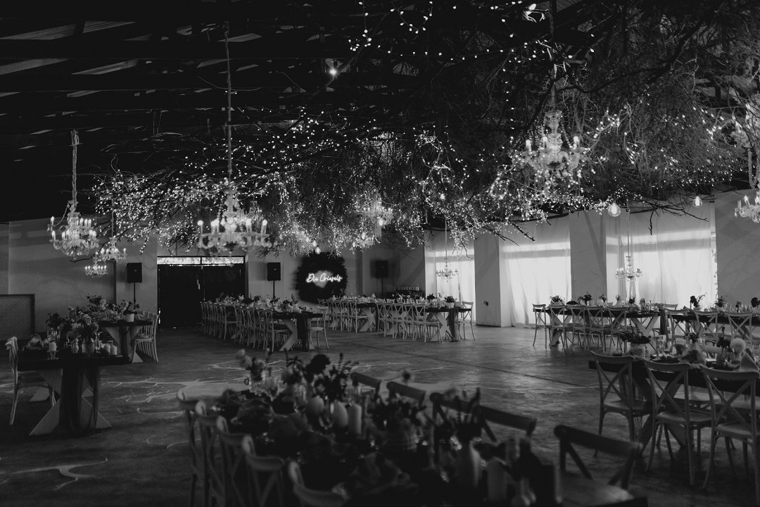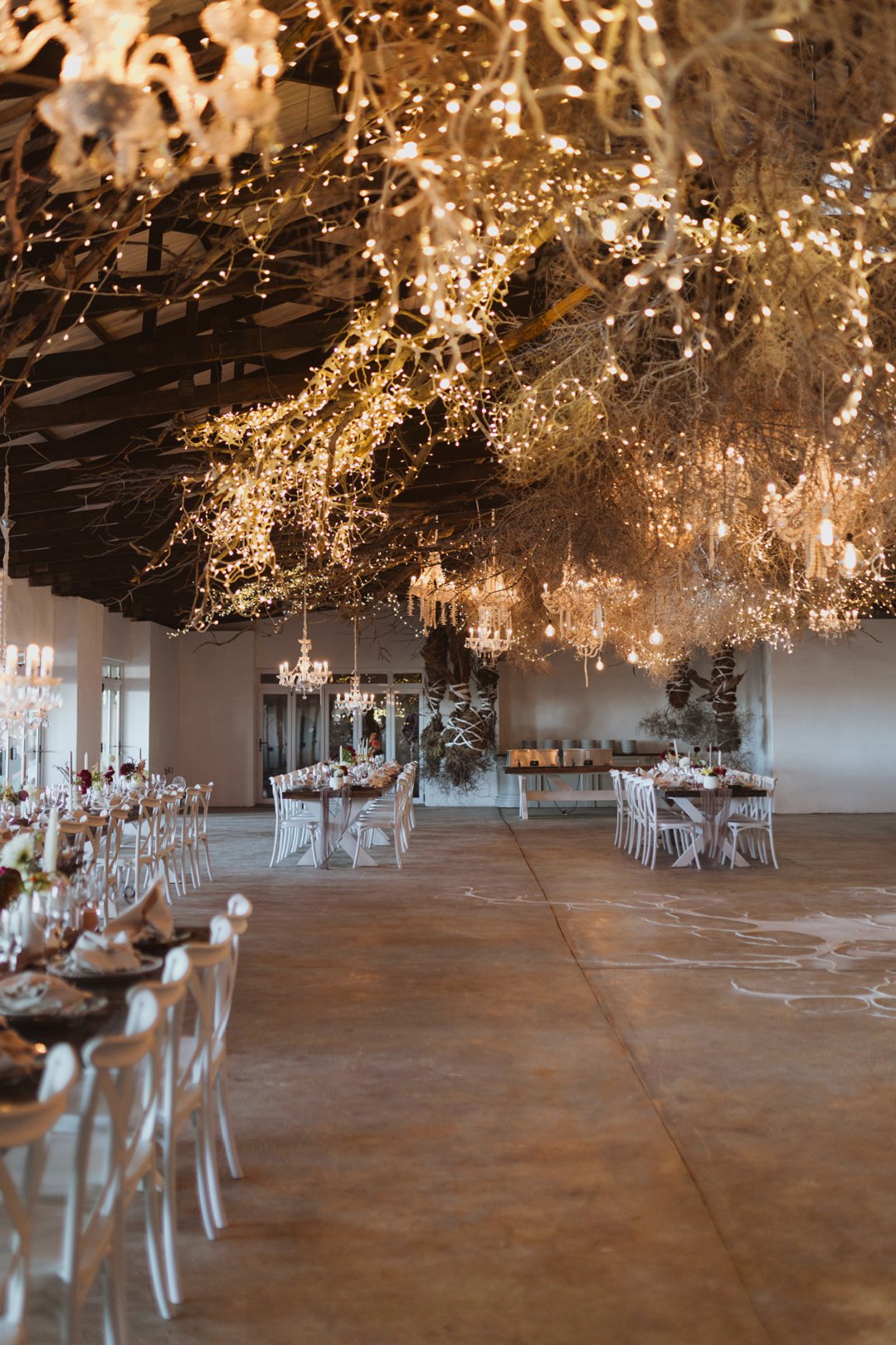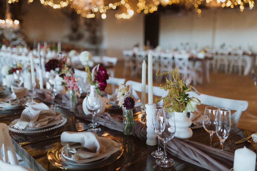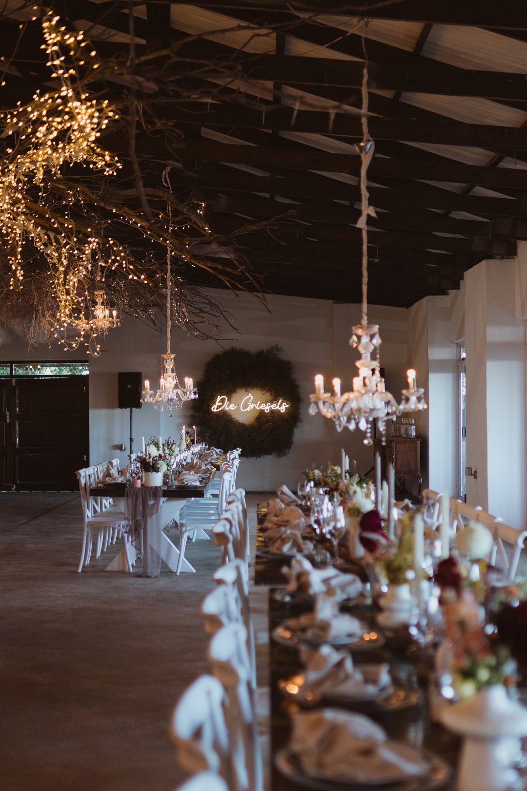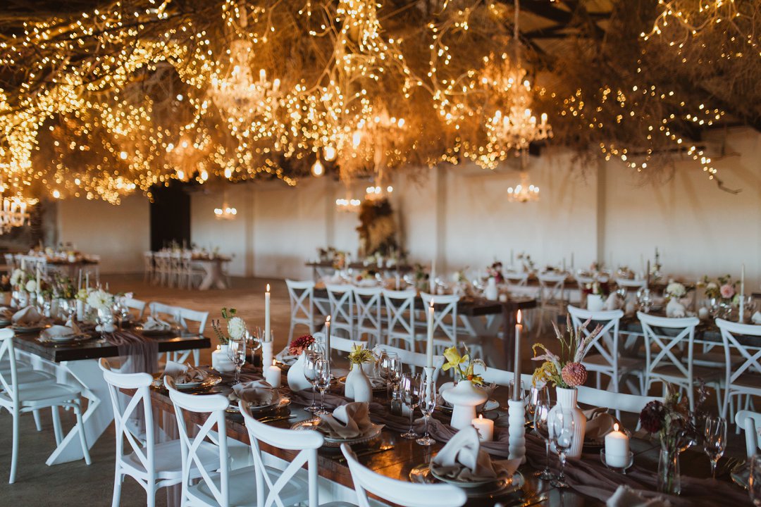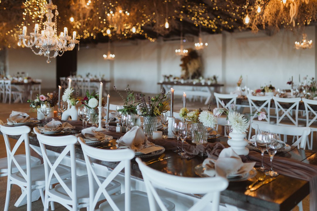 Die dekor was eenvoudig en tydloos – niks oordadig nie, maar tog vol betekenis. Ons het geput uit die Karoo se natuurlike skoonheid en die dekor het die rustigheid en elegansie van die plaas omgewing weerspieël. Ek is mal oor blomme, so ek het vir die Sauergroup gesê dat hulle enige en alle blomme wat by die kleurskema pas, mag gebruik. Ek het hulle heeltemal vertrou om die tafels met blomme te bedek en ek was nie teleurgestel nie. Die blomme het wonderlik gemeng met die stofpienk servette, wat pragtig saamgegaan het met die verskillende wit blompotte en die glas eetgerei op die rustieke houttafels. Daar was liggies op takke, groot kandelare in die saal en kerse op die tafels wat alles saam ʼn magiese en romantiese atmosfeer geskep het.