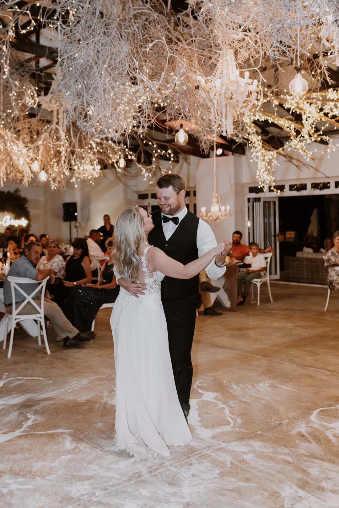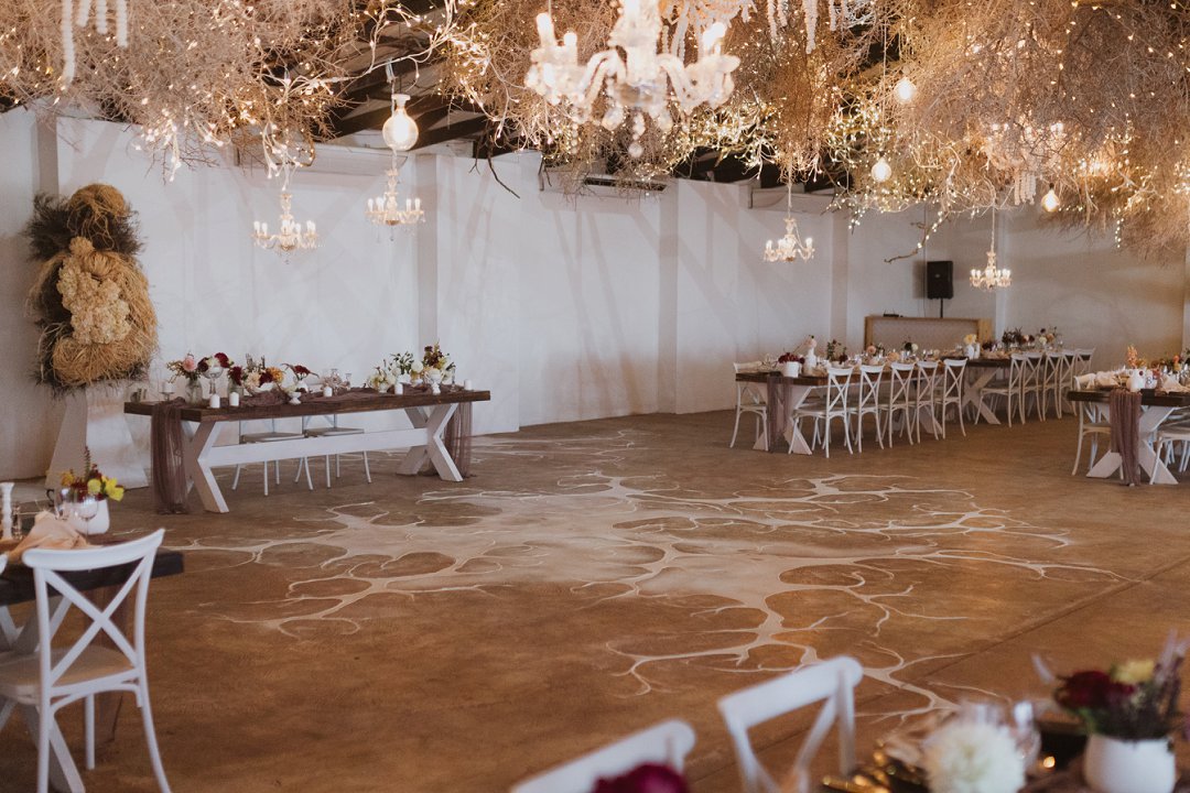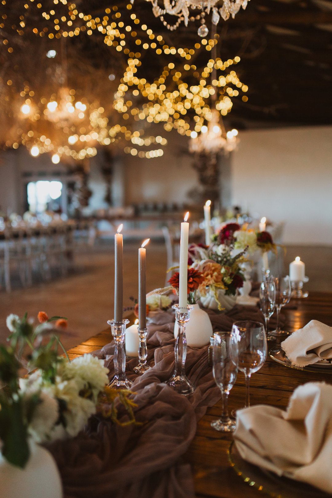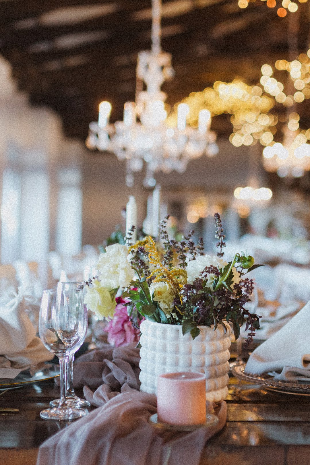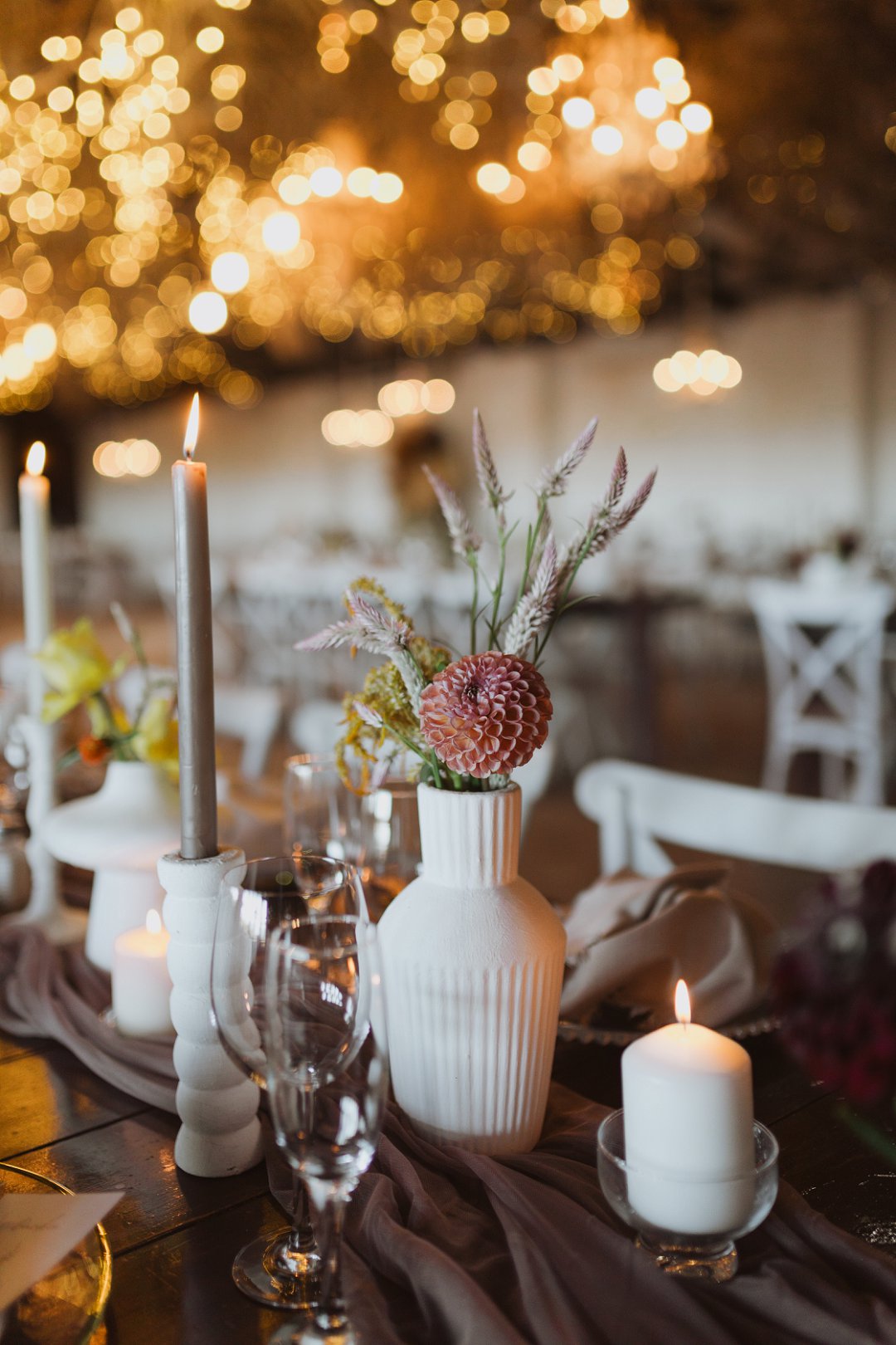 Die dekor was eenvoudig en tydloos – niks oordadig nie, maar tog vol betekenis. Ons het geput uit die Karoo se natuurlike skoonheid en die dekor het die rustigheid en elegansie van die plaas omgewing weerspieël. Ek is mal oor blomme, so ek het vir die Sauergroup gesê dat hulle enige en alle blomme wat by die kleurskema pas, mag gebruik. Ek het hulle heeltemal vertrou om die tafels met blomme te bedek en ek was nie teleurgestel nie. Die blomme het wonderlik gemeng met die stofpienk servette, wat pragtig saamgegaan het met die verskillende wit blompotte en die glas eetgerei op die rustieke houttafels. Daar was liggies op takke, groot kandelare in die saal en kerse op die tafels wat alles saam ʼn magiese en romantiese atmosfeer geskep het.