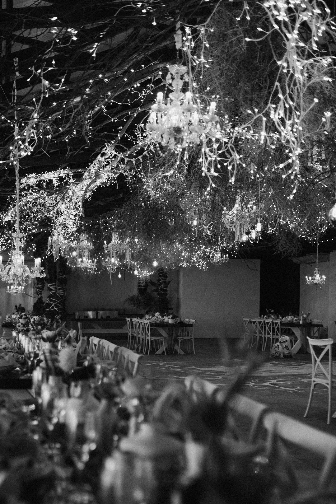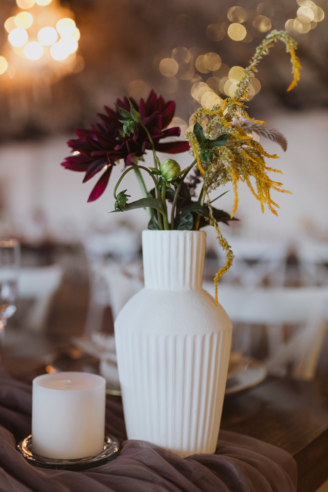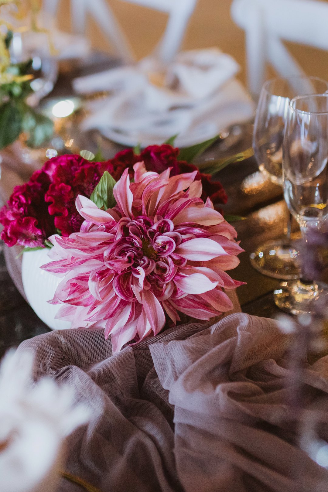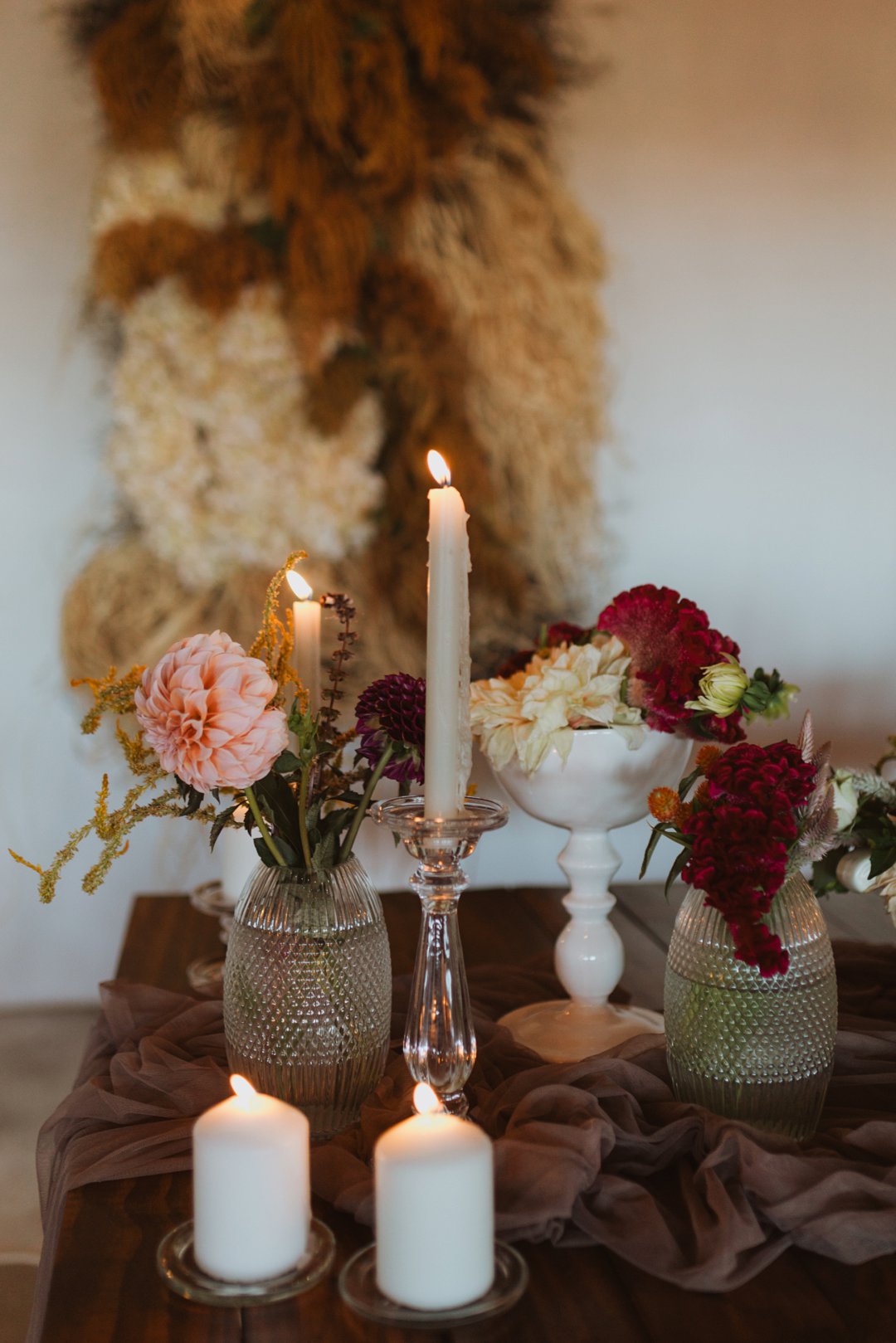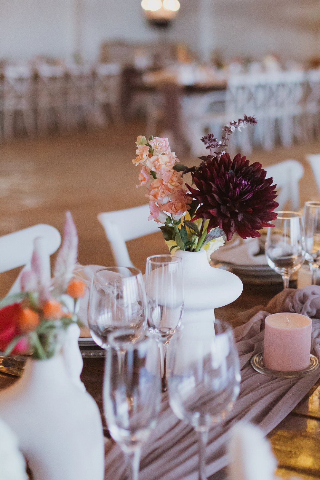 Die dekor was eenvoudig en tydloos – niks oordadig nie, maar tog vol betekenis. Ons het geput uit die Karoo se natuurlike skoonheid en die dekor het die rustigheid en elegansie van die plaas omgewing weerspieël. Ek is mal oor blomme, so ek het vir die Sauergroup gesê dat hulle enige en alle blomme wat by die kleurskema pas, mag gebruik. Ek het hulle heeltemal vertrou om die tafels met blomme te bedek en ek was nie teleurgestel nie. Die blomme het wonderlik gemeng met die stofpienk servette, wat pragtig saamgegaan het met die verskillende wit blompotte en die glas eetgerei op die rustieke houttafels. Daar was liggies op takke, groot kandelare in die saal en kerse op die tafels wat alles saam ʼn magiese en romantiese atmosfeer geskep het.