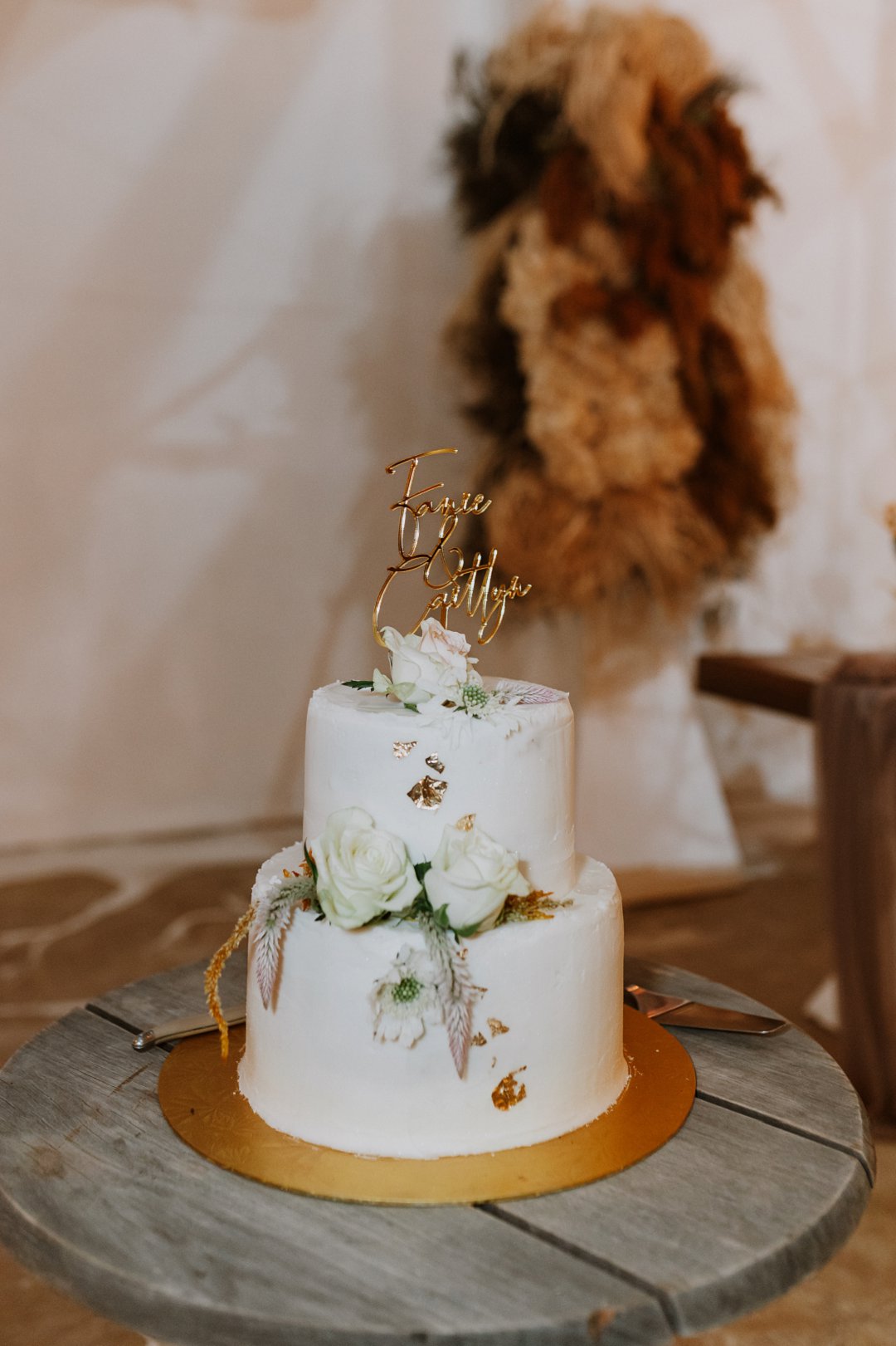 Hulle troukoek het twee lae gehad, versier met gladde, wit versiersel en sagte wit rose wat oor die rande gevloei het. Stukkies glinsterende goud en ʼn goue koektopper met die paartjie se name het ʼn tikkie weelde bygevoeg.