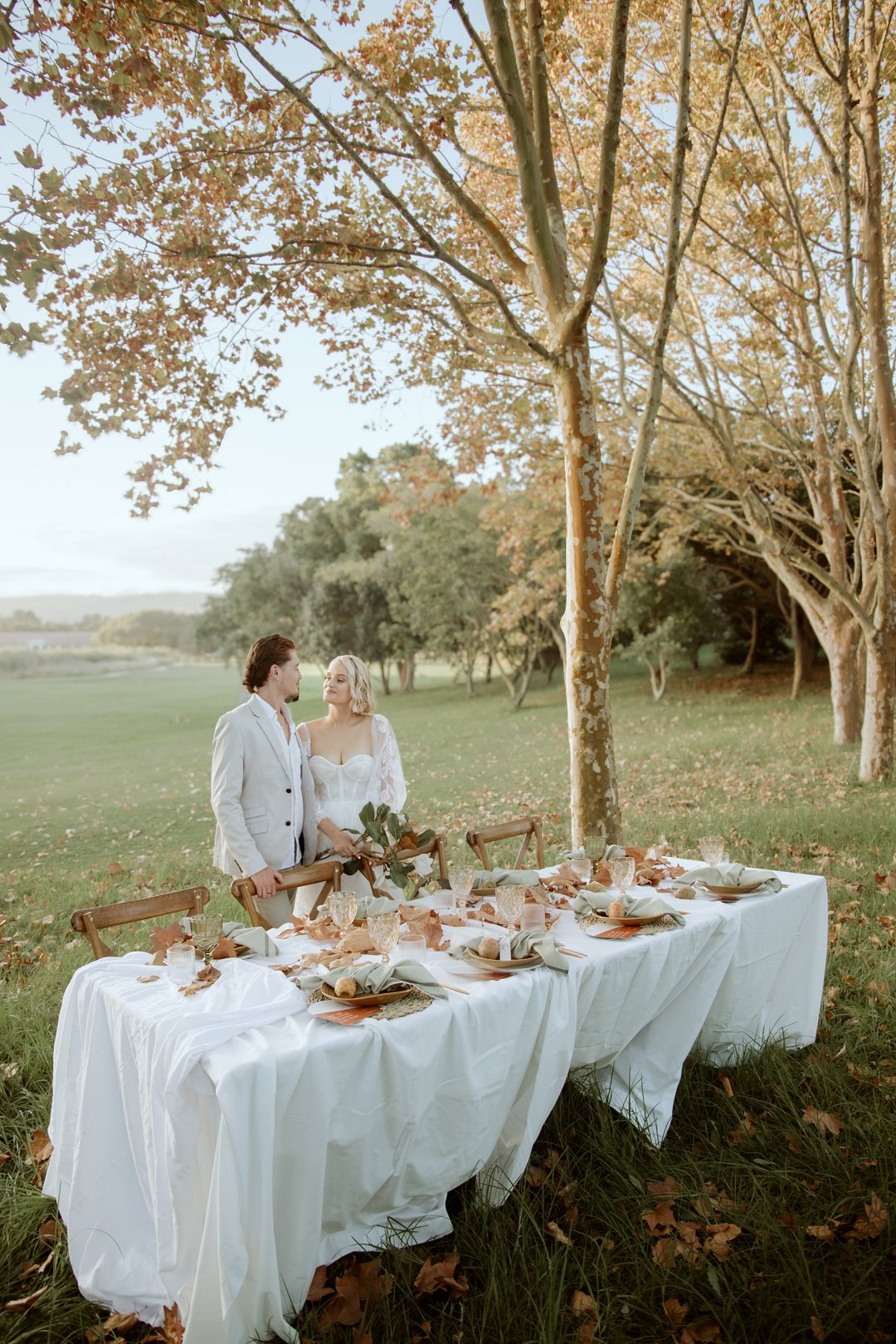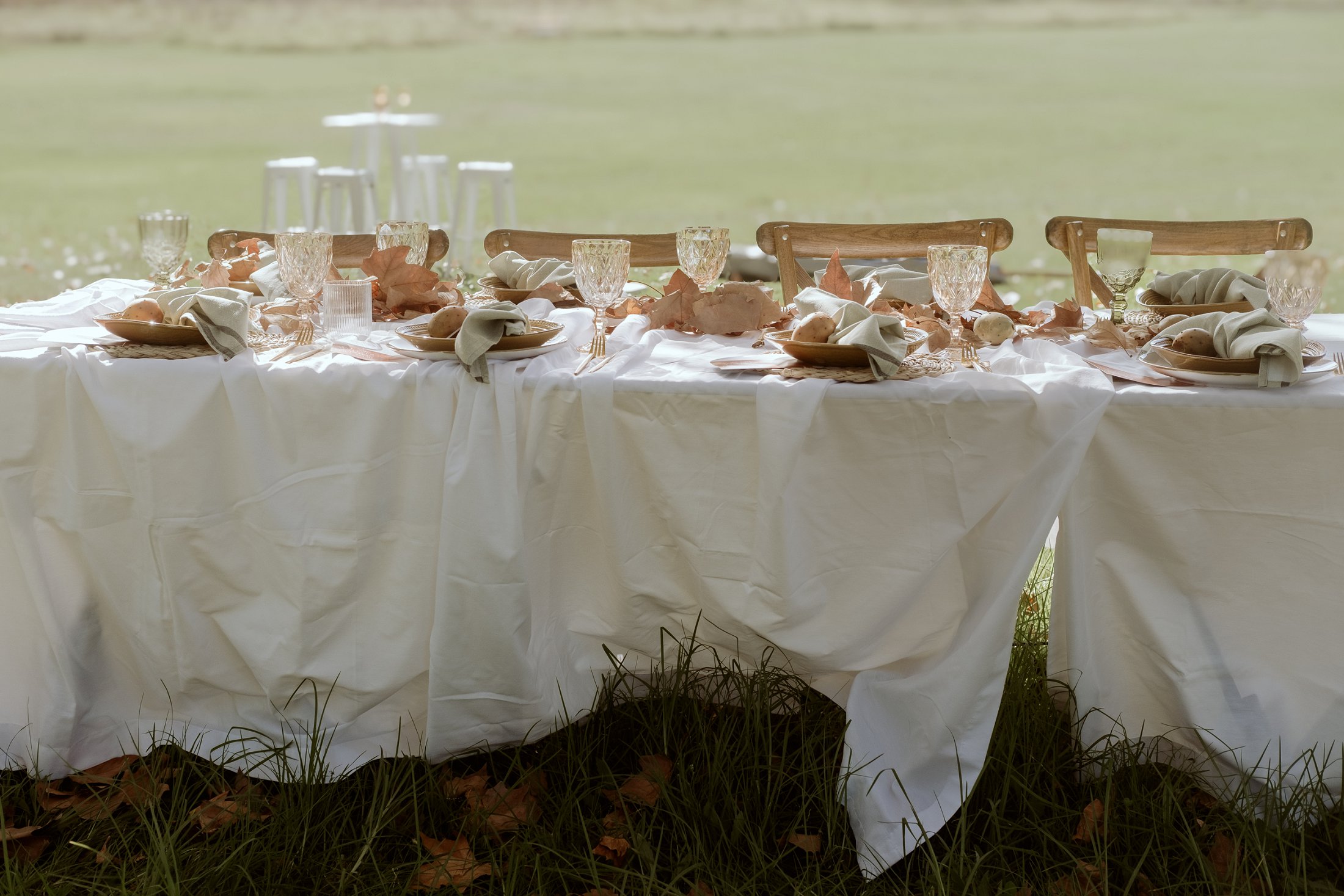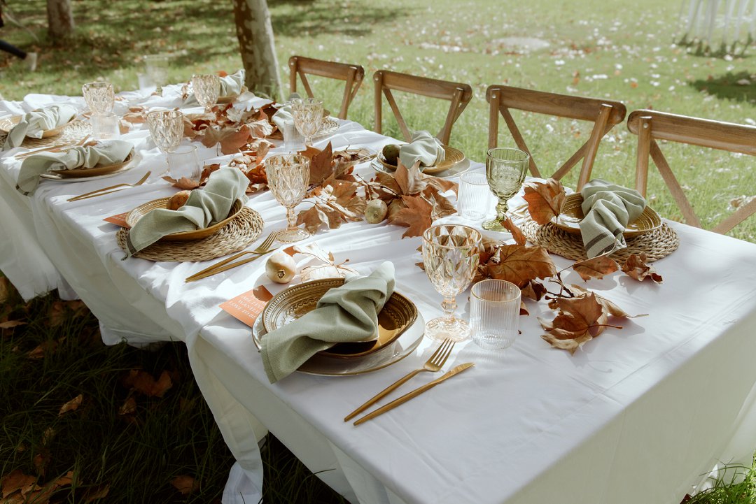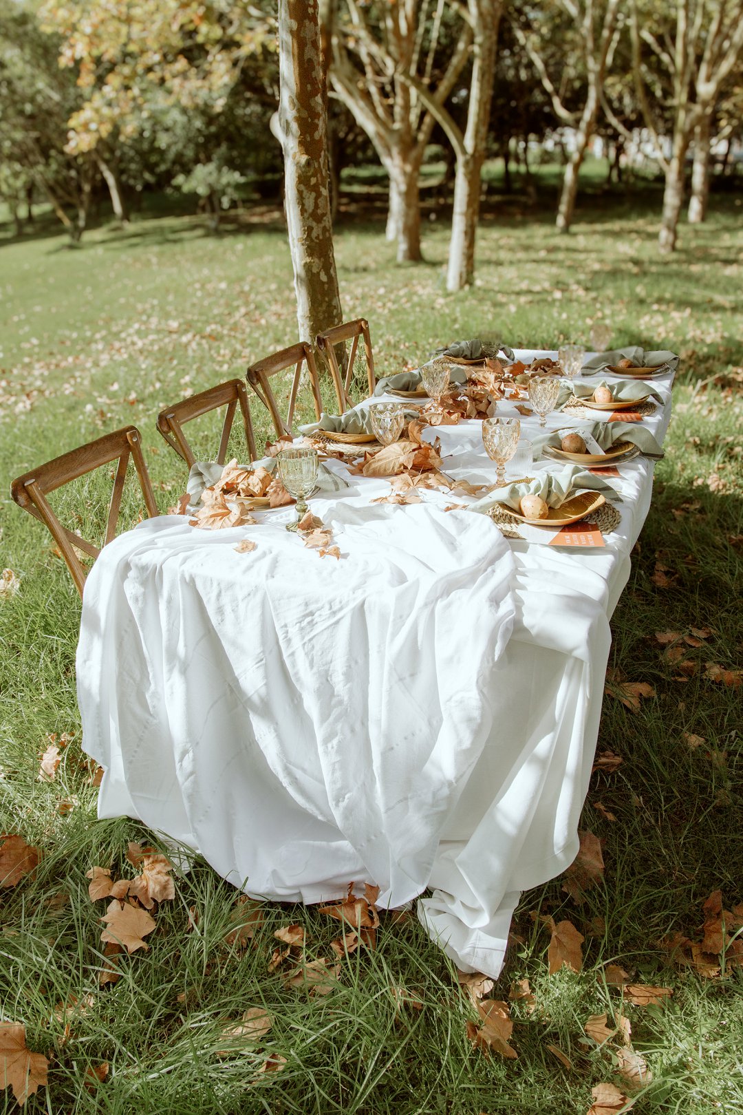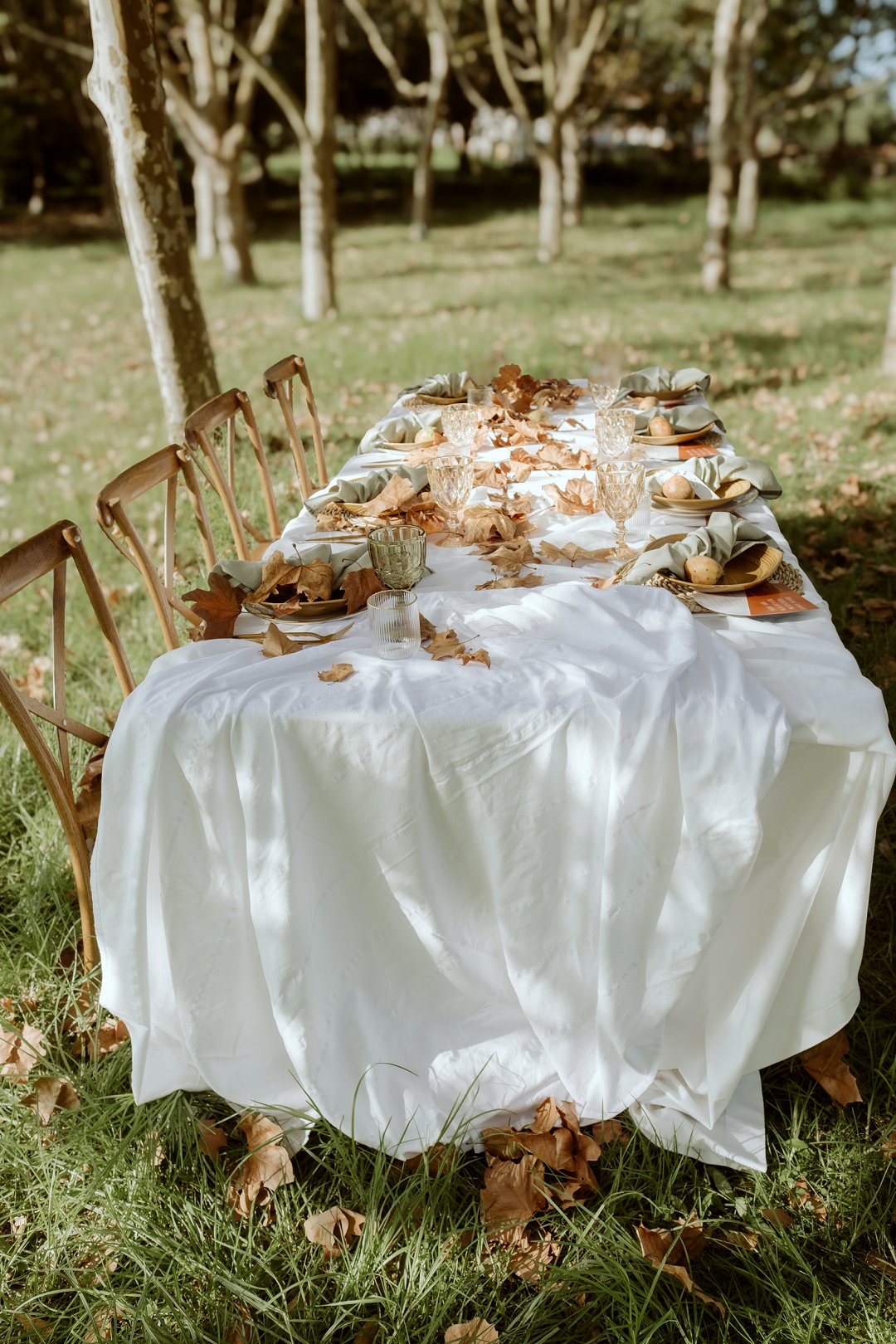 Die tafel is tussen bome gedek, omring deur bruin blare op die gras. ’n Wit tafeldoek het ’n elegante gevoel geskep. Die houtstoele het natuurlik by die sagte kleurskema ingepas. Elke detail het perfek bymekaar ingeskakel.