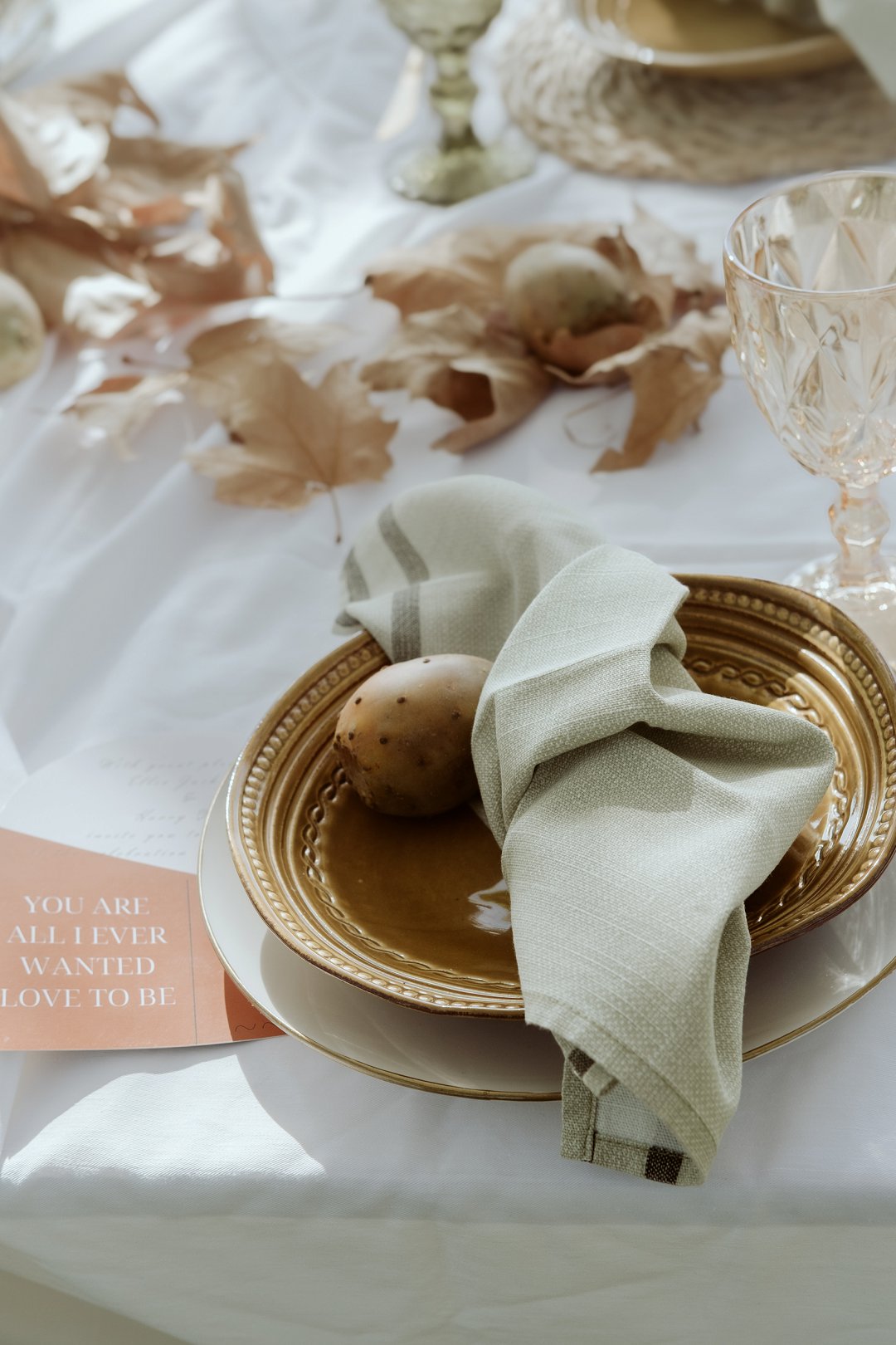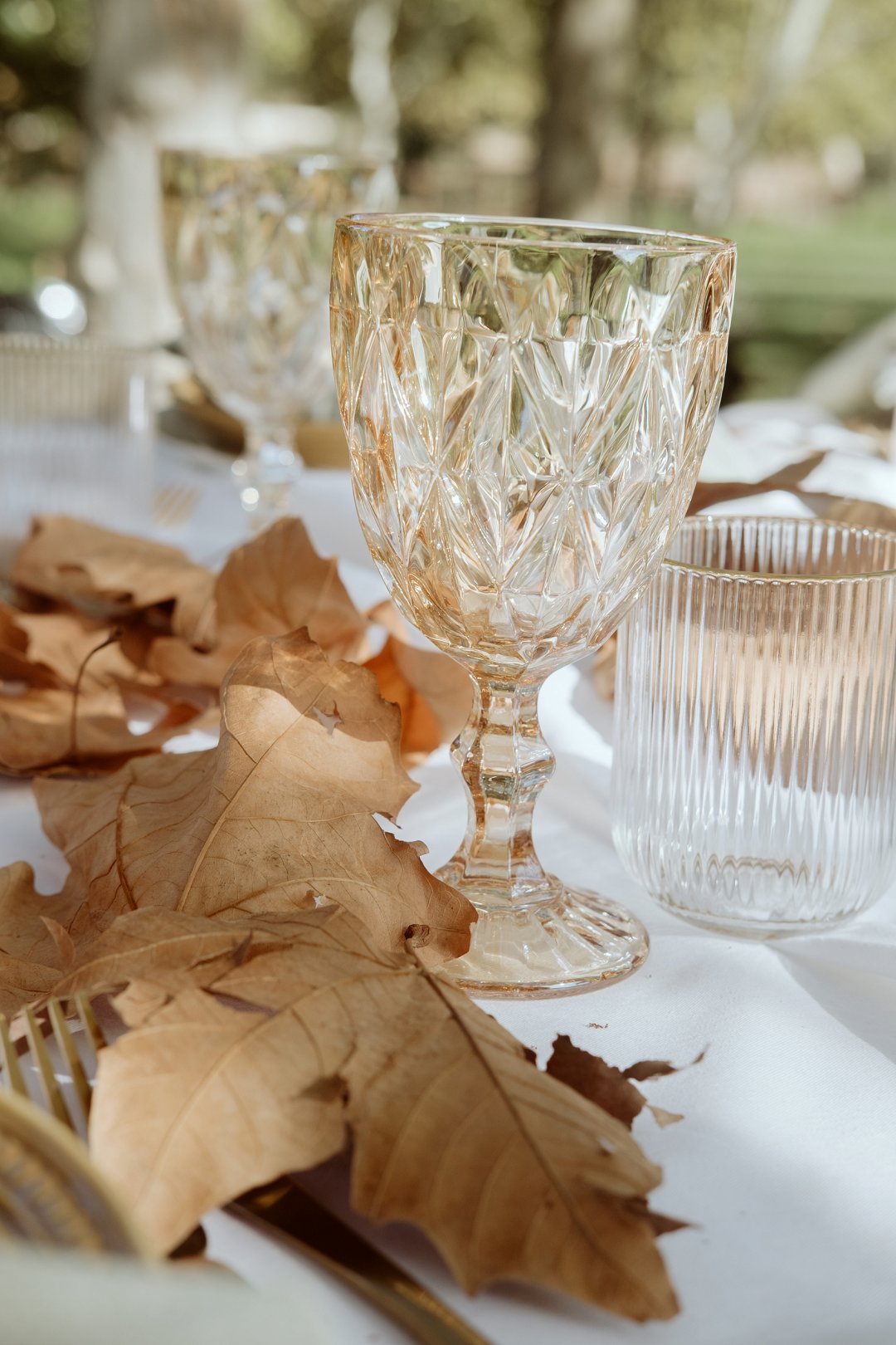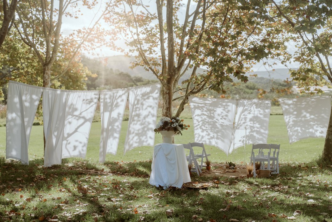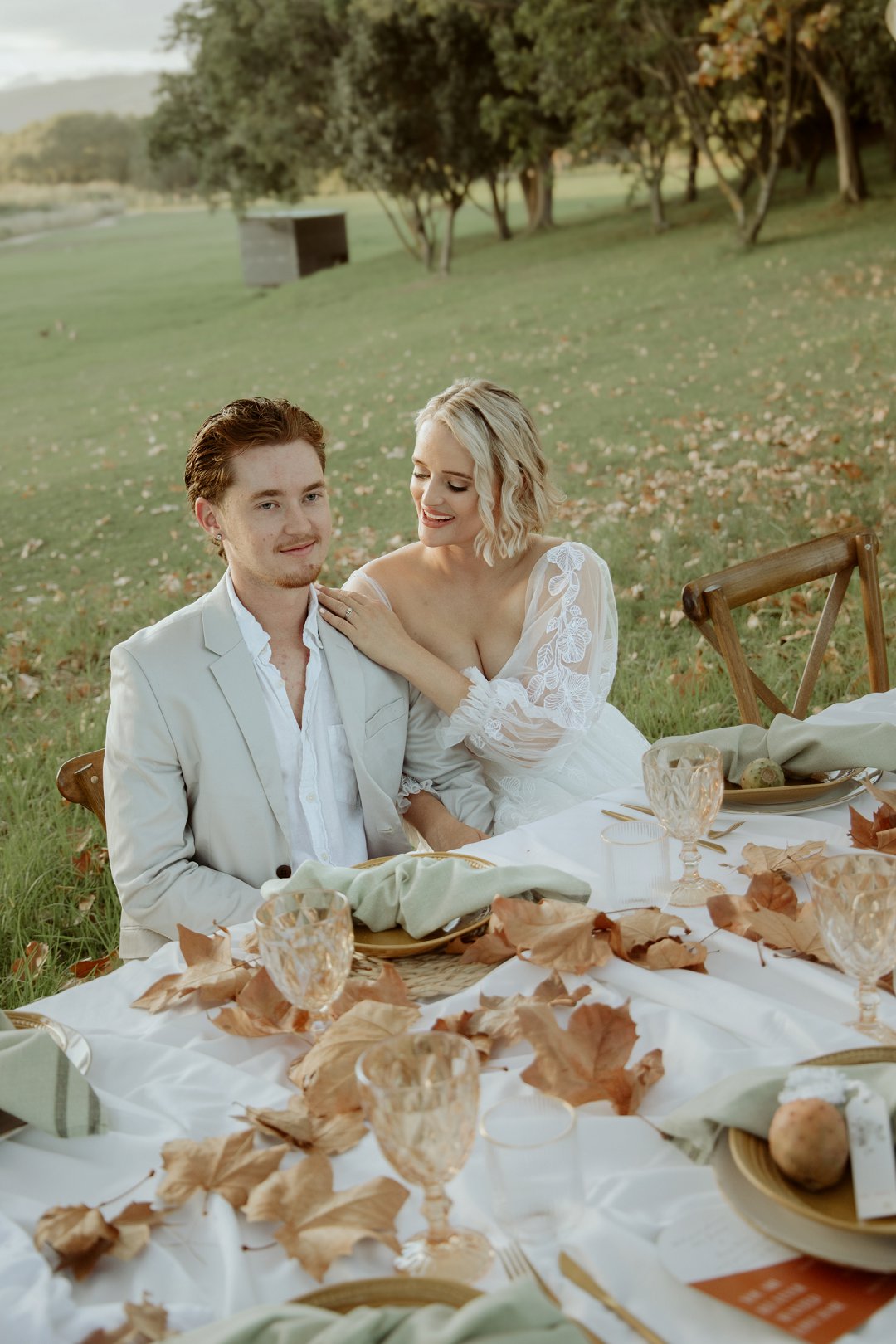 Die tafel is tussen bome gedek, omring deur bruin blare op die gras. ’n Wit tafeldoek het ’n elegante gevoel geskep. Die houtstoele het natuurlik by die sagte kleurskema ingepas. Elke detail het perfek bymekaar ingeskakel.
