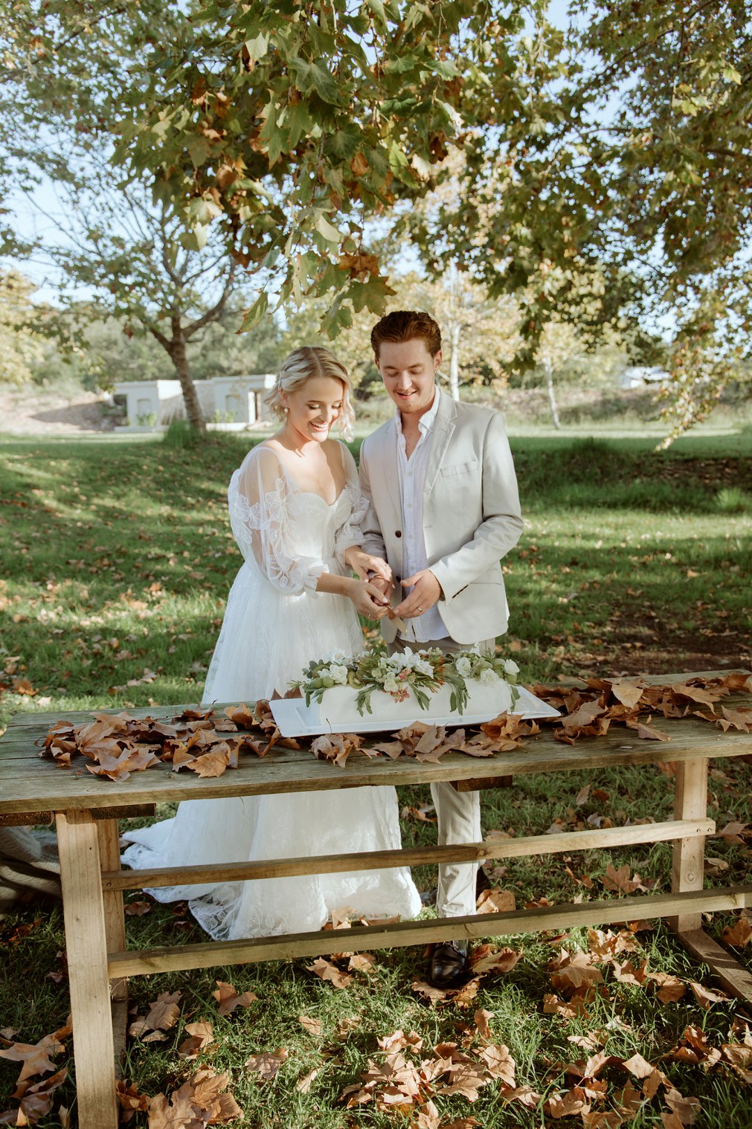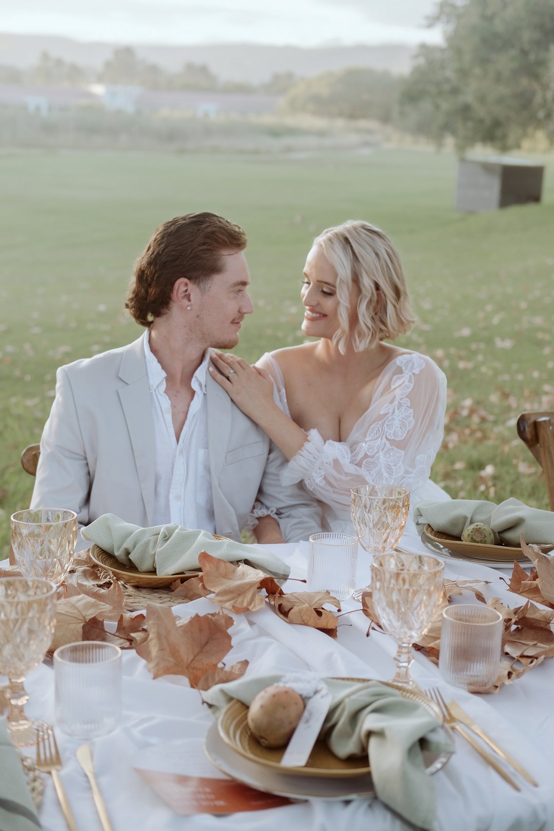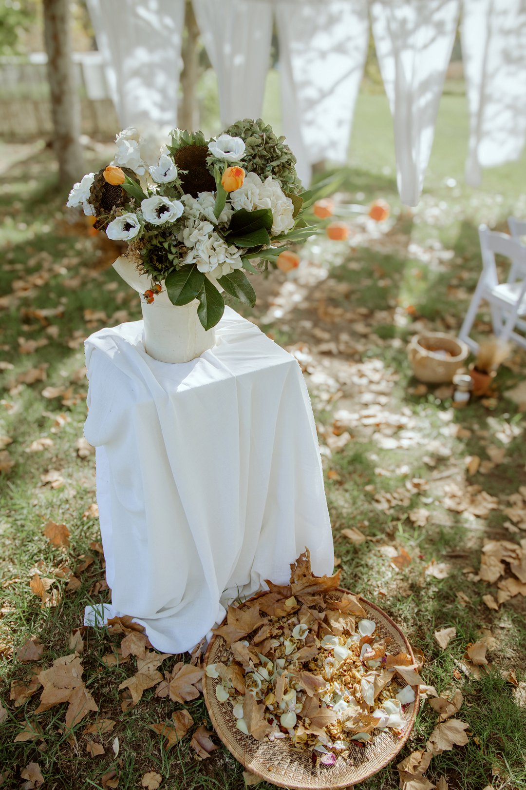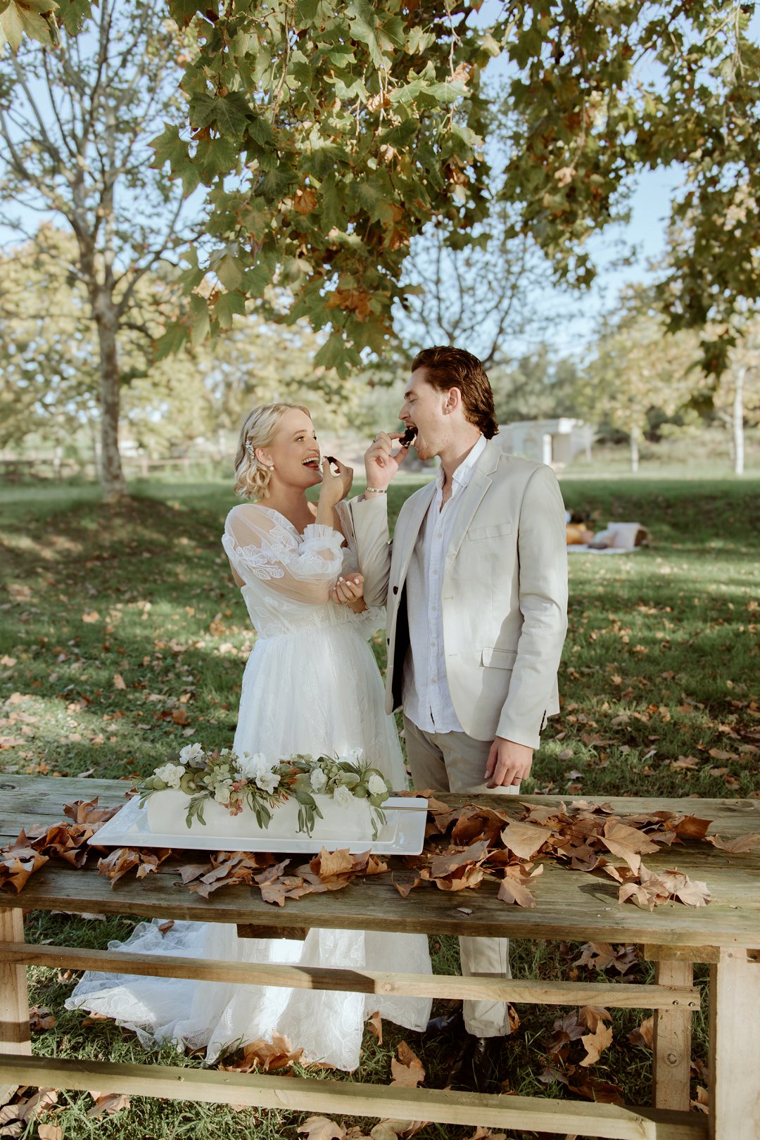 Die tafel is tussen bome gedek, omring deur bruin blare op die gras. ’n Wit tafeldoek het ’n elegante gevoel geskep. Die houtstoele het natuurlik by die sagte kleurskema ingepas. Elke detail het perfek bymekaar ingeskakel.