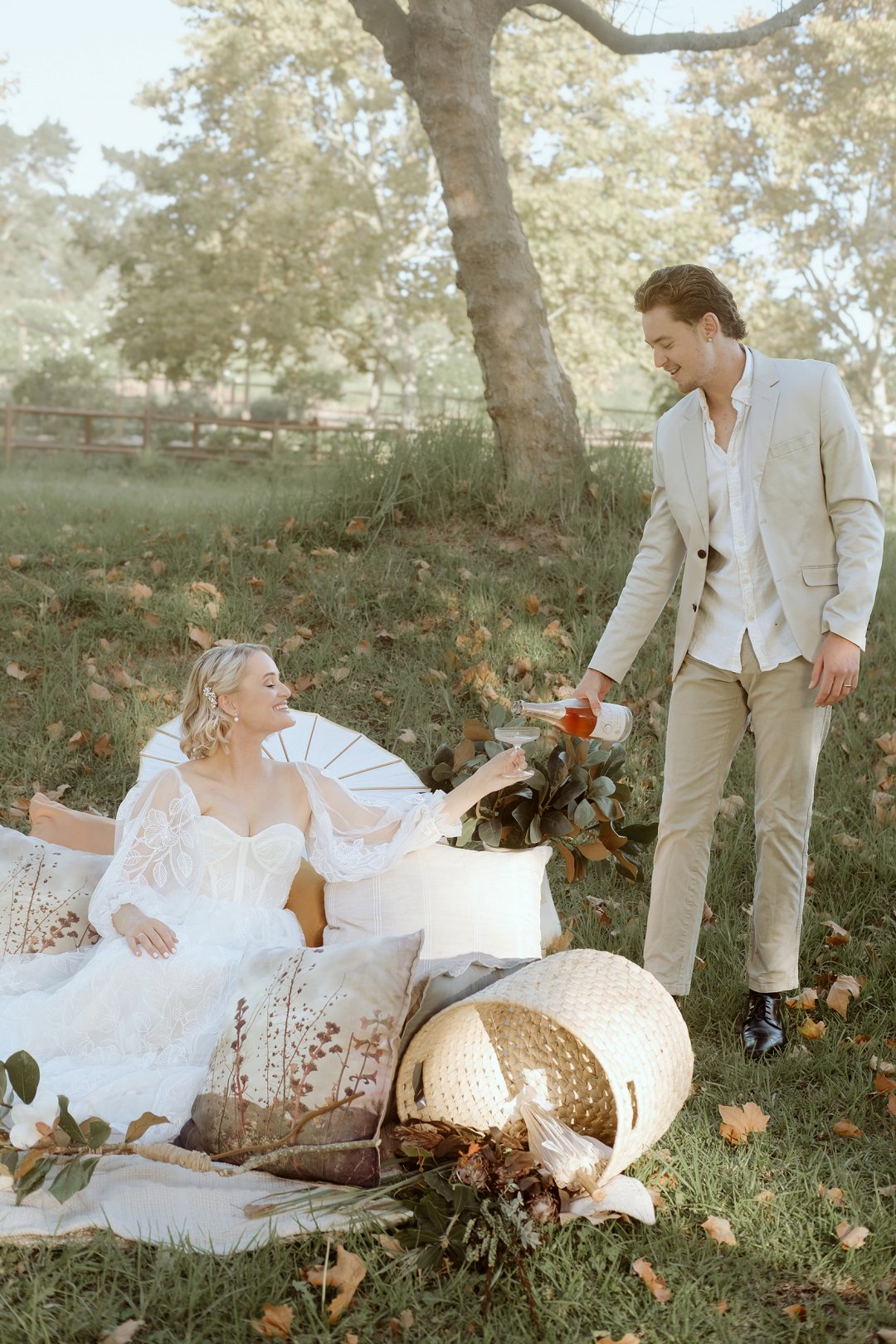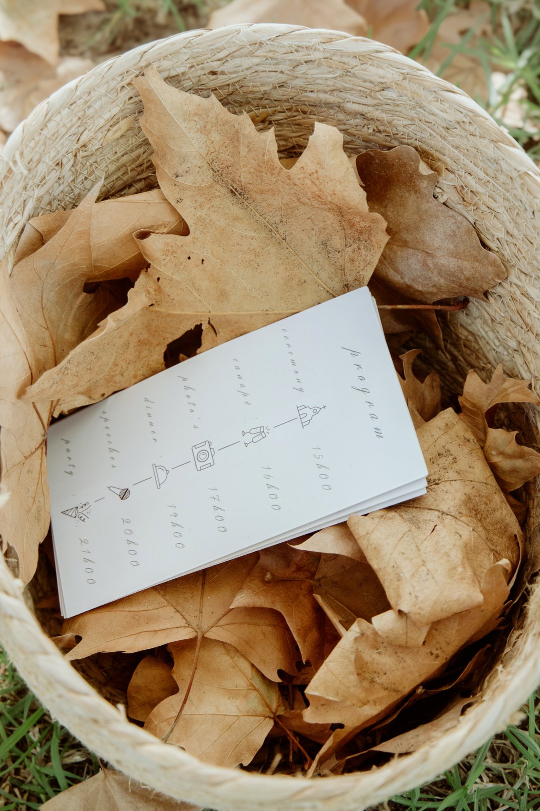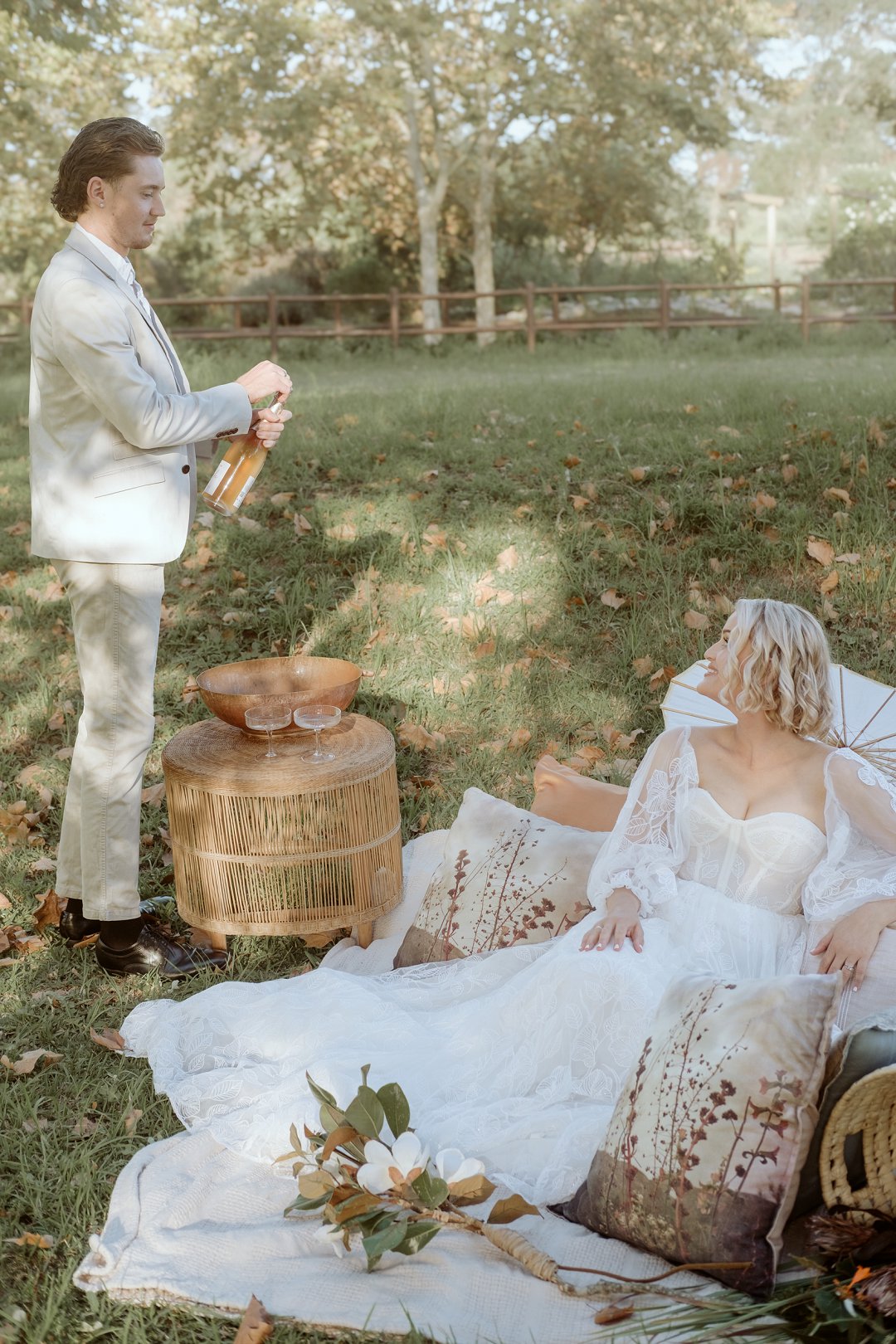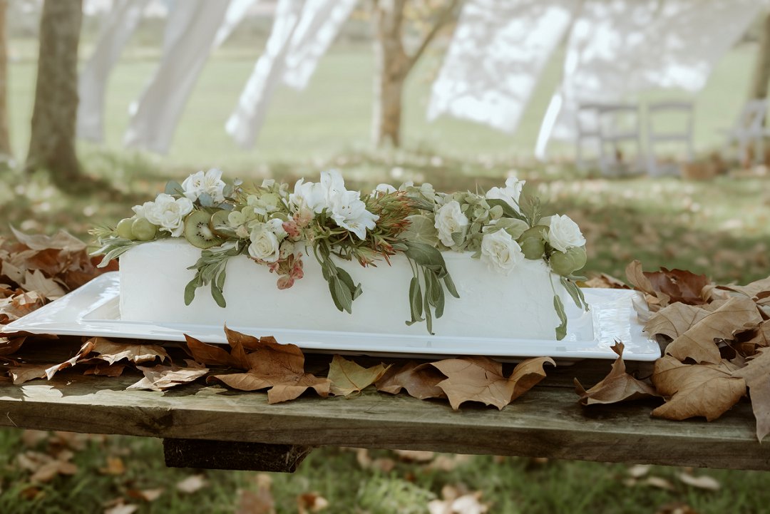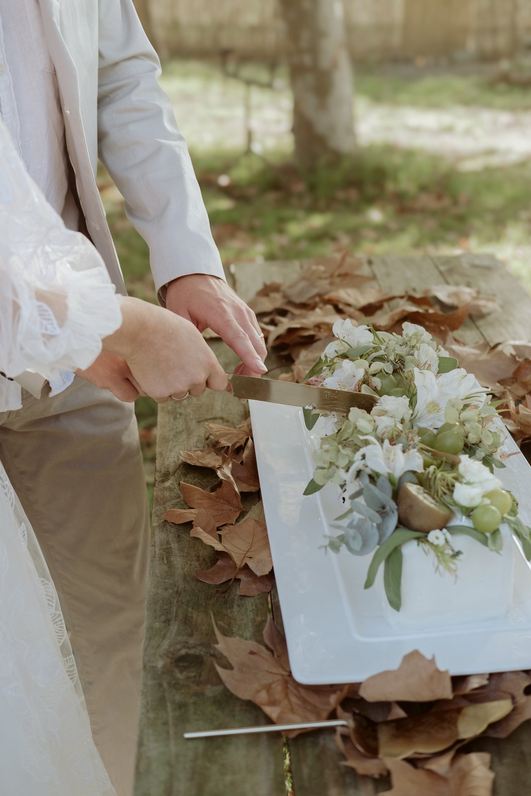 Die tafel is tussen bome gedek, omring deur bruin blare op die gras. ’n Wit tafeldoek het ’n elegante gevoel geskep. Die houtstoele het natuurlik by die sagte kleurskema ingepas. Elke detail het perfek bymekaar ingeskakel.