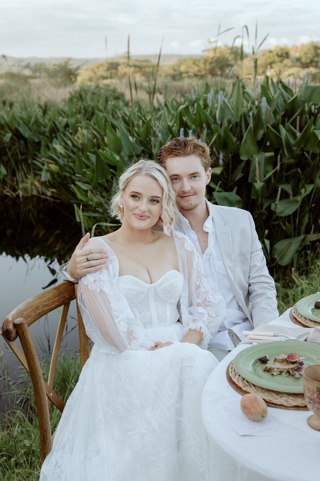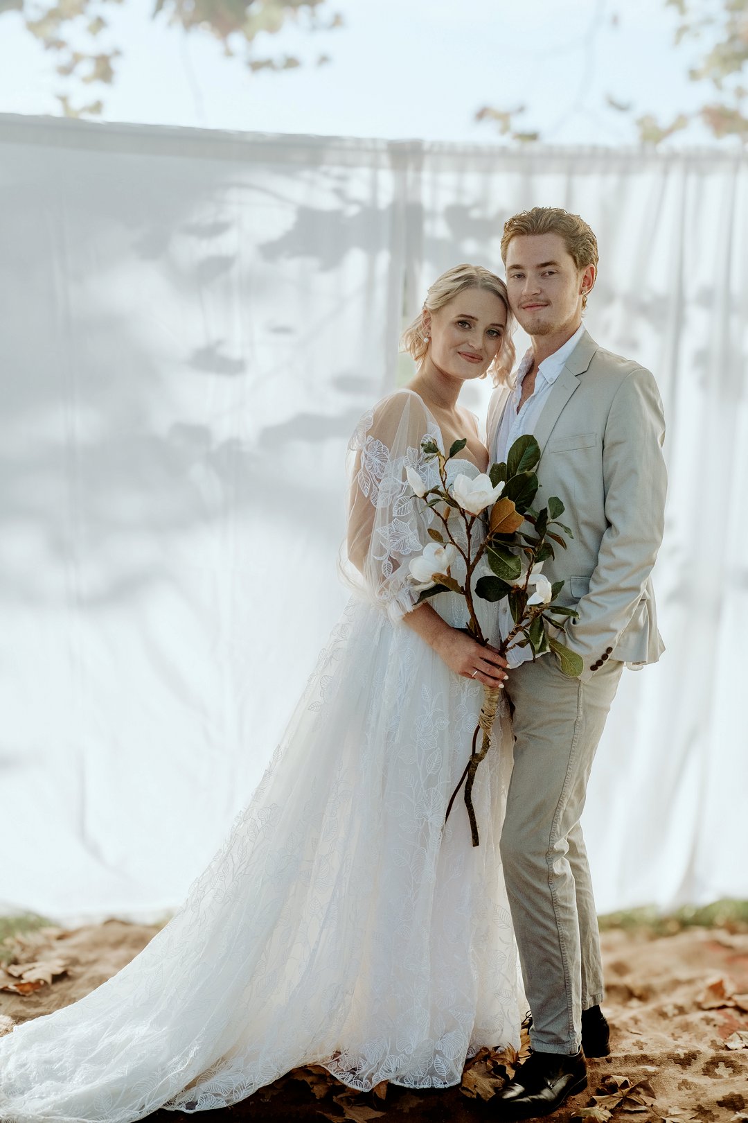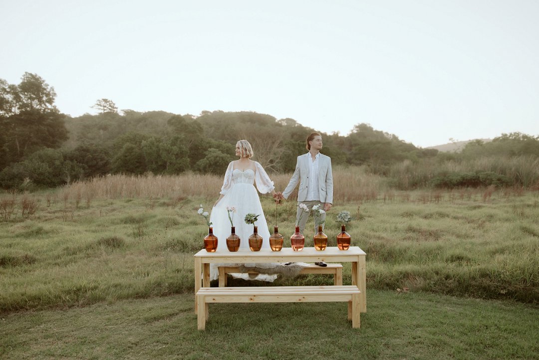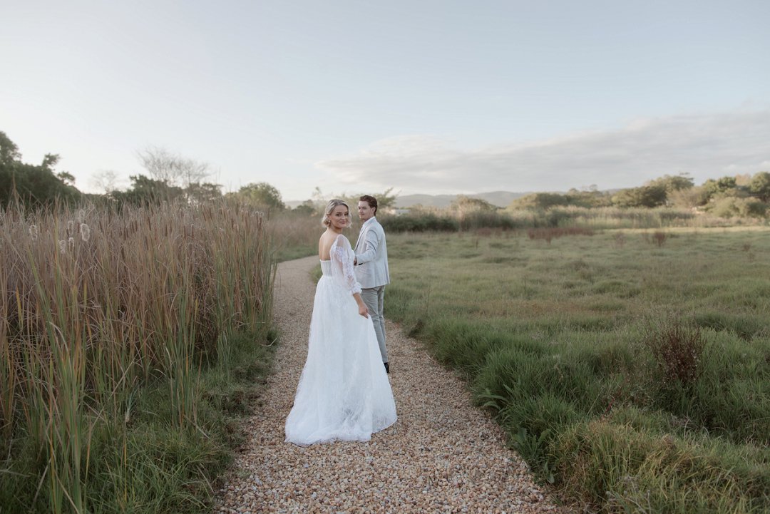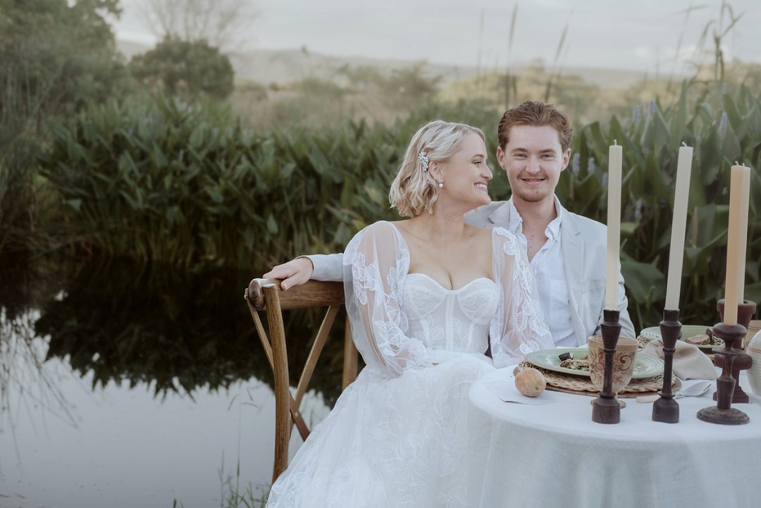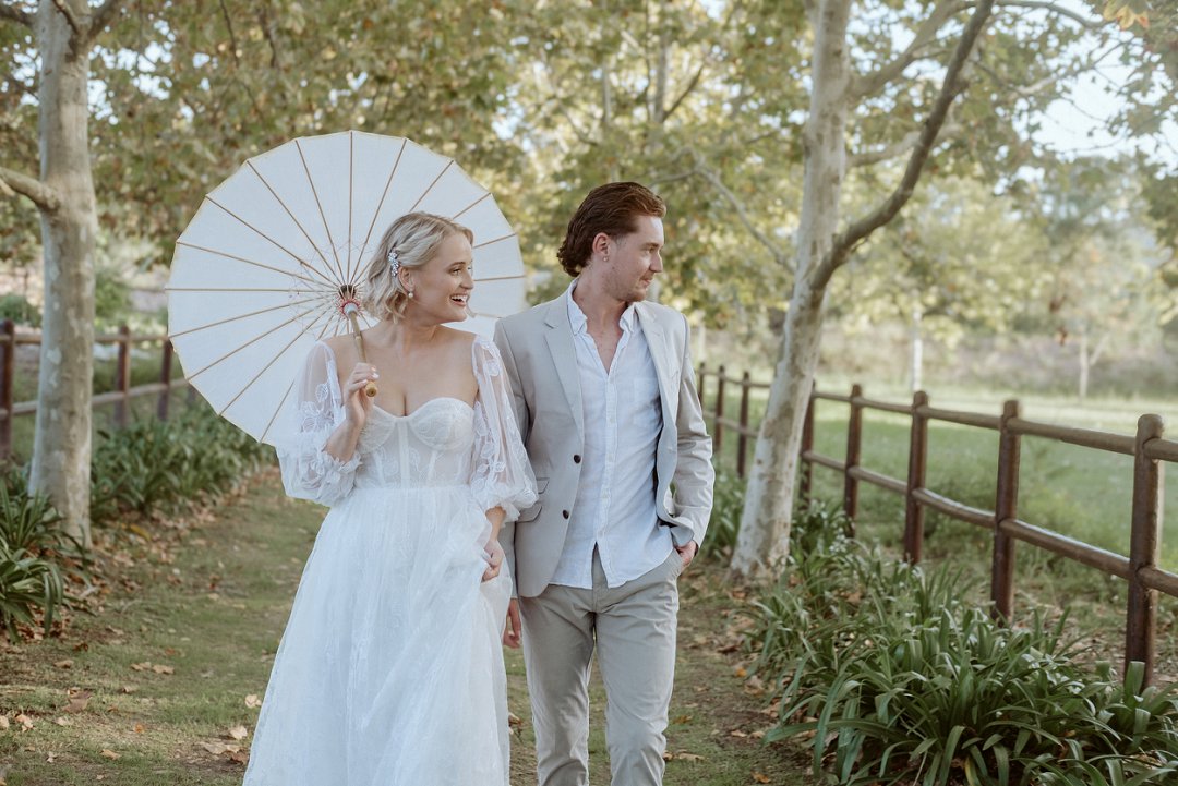 Die modelle se uitrustings het mooi by die tema gepas. Die bruid se rok was besonders met sy pofferige moue en fyn detail. Haar sagte grimering en los hare het ’n ontspanne voorkoms geskep. Die bruidegom het stylvol gelyk in ’n ligte pak met ’n wit hemp – sonder das vir ’n informele, moderne gevoel.