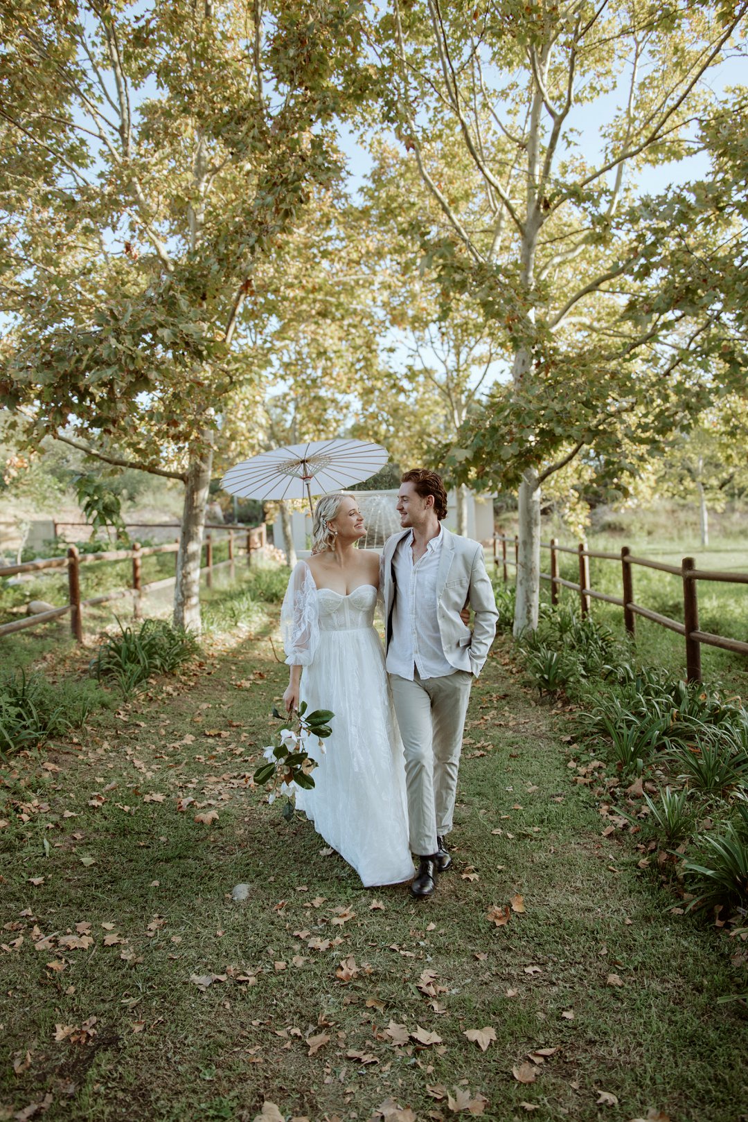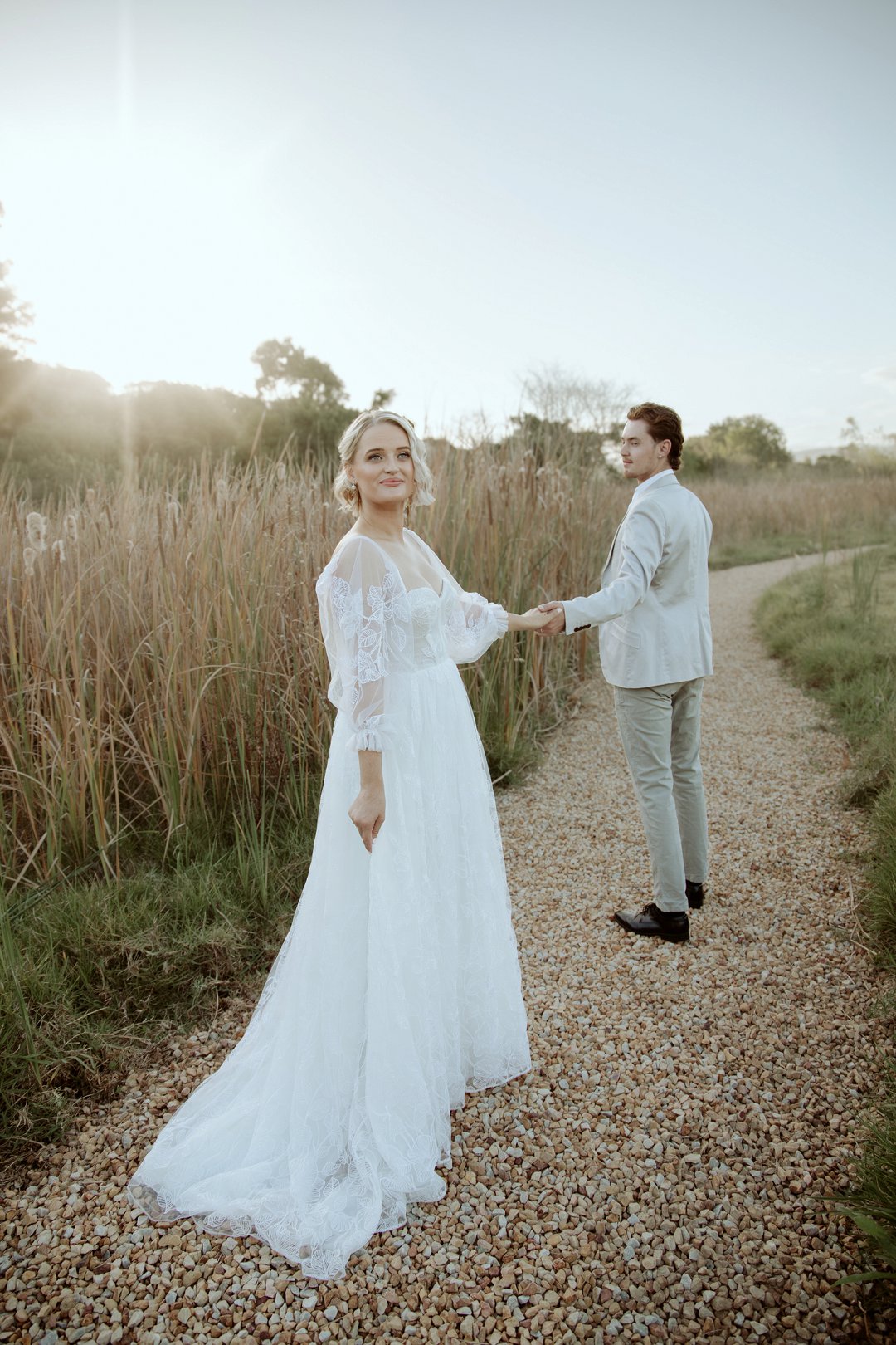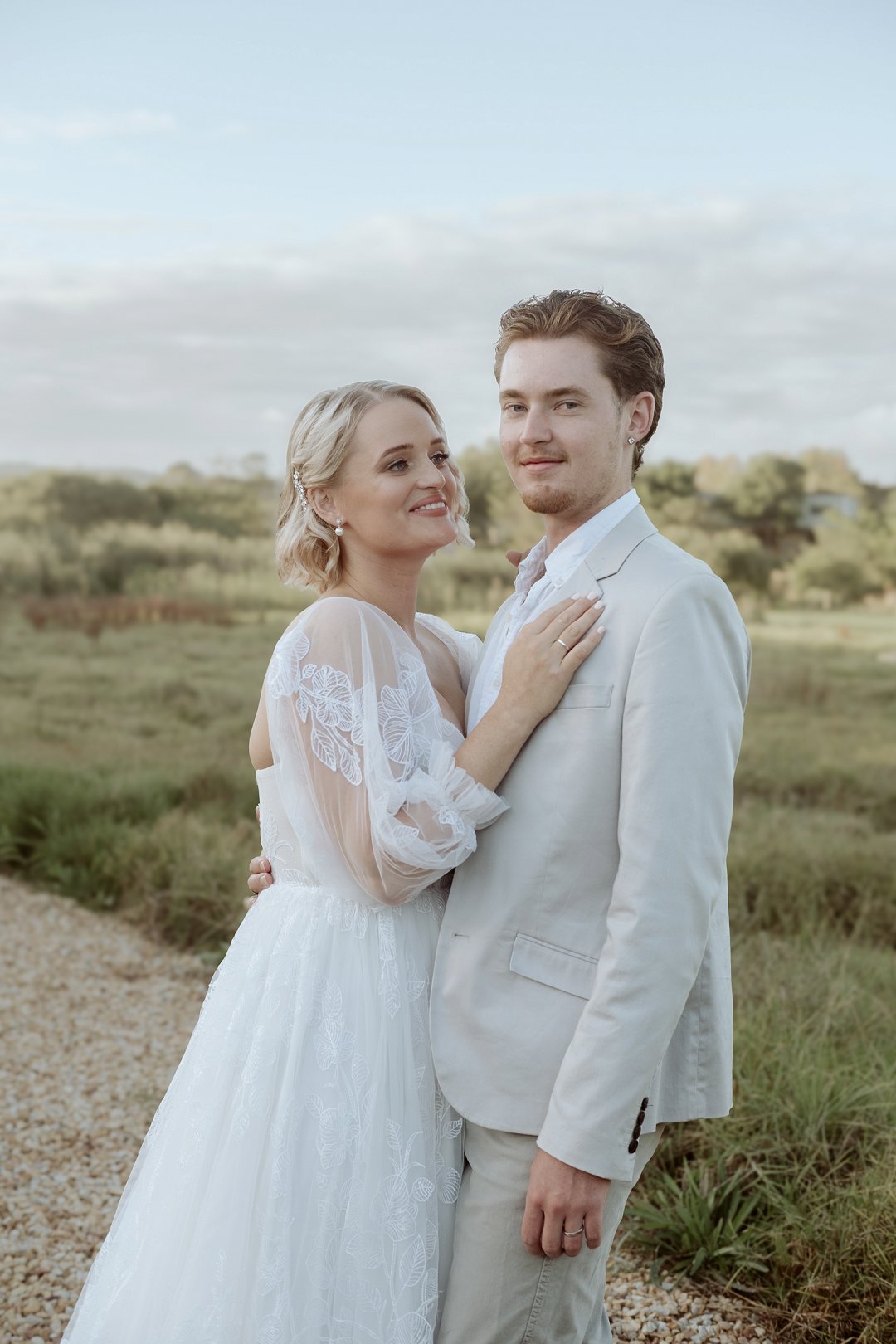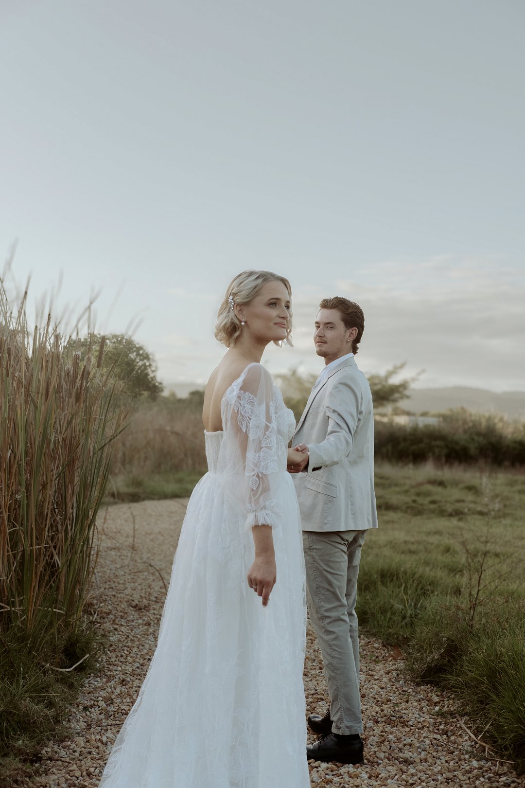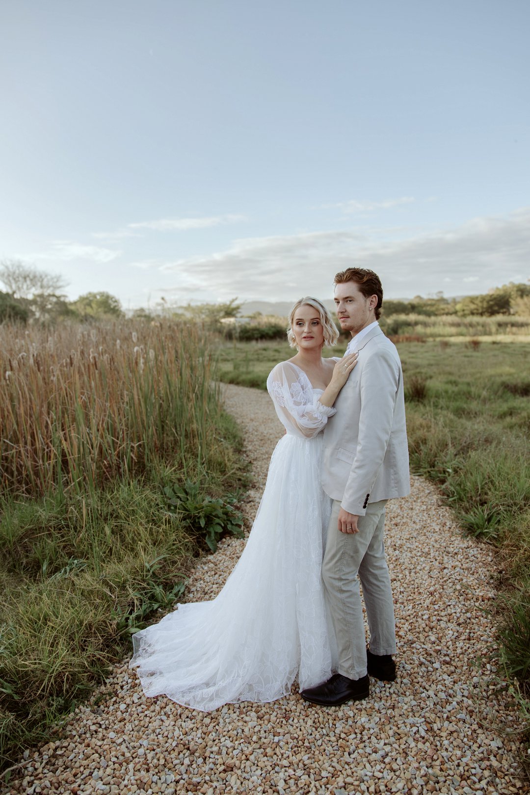 Die modelle se uitrustings het mooi by die tema gepas. Die bruid se rok was besonders met sy pofferige moue en fyn detail. Haar sagte grimering en los hare het ’n ontspanne voorkoms geskep. Die bruidegom het stylvol gelyk in ’n ligte pak met ’n wit hemp – sonder das vir ’n informele, moderne gevoel.