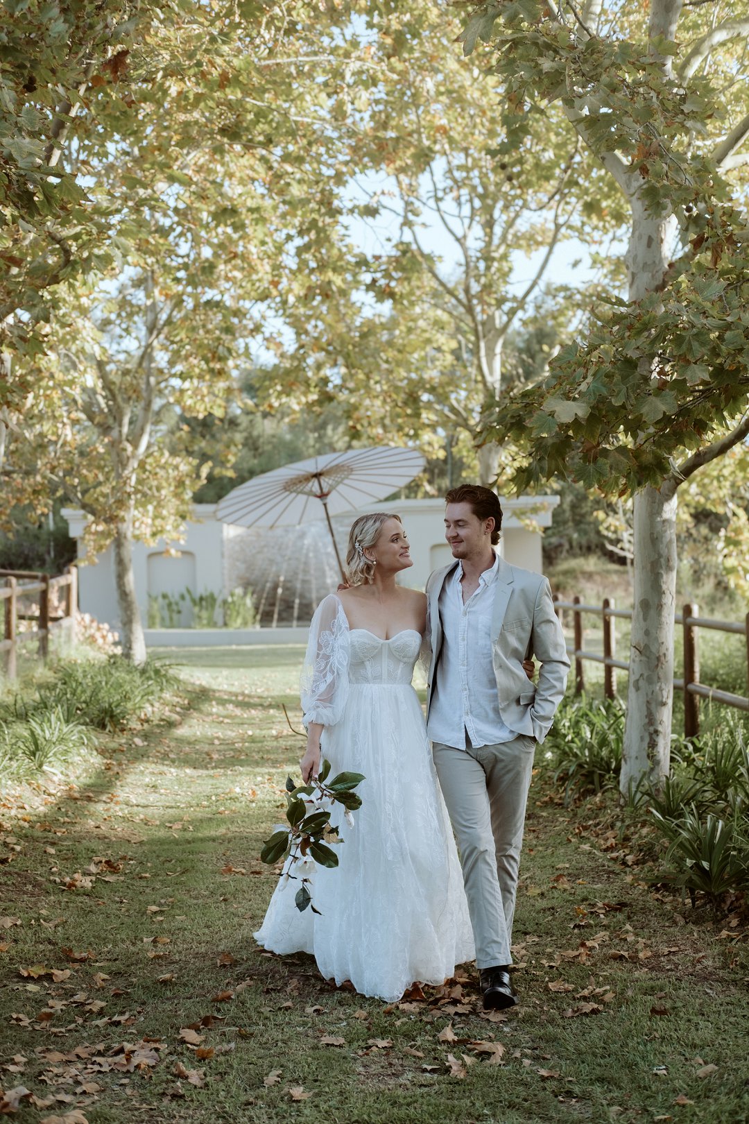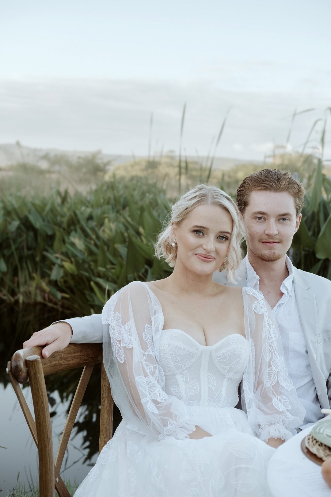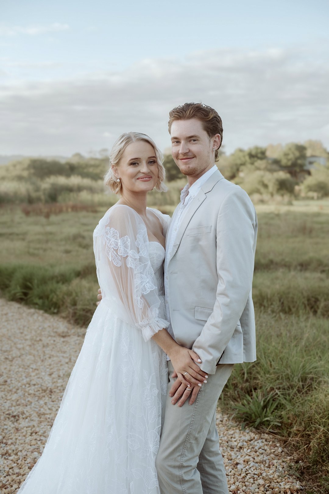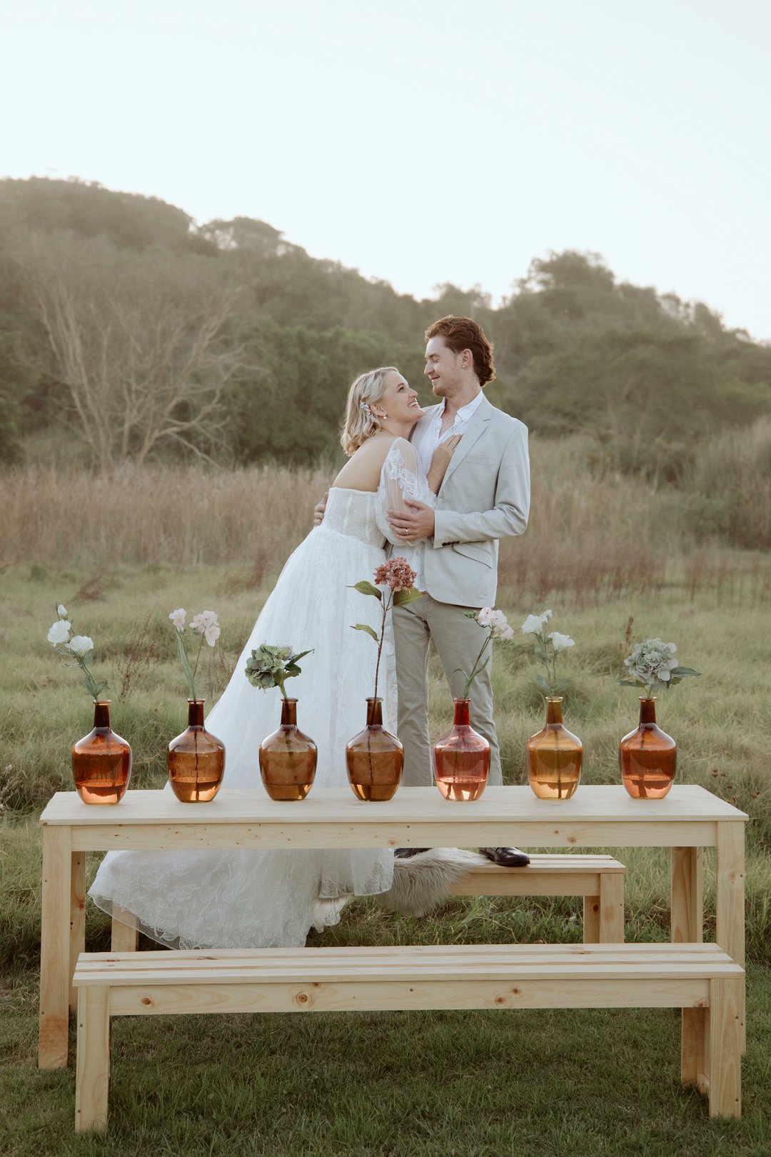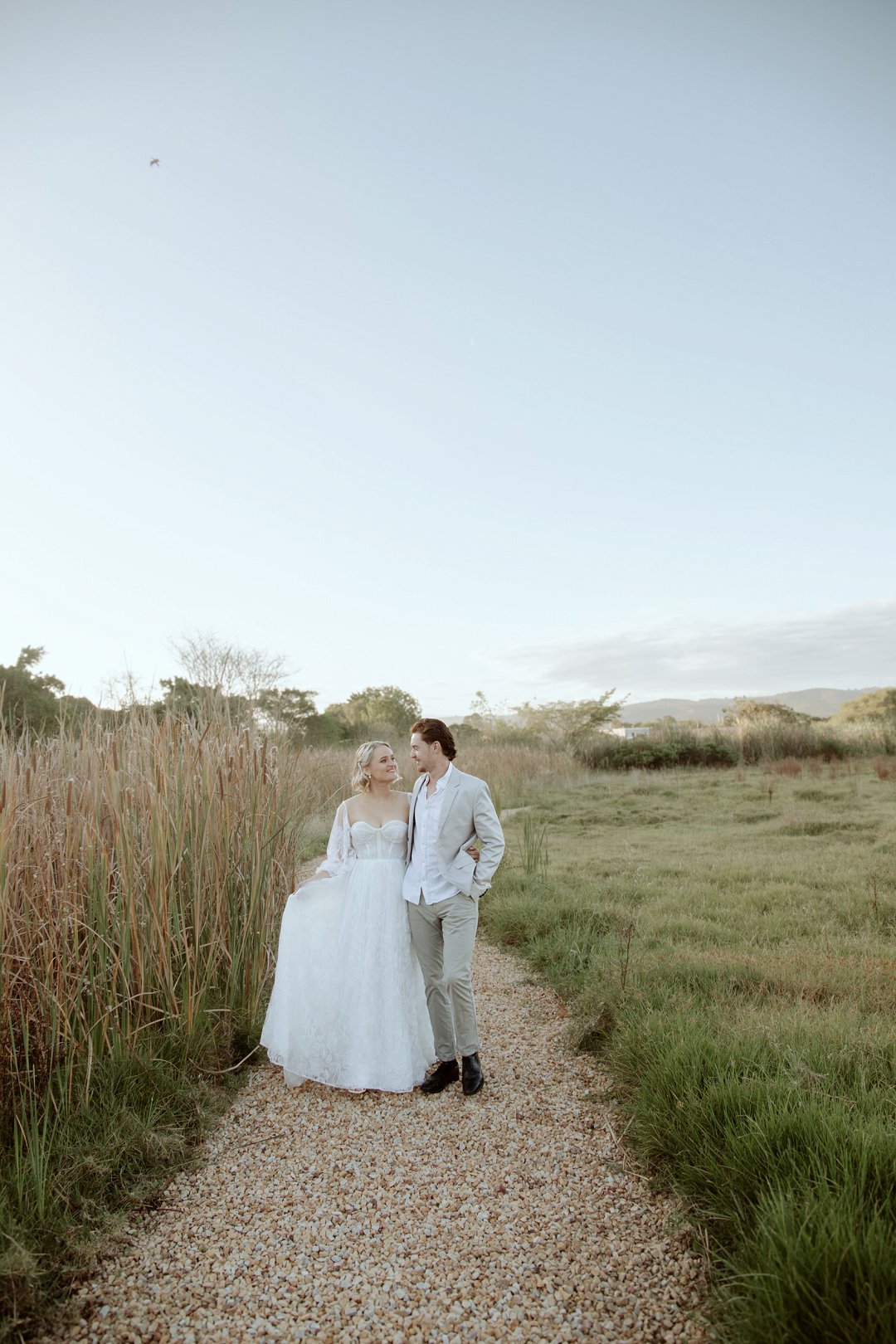 Die modelle se uitrustings het mooi by die tema gepas. Die bruid se rok was besonders met sy pofferige moue en fyn detail. Haar sagte grimering en los hare het ’n ontspanne voorkoms geskep. Die bruidegom het stylvol gelyk in ’n ligte pak met ’n wit hemp – sonder das vir ’n informele, moderne gevoel.