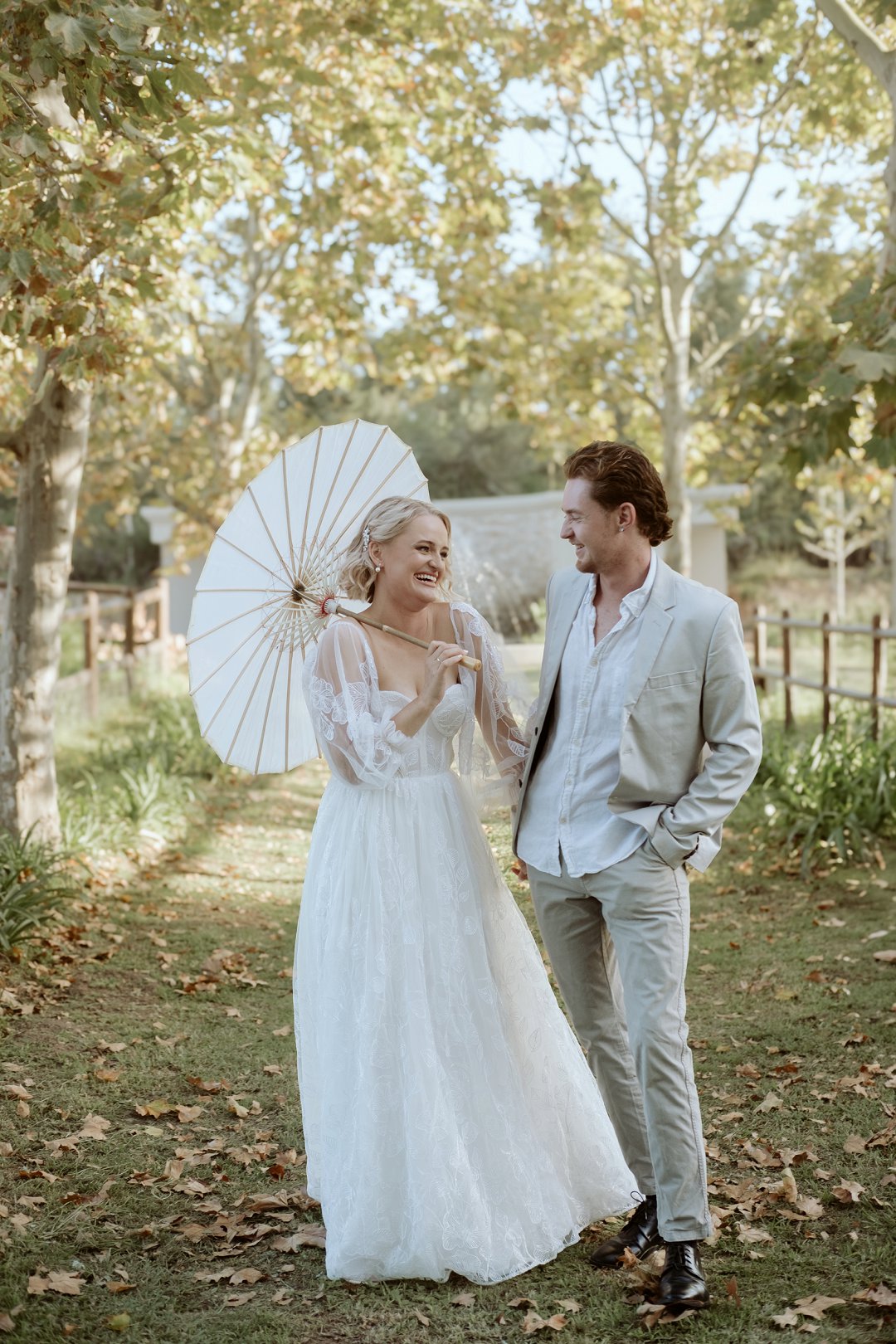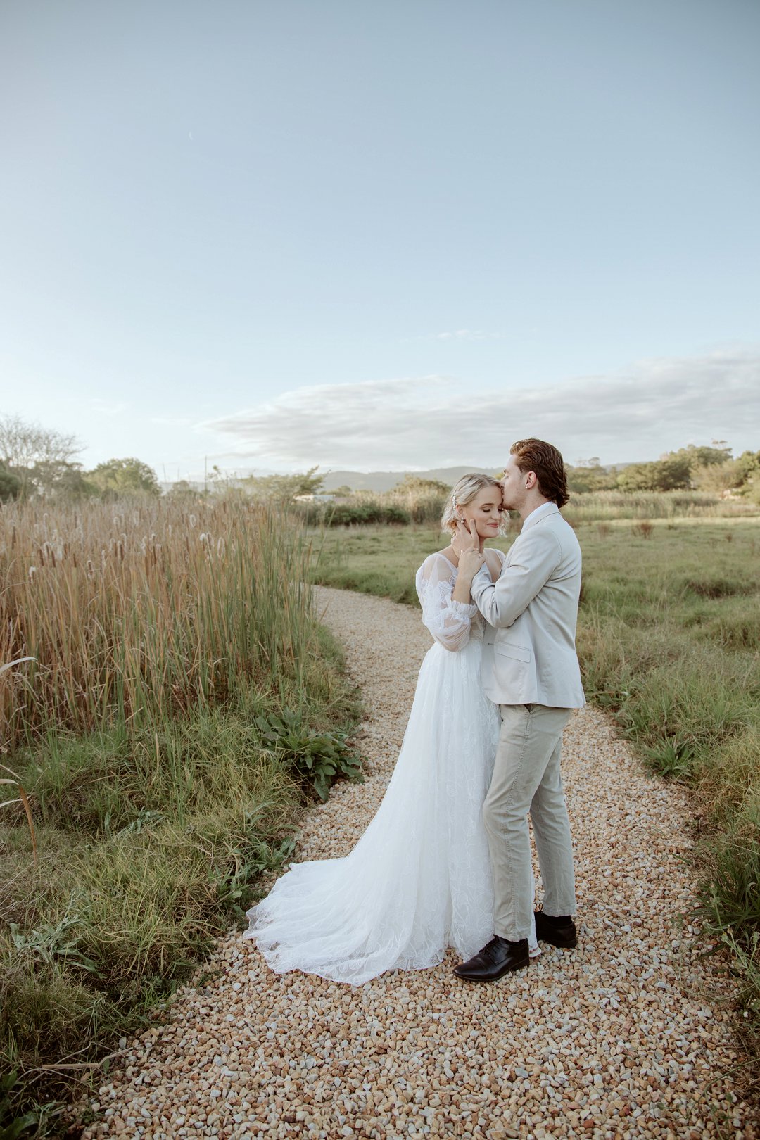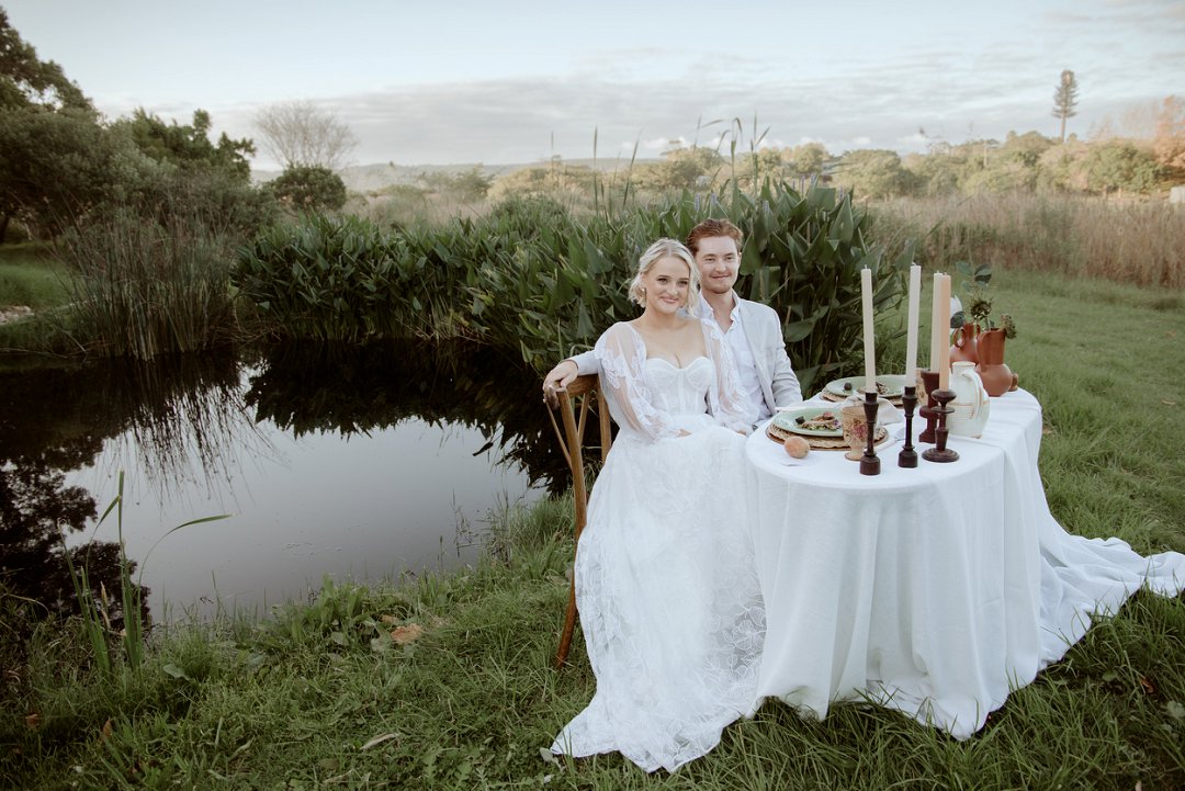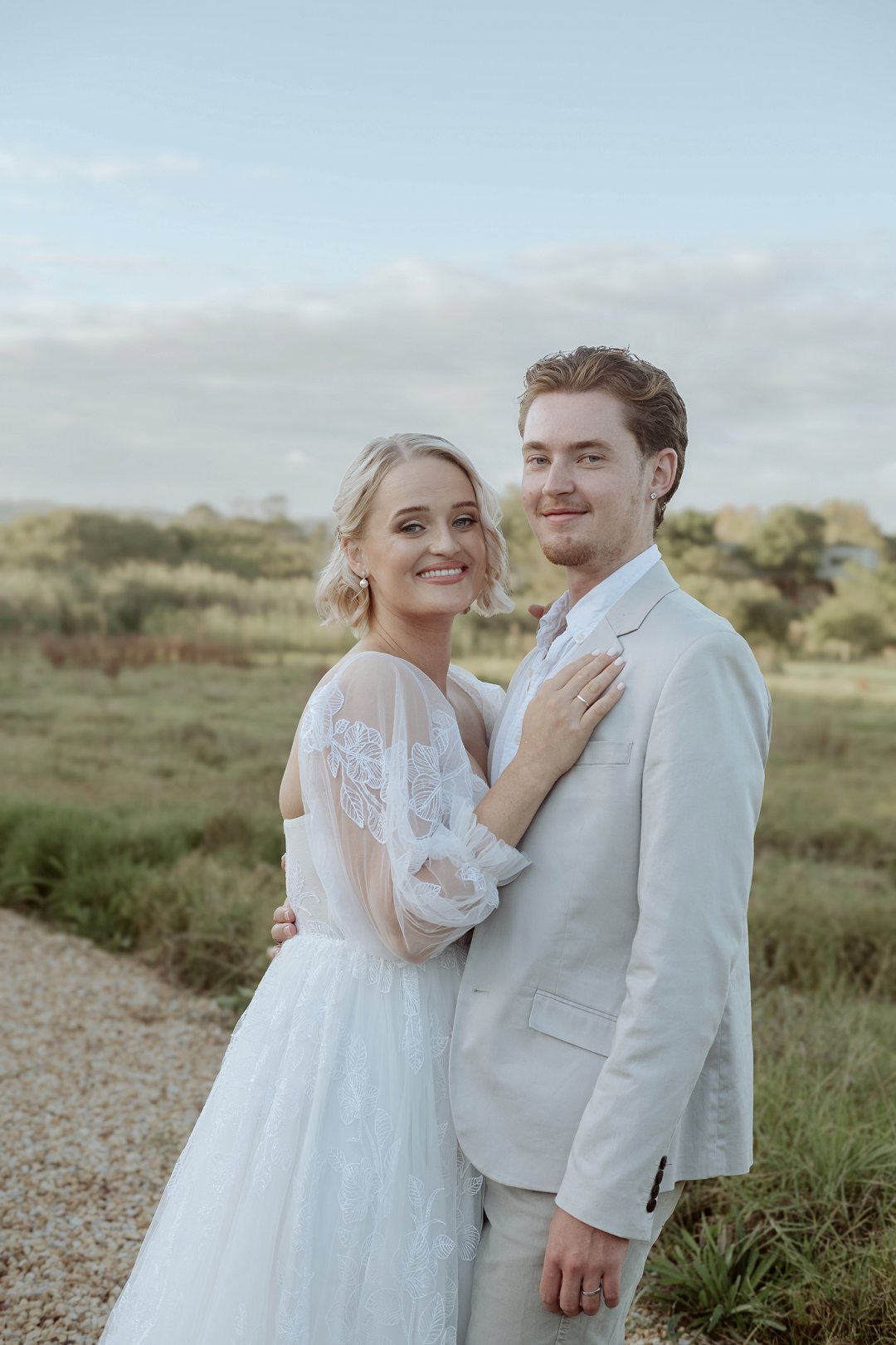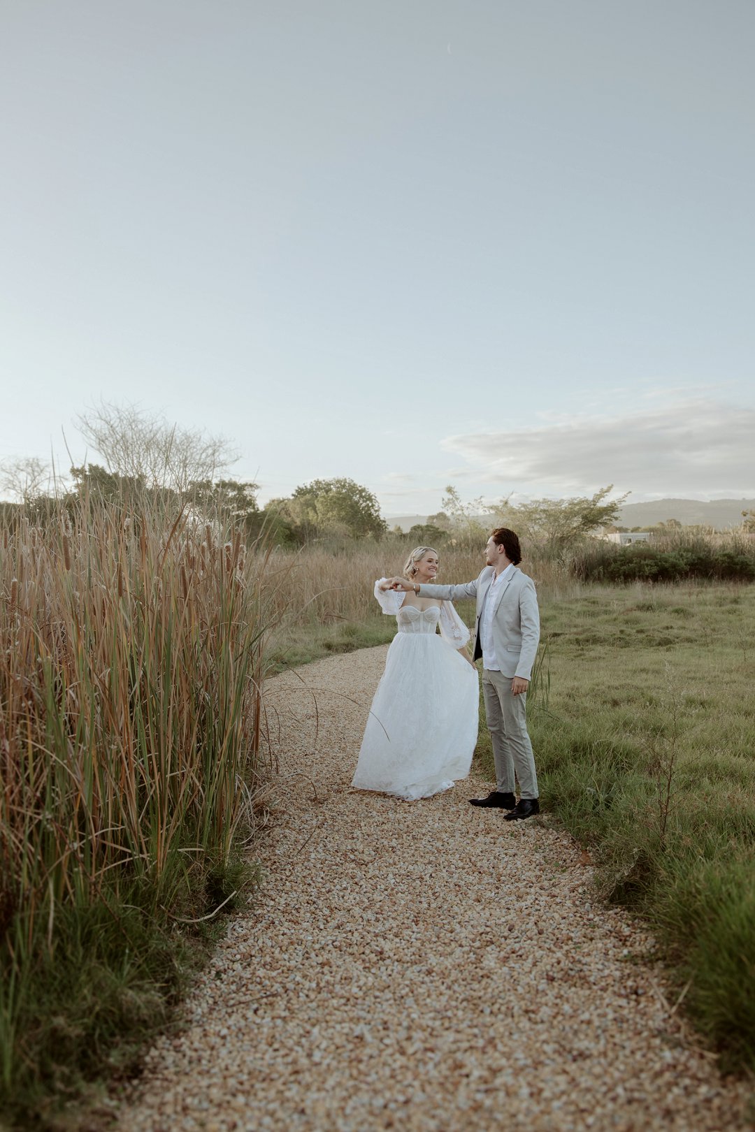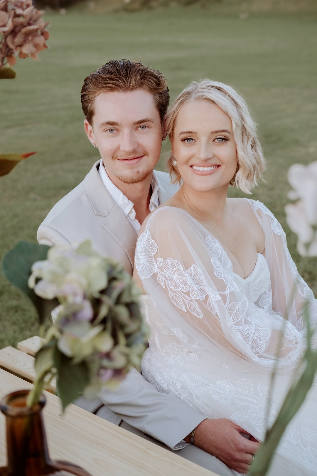 Die modelle se uitrustings het mooi by die tema gepas. Die bruid se rok was besonders met sy pofferige moue en fyn detail. Haar sagte grimering en los hare het ’n ontspanne voorkoms geskep. Die bruidegom het stylvol gelyk in ’n ligte pak met ’n wit hemp – sonder das vir ’n informele, moderne gevoel.
