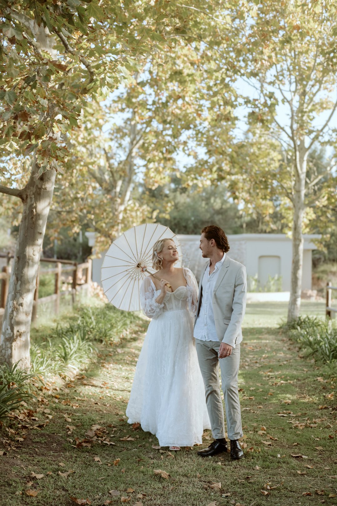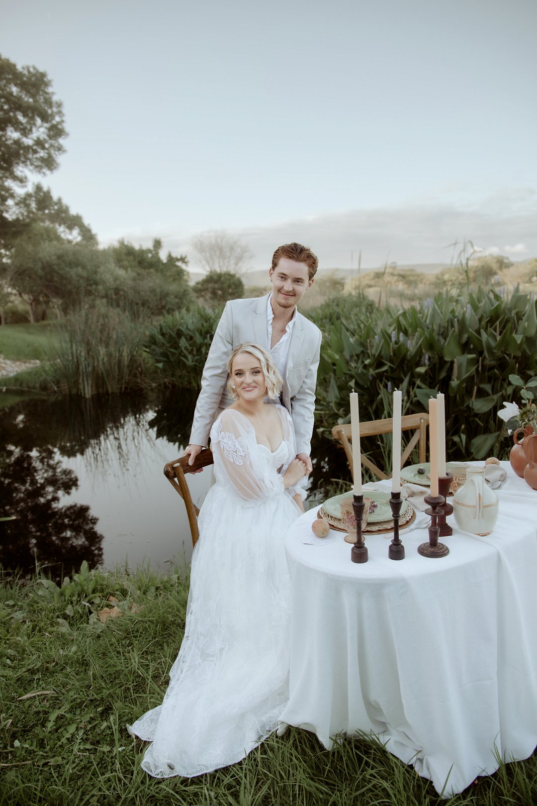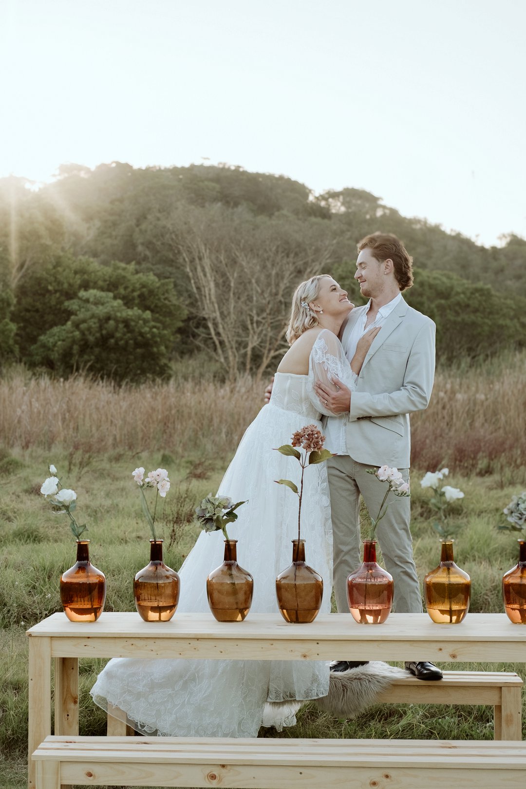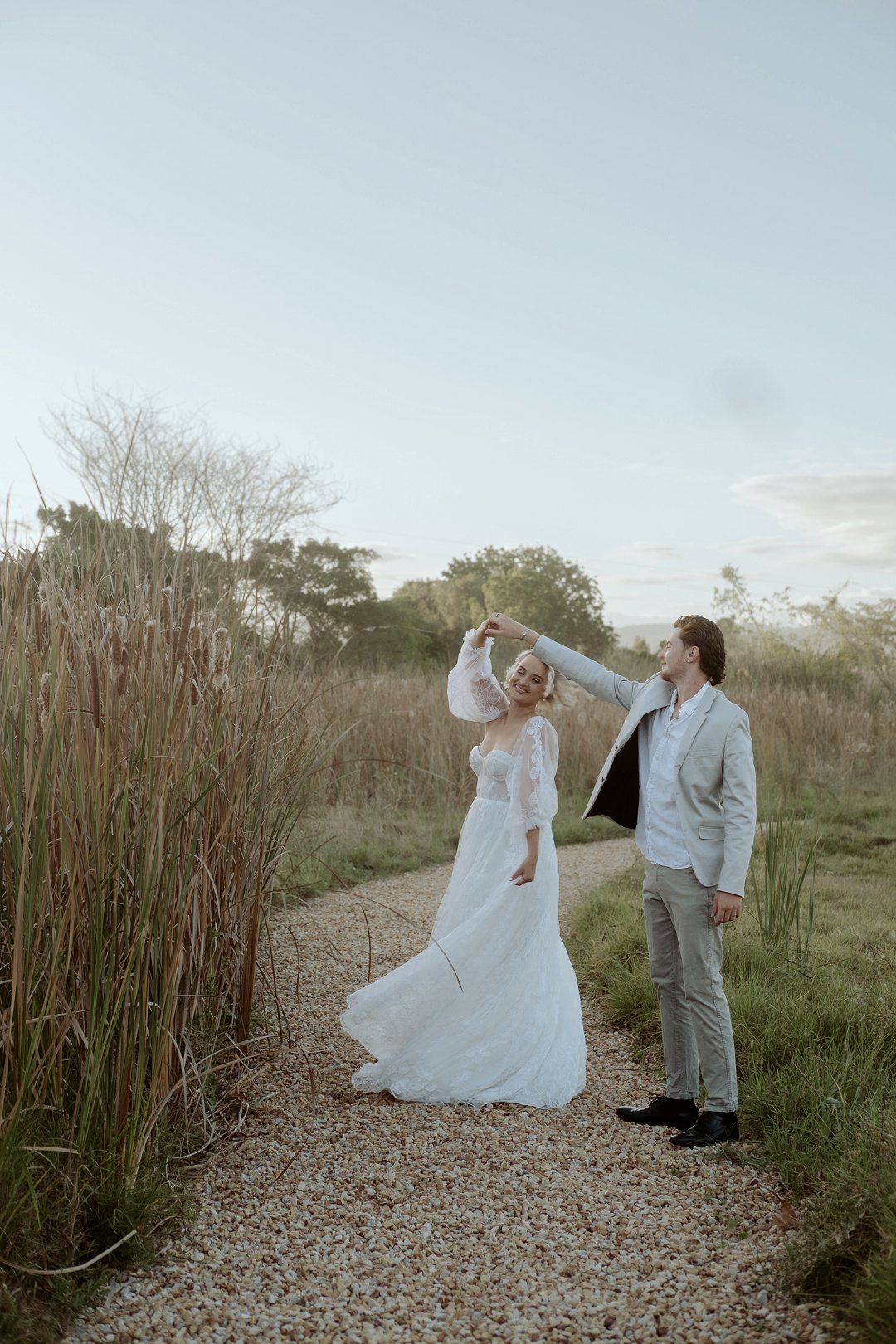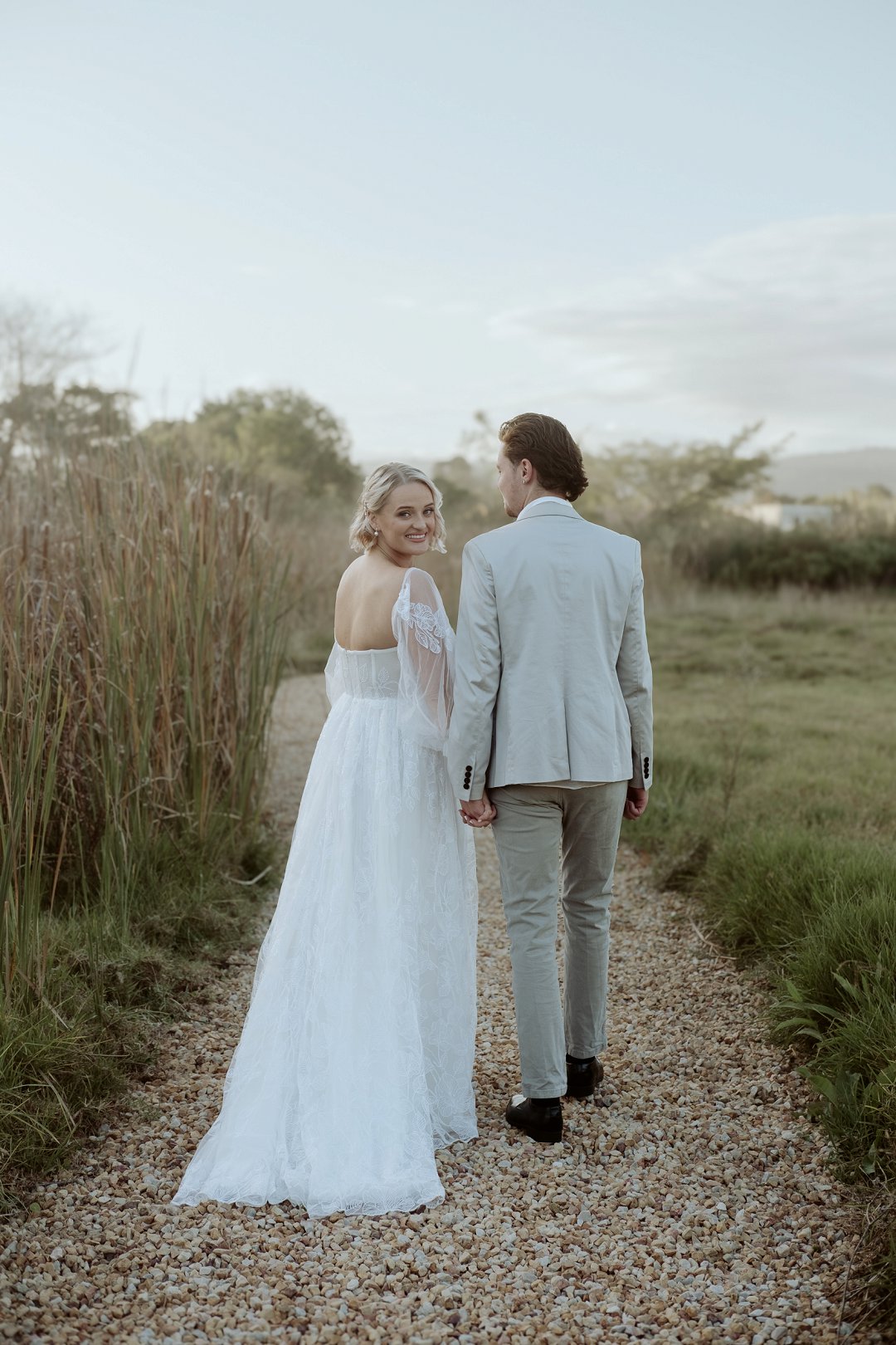 Die modelle se uitrustings het mooi by die tema gepas. Die bruid se rok was besonders met sy pofferige moue en fyn detail. Haar sagte grimering en los hare het ’n ontspanne voorkoms geskep. Die bruidegom het stylvol gelyk in ’n ligte pak met ’n wit hemp – sonder das vir ’n informele, moderne gevoel.