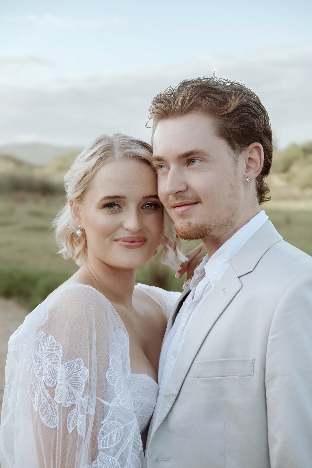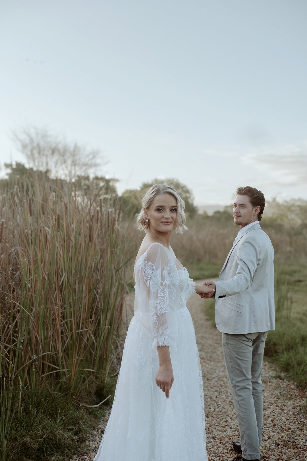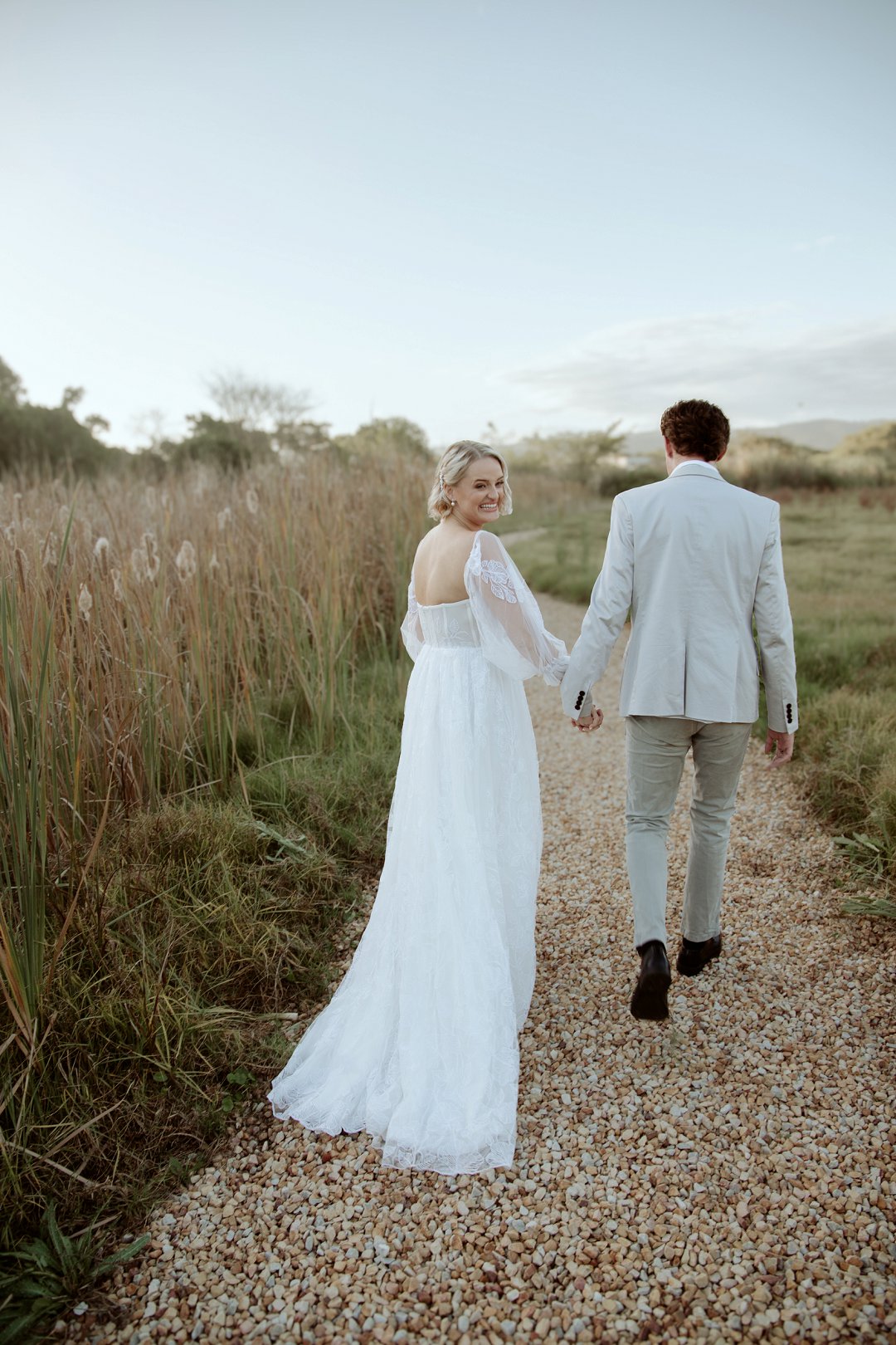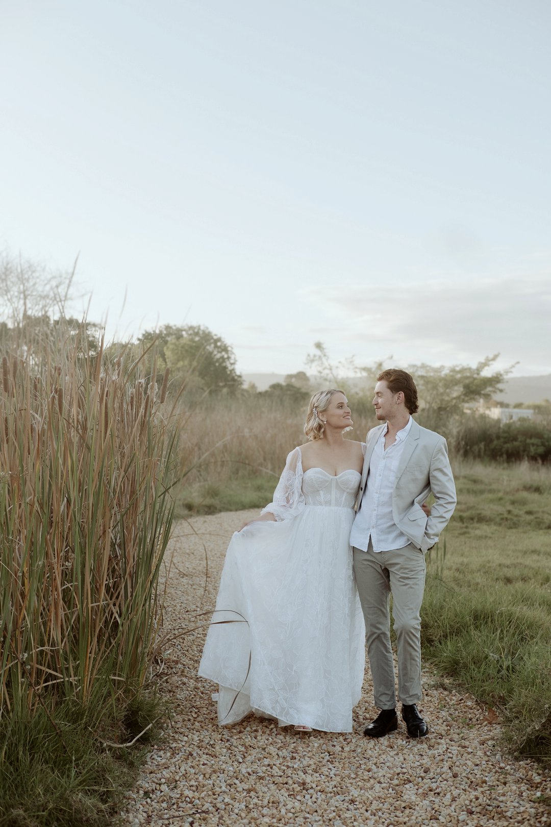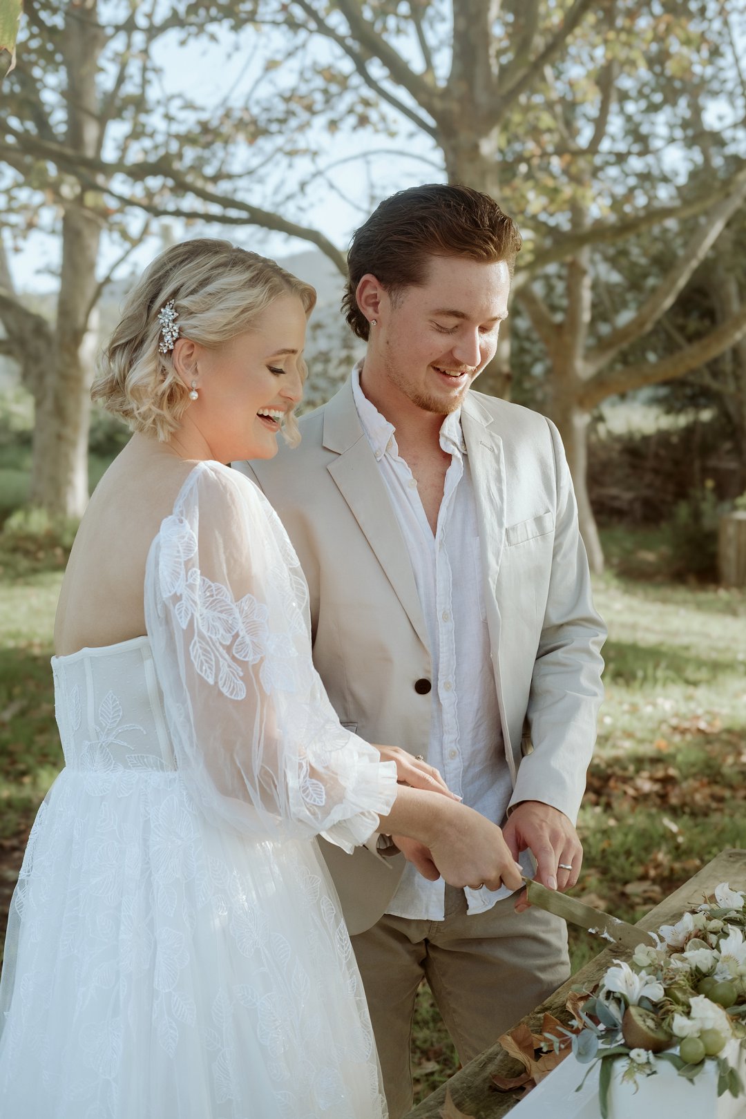 Die modelle se uitrustings het mooi by die tema gepas. Die bruid se rok was besonders met sy pofferige moue en fyn detail. Haar sagte grimering en los hare het ’n ontspanne voorkoms geskep. Die bruidegom het stylvol gelyk in ’n ligte pak met ’n wit hemp – sonder das vir ’n informele, moderne gevoel.