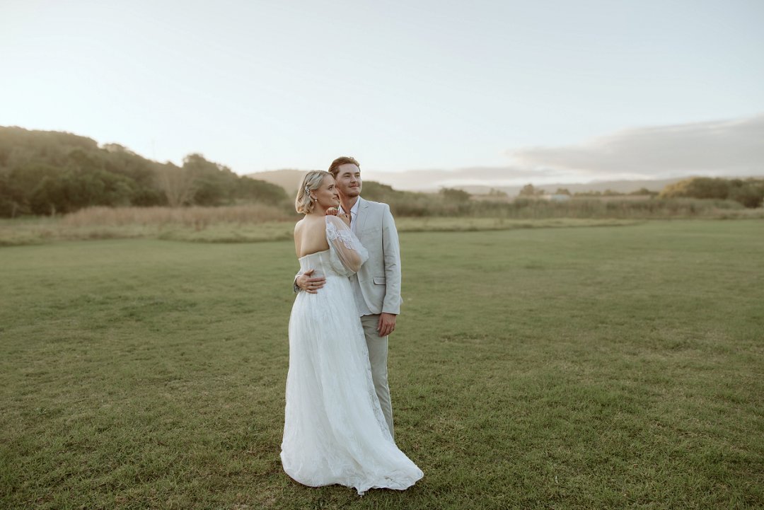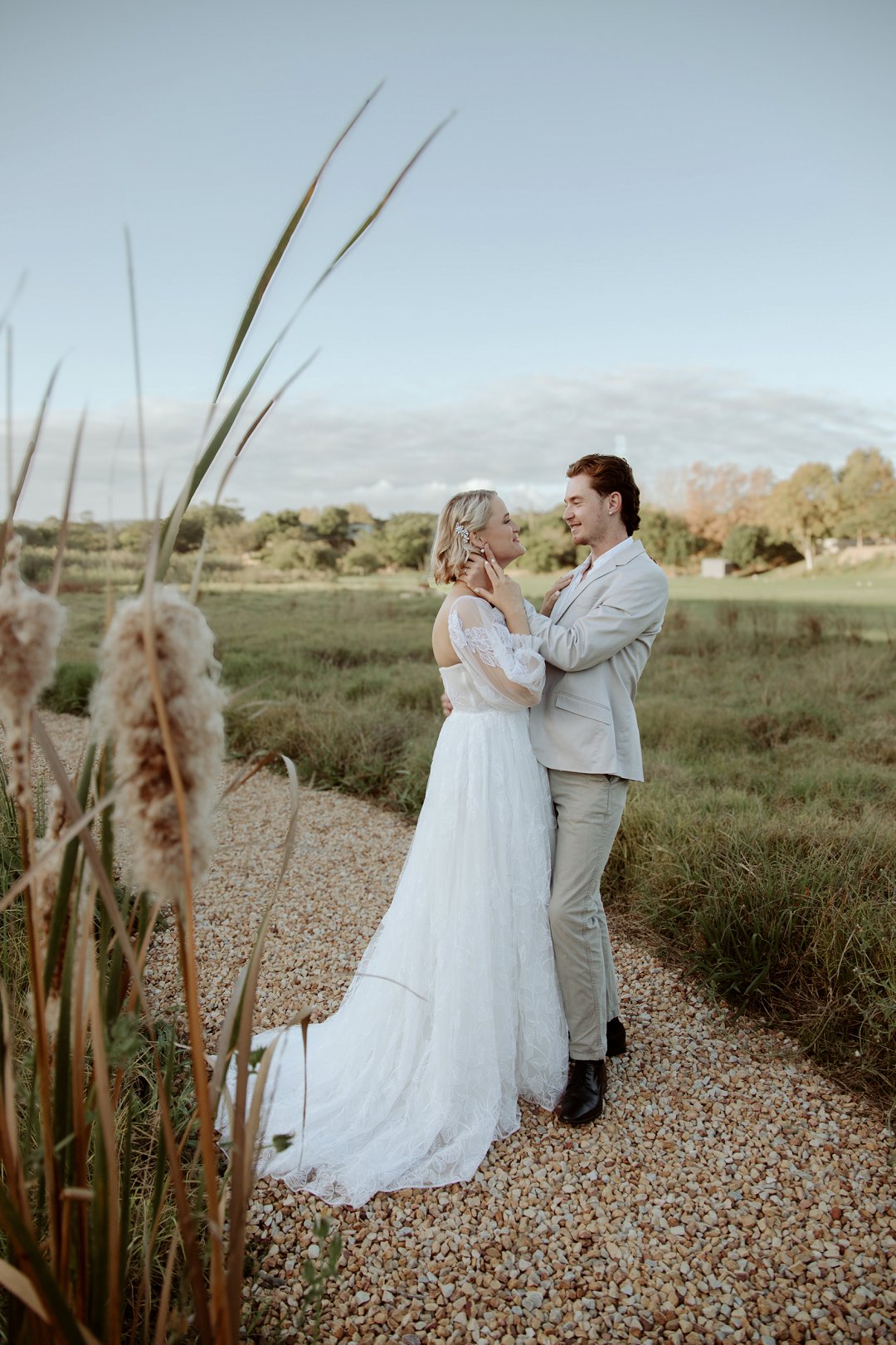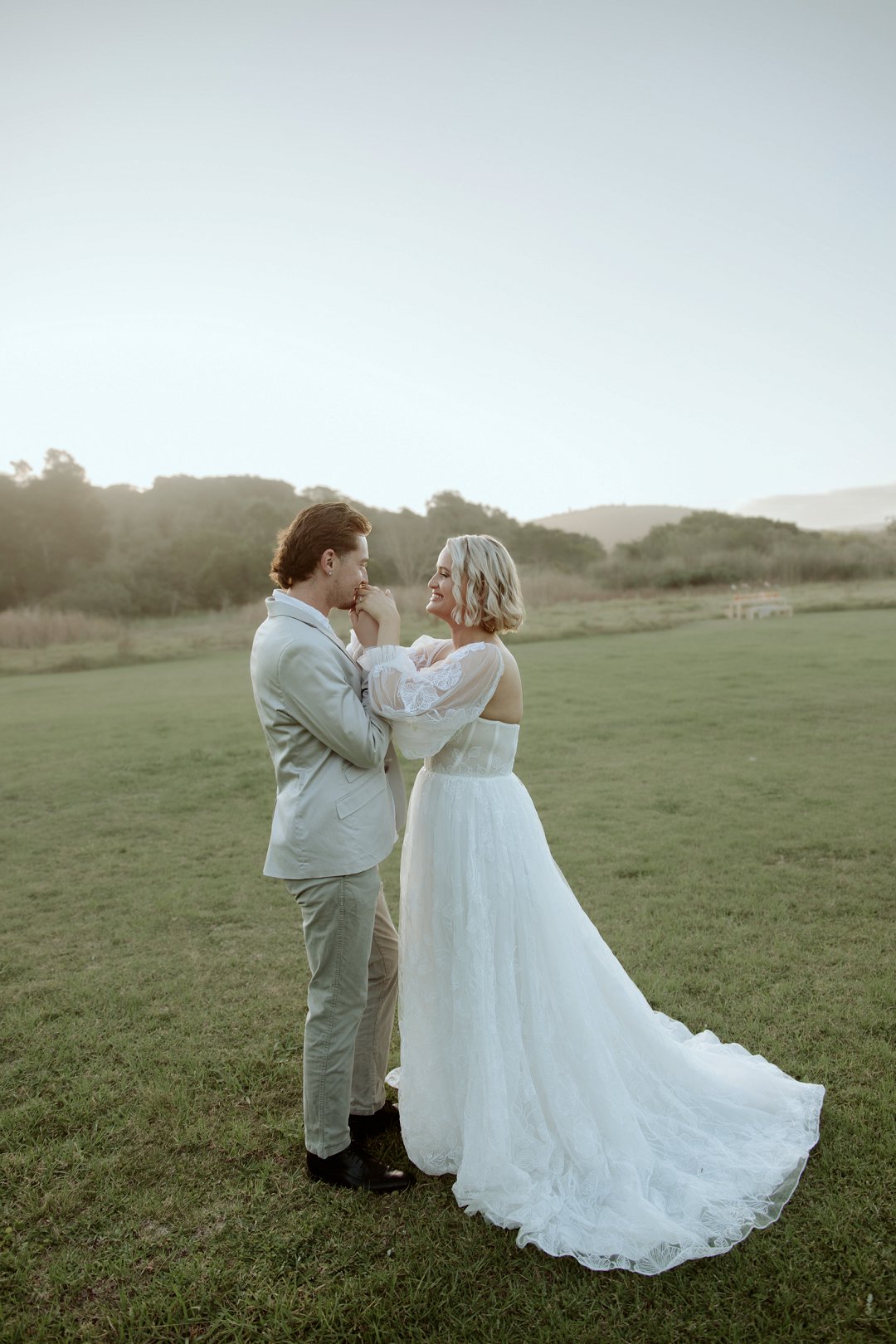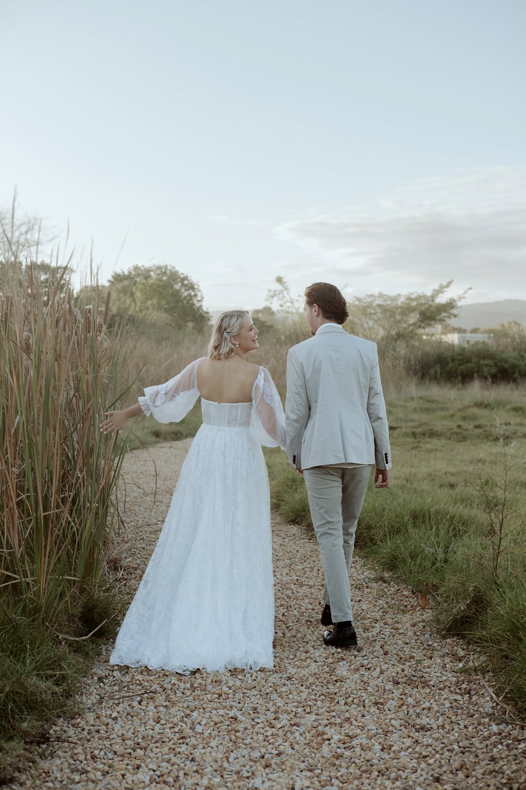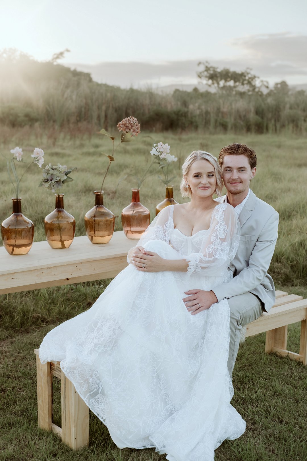 Die modelle se uitrustings het mooi by die tema gepas. Die bruid se rok was besonders met sy pofferige moue en fyn detail. Haar sagte grimering en los hare het ’n ontspanne voorkoms geskep. Die bruidegom het stylvol gelyk in ’n ligte pak met ’n wit hemp – sonder das vir ’n informele, moderne gevoel.