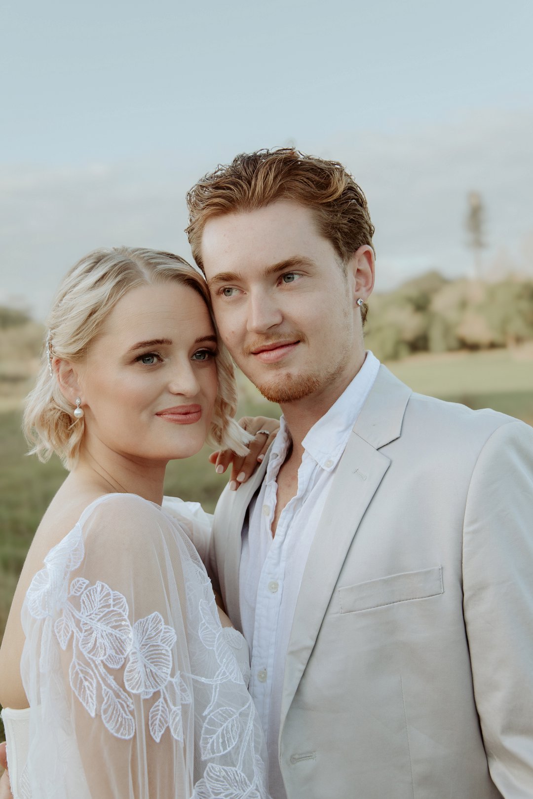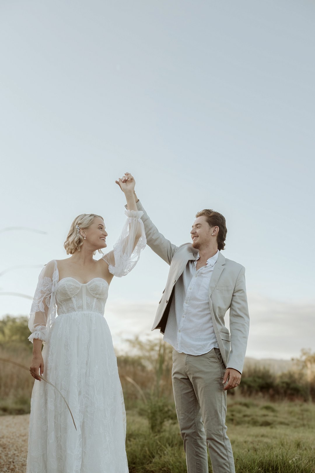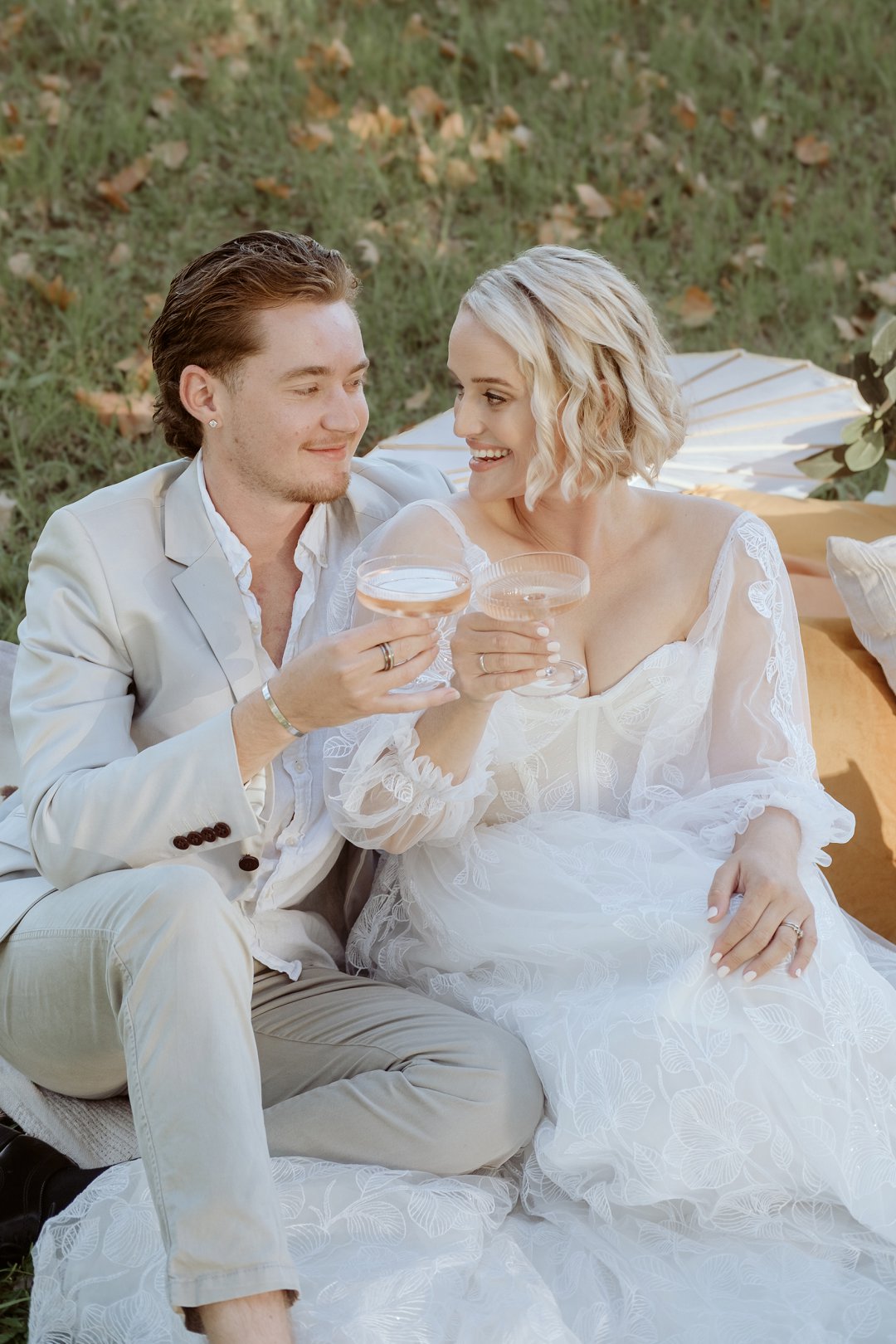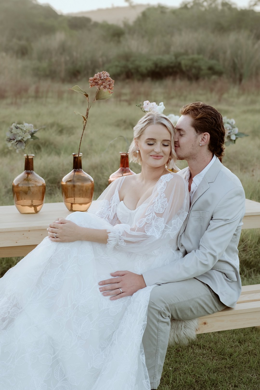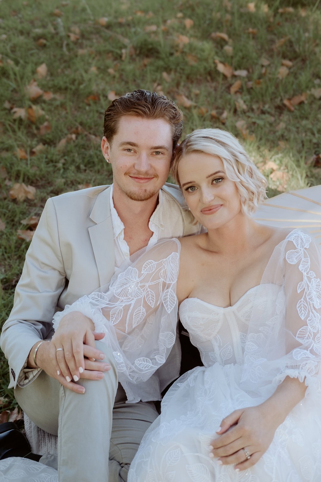 Die modelle se uitrustings het mooi by die tema gepas. Die bruid se rok was besonders met sy pofferige moue en fyn detail. Haar sagte grimering en los hare het ’n ontspanne voorkoms geskep. Die bruidegom het stylvol gelyk in ’n ligte pak met ’n wit hemp – sonder das vir ’n informele, moderne gevoel.