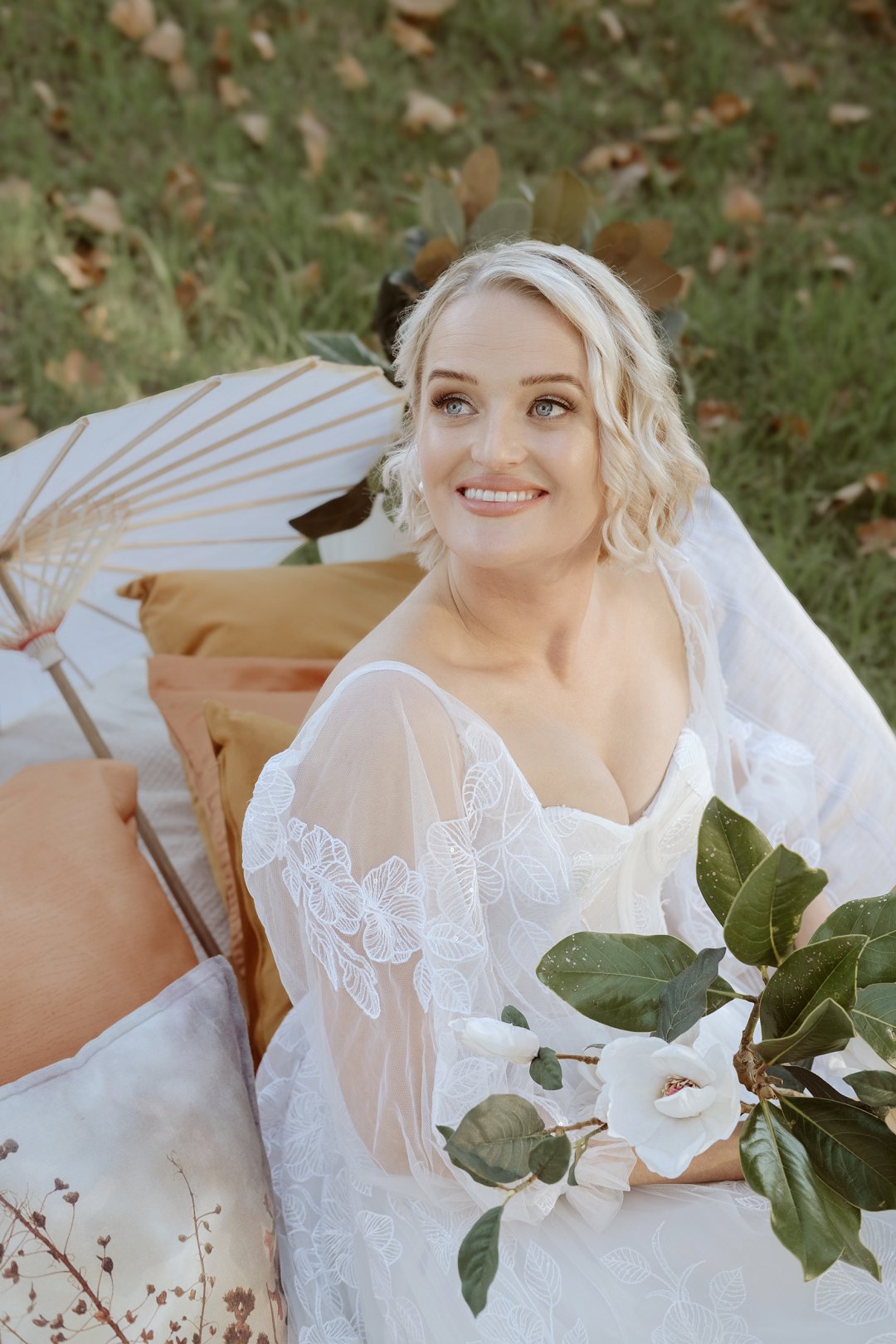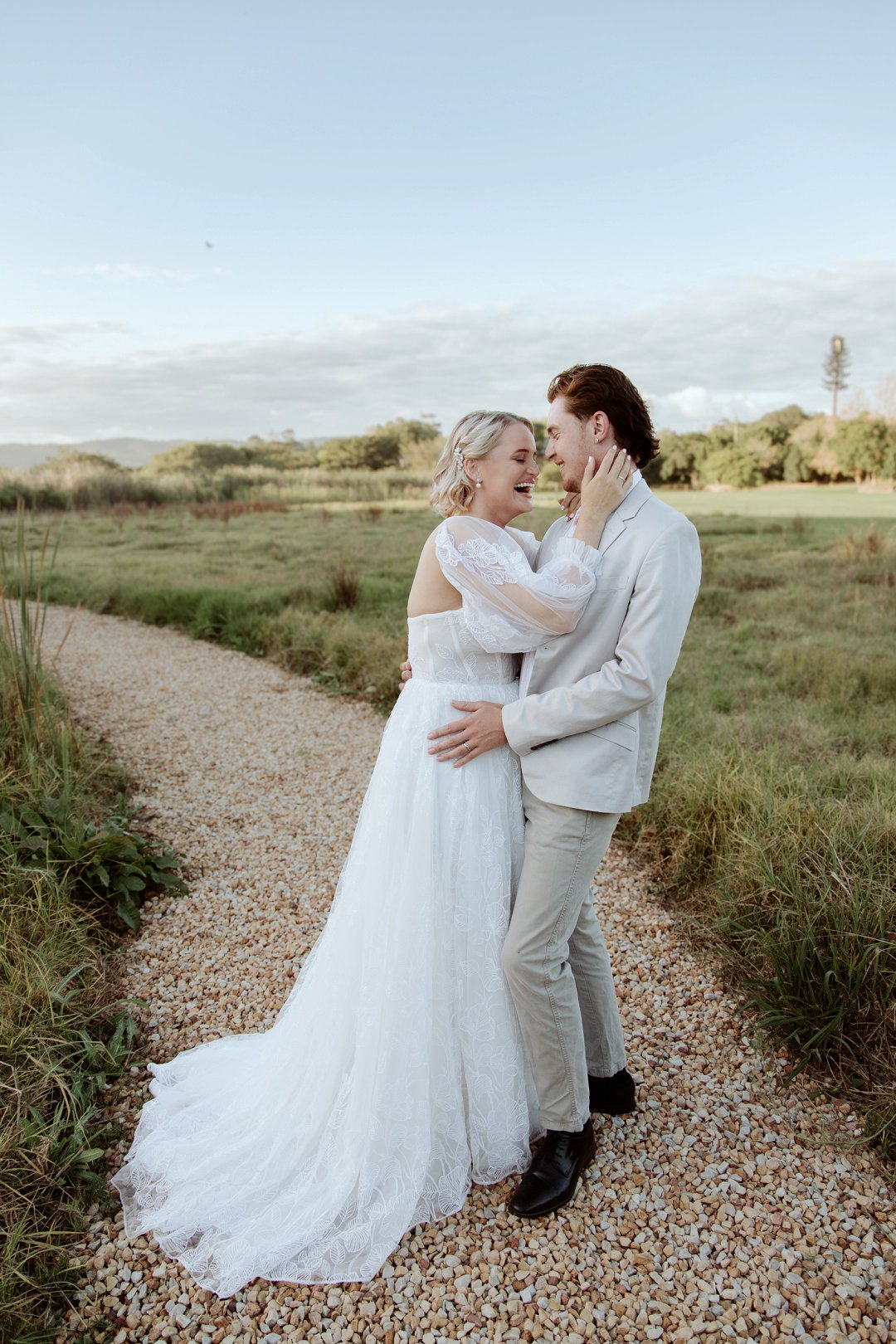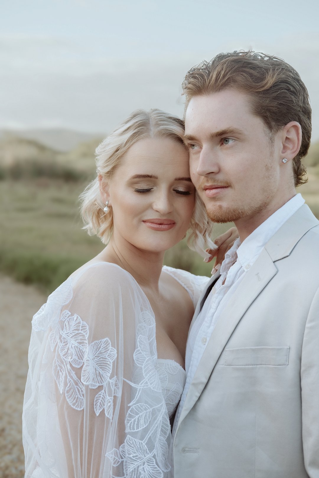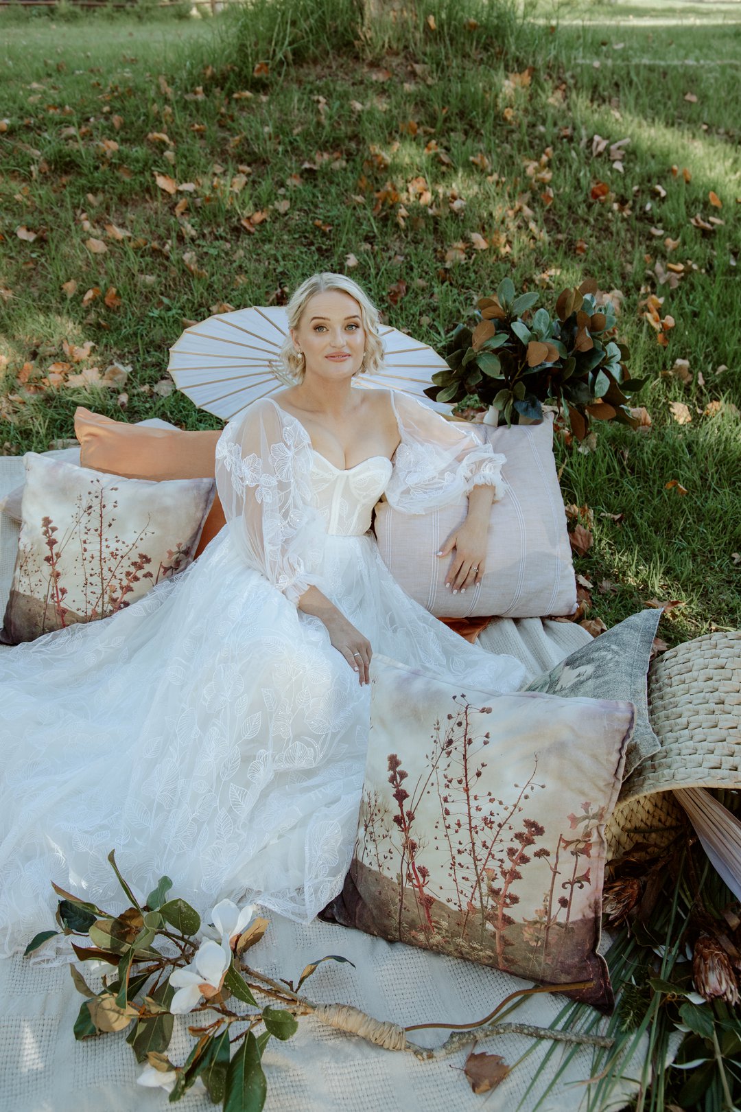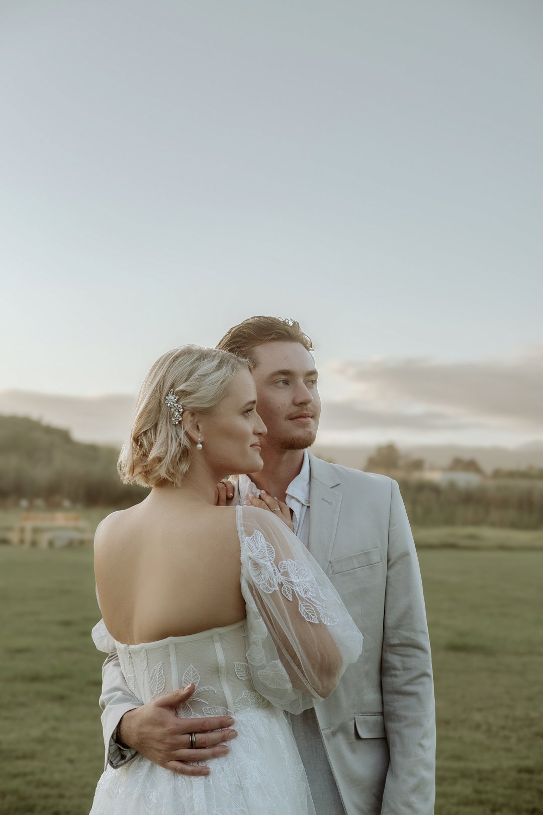 Die modelle se uitrustings het mooi by die tema gepas. Die bruid se rok was besonders met sy pofferige moue en fyn detail. Haar sagte grimering en los hare het ’n ontspanne voorkoms geskep. Die bruidegom het stylvol gelyk in ’n ligte pak met ’n wit hemp – sonder das vir ’n informele, moderne gevoel.
