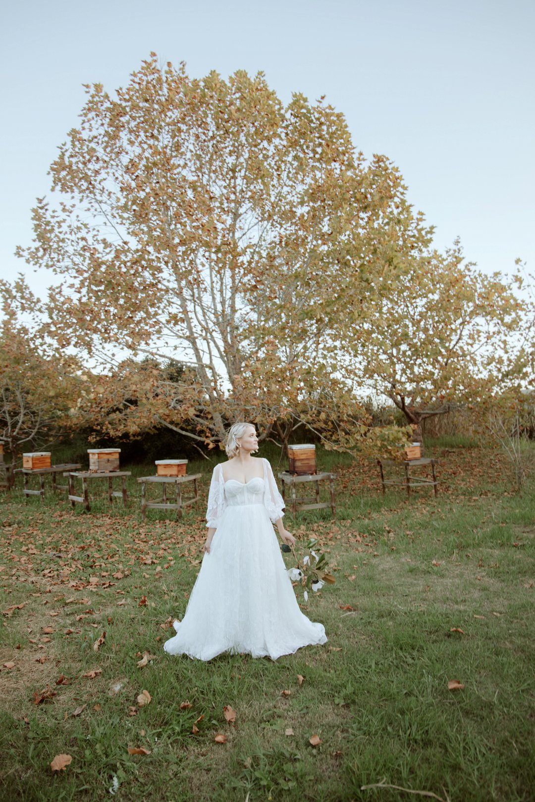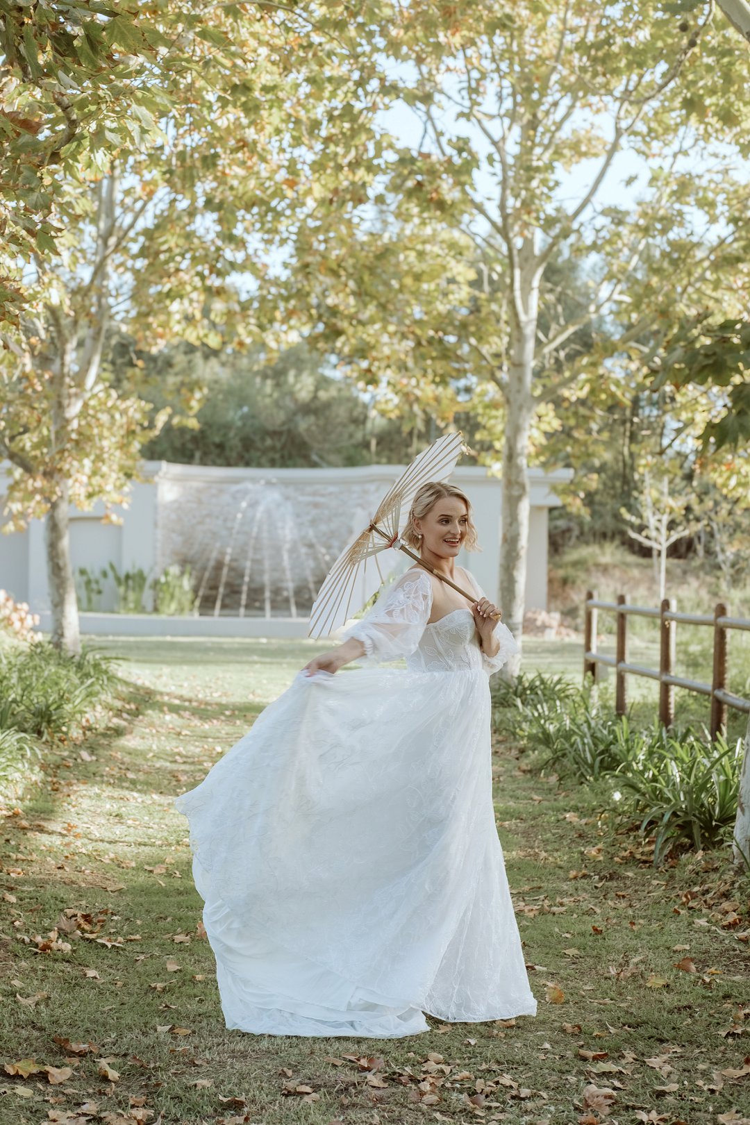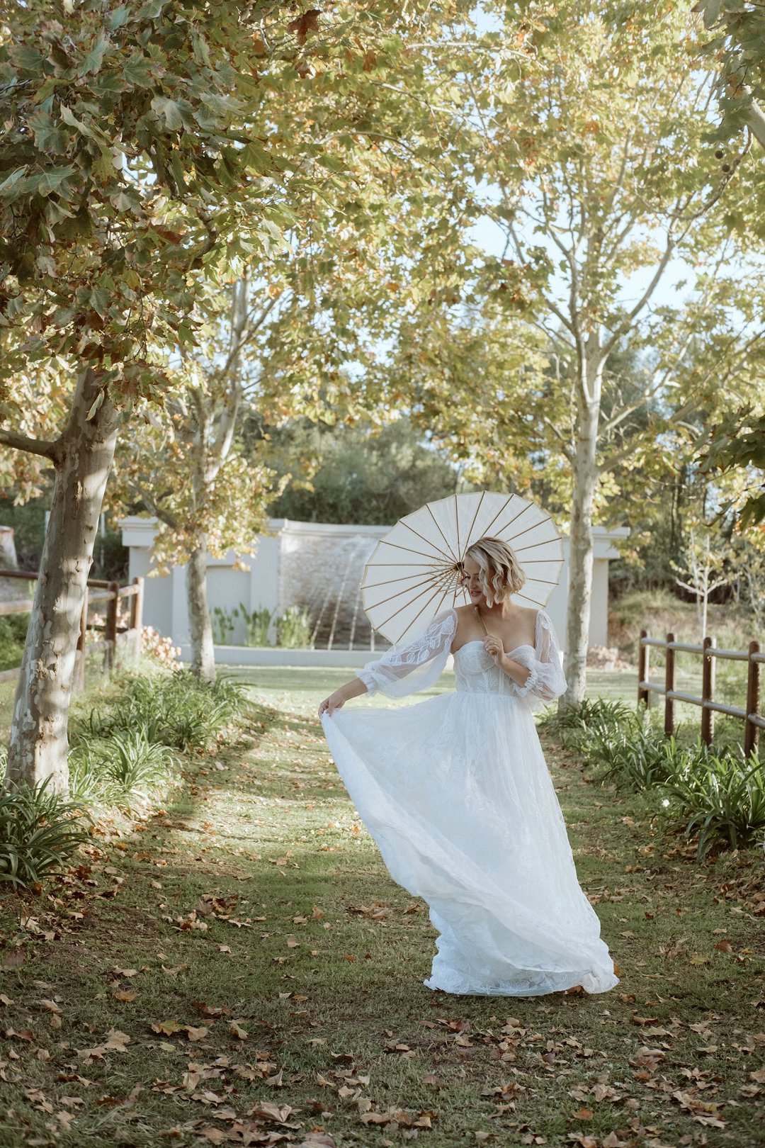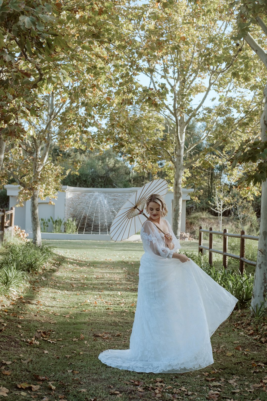 Ons model, Jessica, het haar eie trourok gedra. Dit het perfek by die herfs-tema ingepas. Die ontwerp het haar natuurlik en moeiteloos in die omgewing laat smelt.