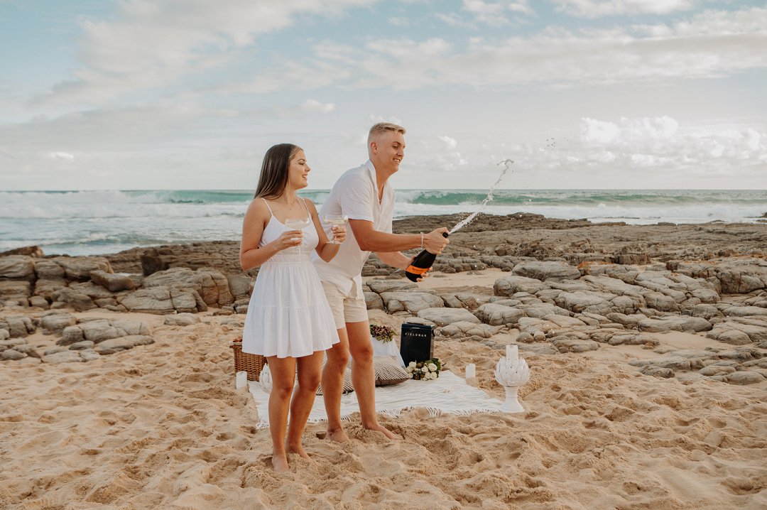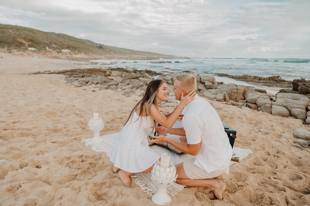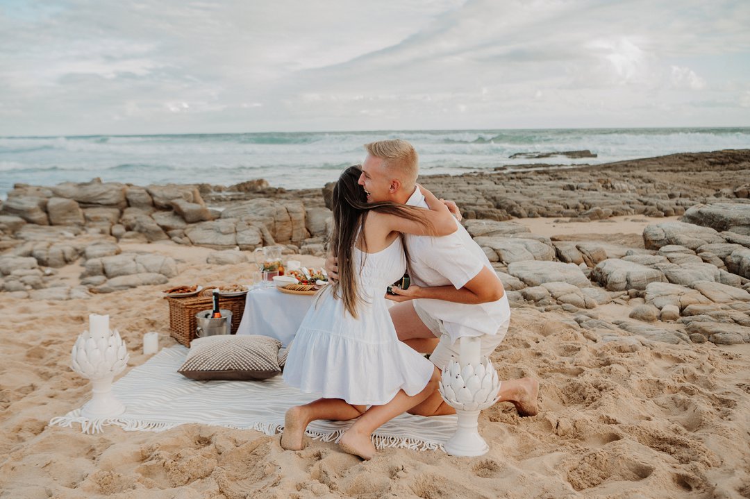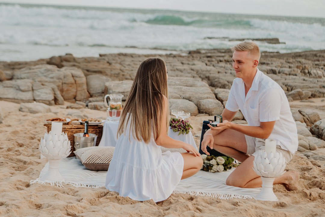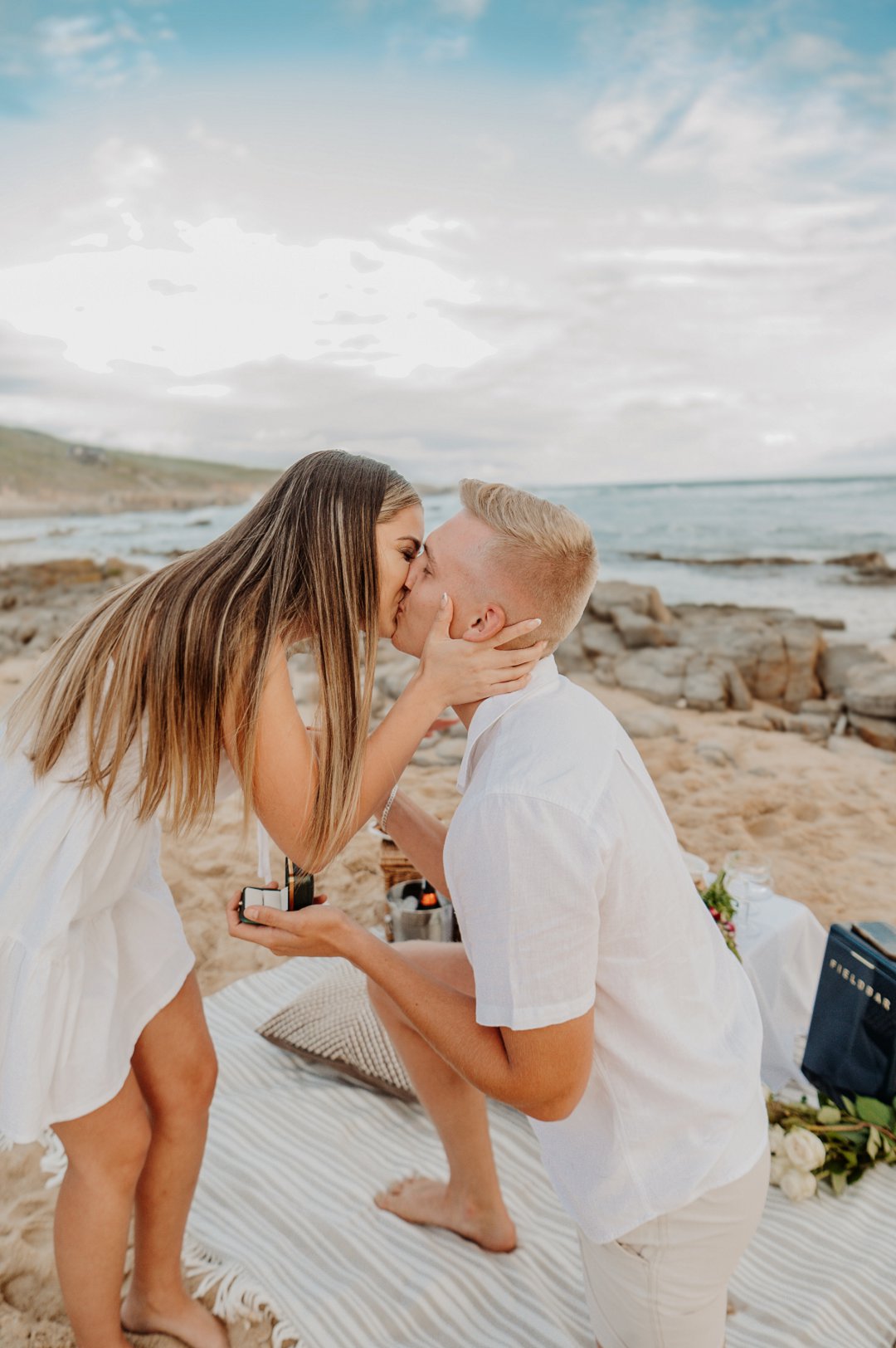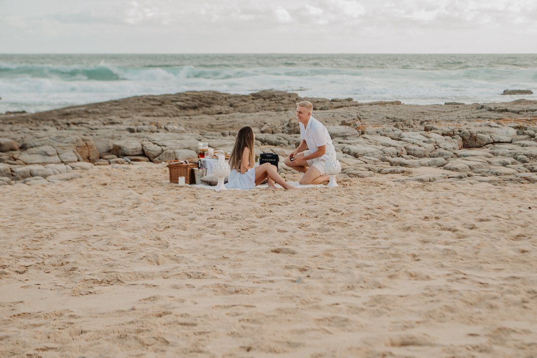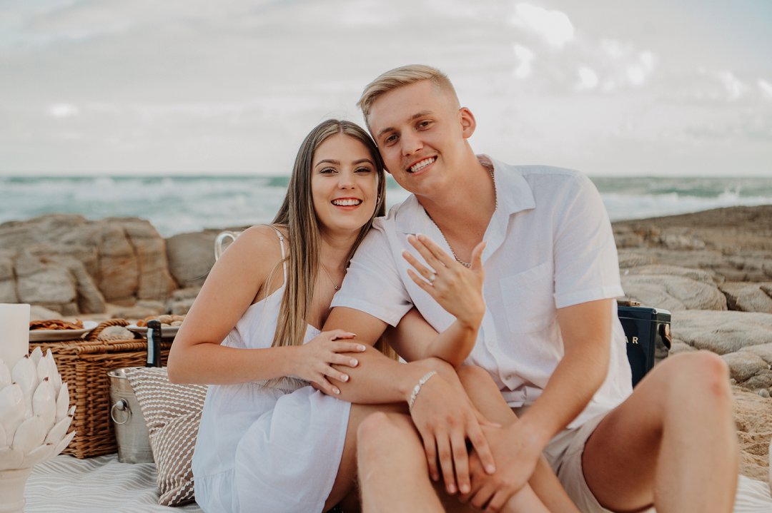 Aanvanklik was dit net bedoel as ān gewone paartjie fotosessie vir ān paar mooi foto’s. Maar toe verander alles ā die sessie het in ān intieme piekniek ontaard wat uiteindelik hul spesiale verlowing geword het. Die verlowing was vir Chazelle ān totale verrassing. Sy het gedink hulle gaan net ān strand piekniek hou, saam met ān fotosessie. Tot Jovan onverwags op een knie sak en haar die groot vraag vra… Wow! Wat ān ongelooflike plek en oomblik vir só ān belangrike geleentheid.
