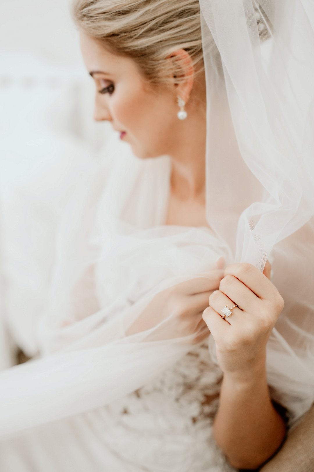 Verloofring is goud met klein diamantjies op die pant en ’n radiant cut diamant in die middel.