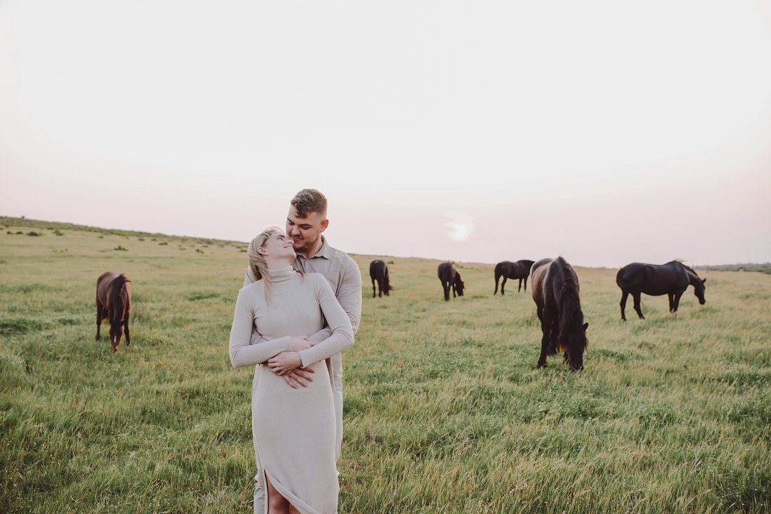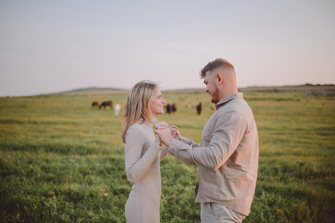 Gielie en Gabi se verlowing fotosessie tussen die perde in Yzerfontein, Wes-Kaap, is ’n pragtige voorbeeld van hoe besonders só ’n sessie kan wees. Die paartjie se fotosessie straal ’n romantiese, aardse atmosfeer uit, omring deur golwende grasvelde en majestueuse perde.
