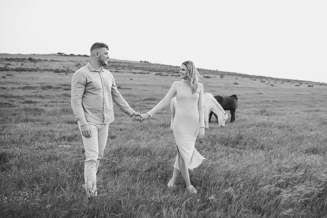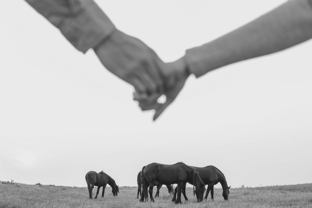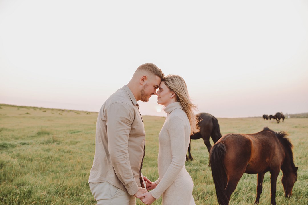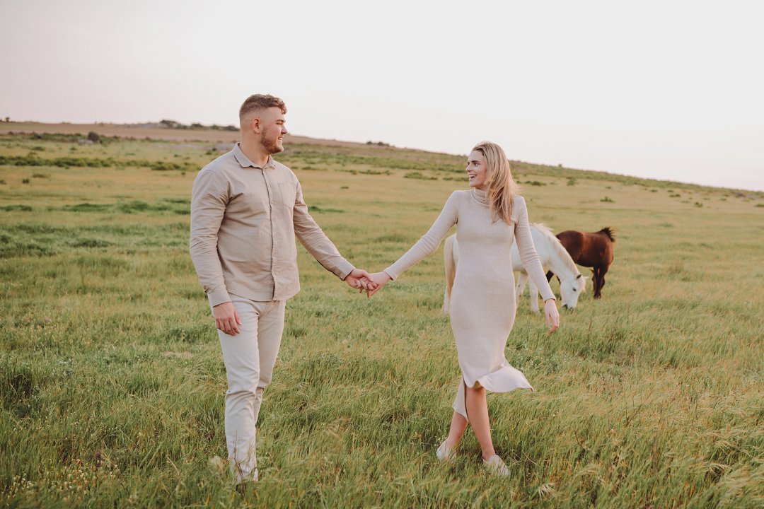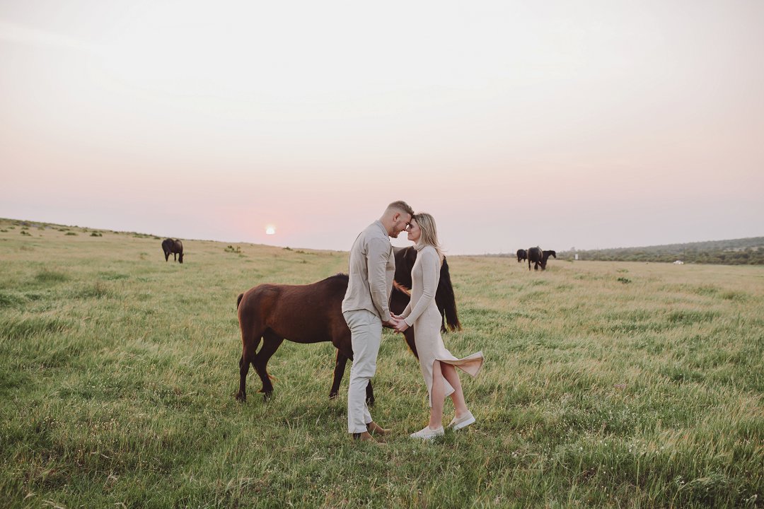 Gielie en Gabi se verlowing fotosessie tussen die perde in Yzerfontein, Wes-Kaap, is ’n pragtige voorbeeld van hoe besonders só ’n sessie kan wees. Die paartjie se fotosessie straal ’n romantiese, aardse atmosfeer uit, omring deur golwende grasvelde en majestueuse perde.