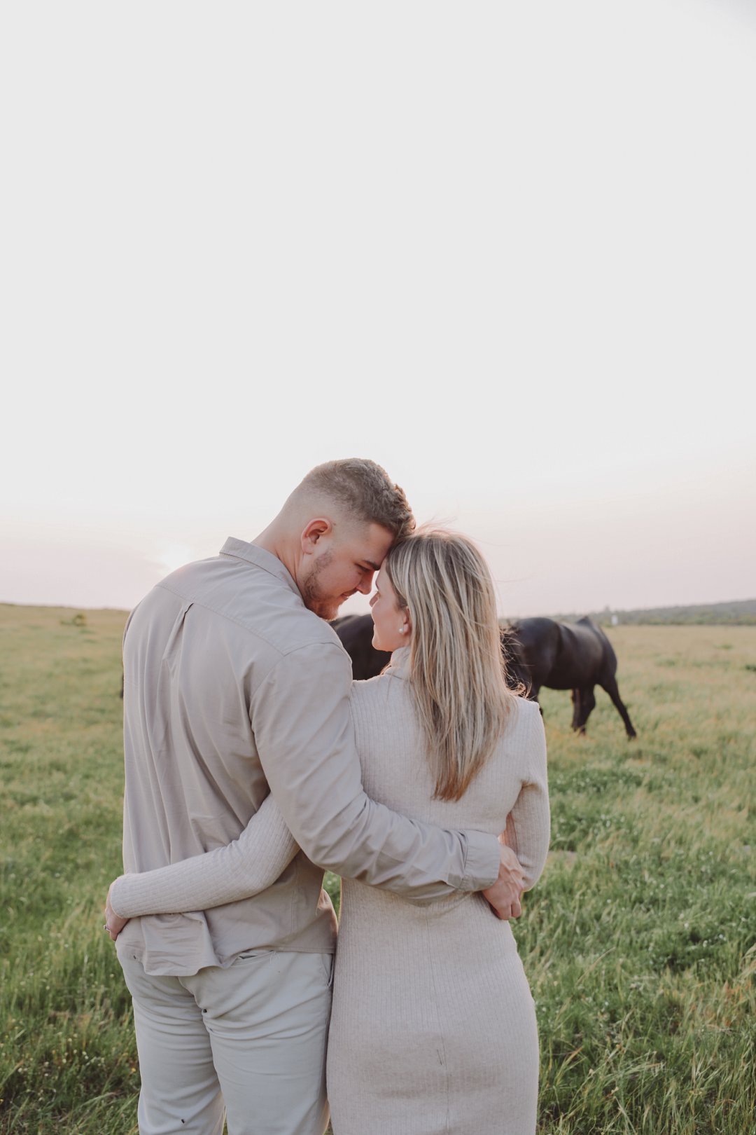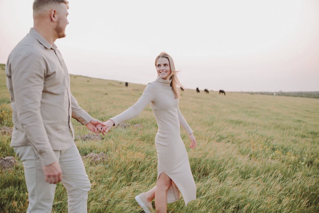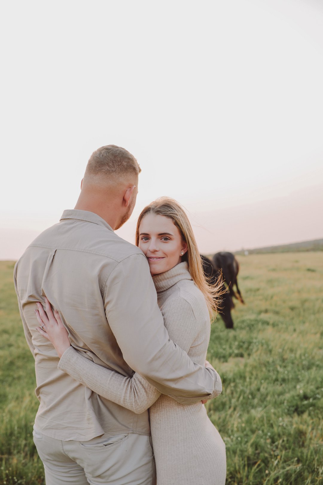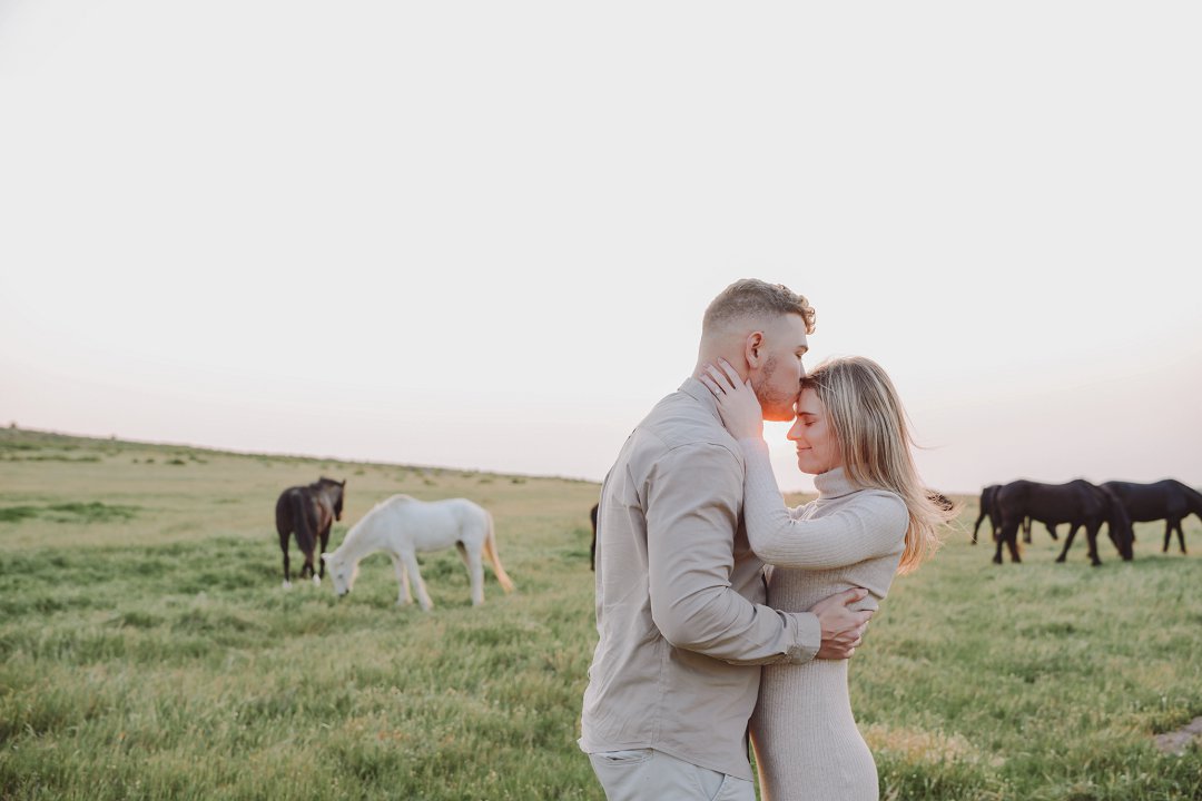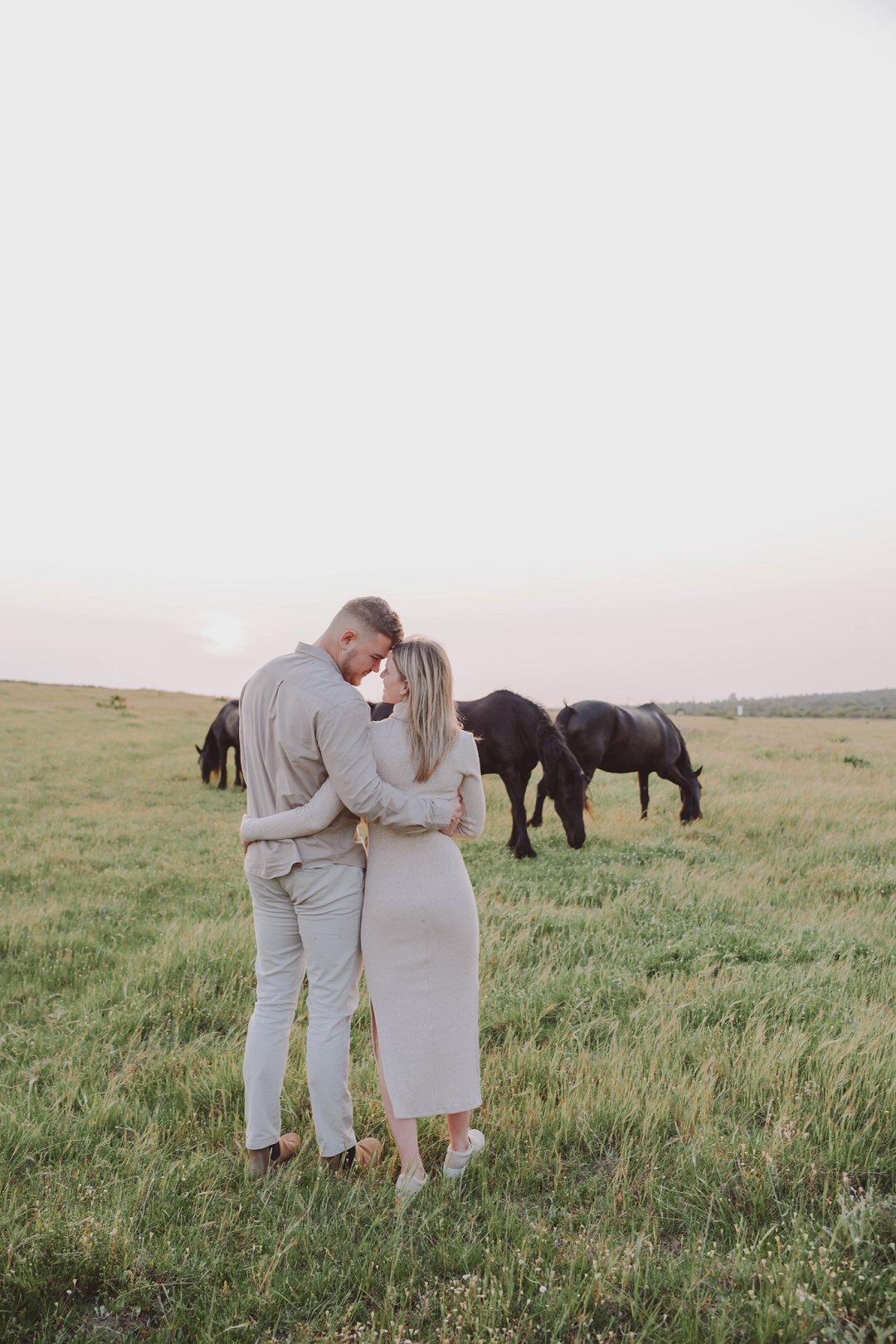 Daar is verskeie elemente wat bydra tot die sukses van ’n verlowing fotosessie. Die eerste is beslis die ligging en Gielie en Gabi se keuse van ’n oop veld vol perde was werklik asemrowend. Die tweede is hul kleredrag. Ons is absoluut mal oor hul styl van lig, neutraal en perfek in lyn met die natuurlike agtergrond. Neutrale, aardse kleure werk altyd uitstekend vir foto’s en bring ’n tydlose gevoel na vore.