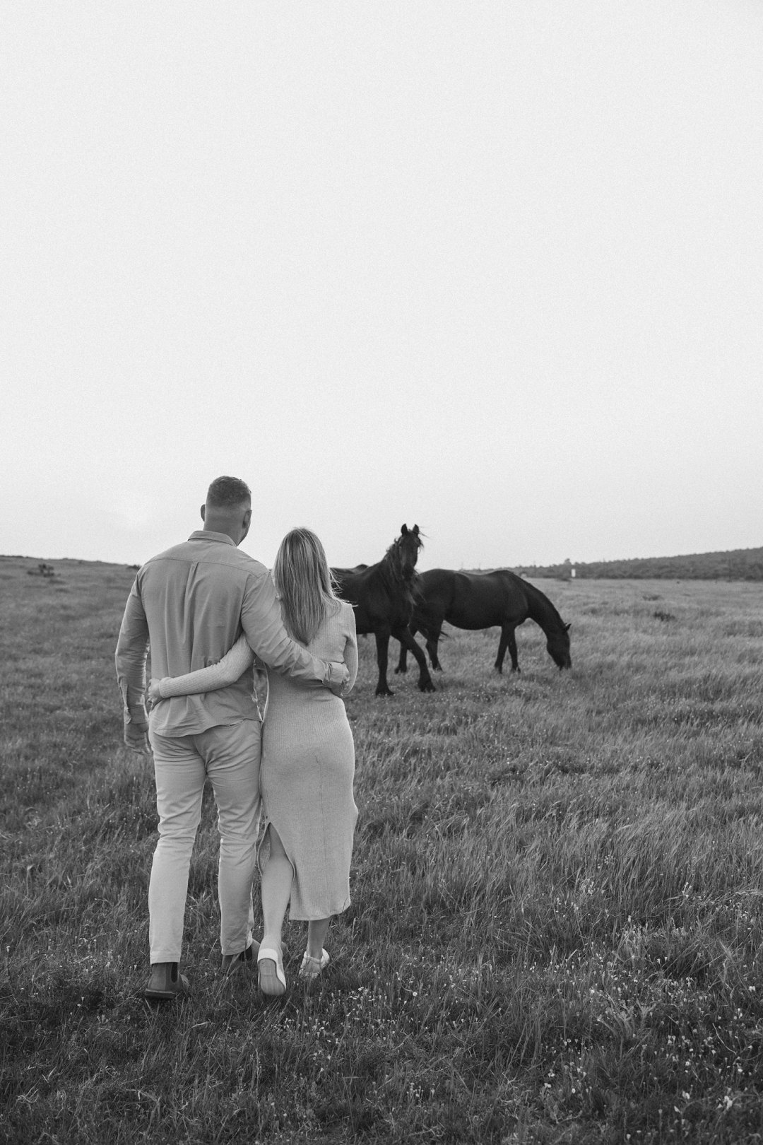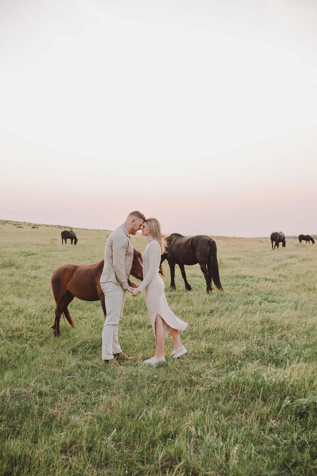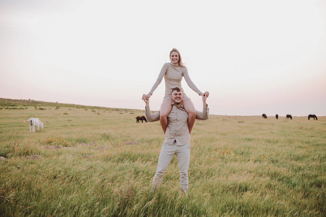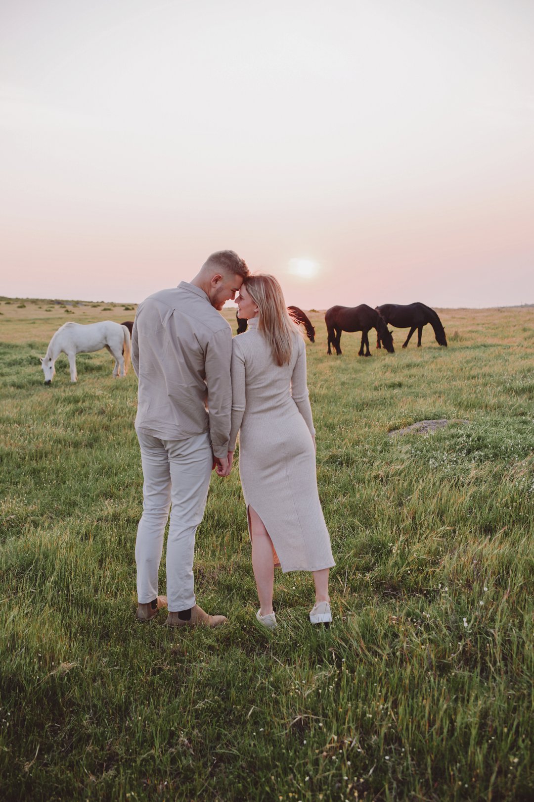 Daar is verskeie elemente wat bydra tot die sukses van ’n verlowing fotosessie. Die eerste is beslis die ligging en Gielie en Gabi se keuse van ’n oop veld vol perde was werklik asemrowend. Die tweede is hul kleredrag. Ons is absoluut mal oor hul styl van lig, neutraal en perfek in lyn met die natuurlike agtergrond. Neutrale, aardse kleure werk altyd uitstekend vir foto’s en bring ’n tydlose gevoel na vore.