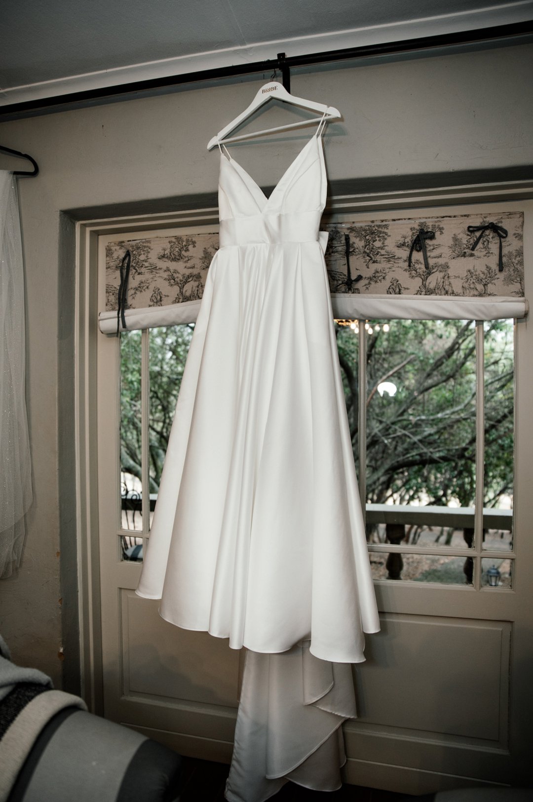 Die trourok was ‘n stylvolle, satyn materiaal rok met ‘n ivoor kleur en’n A-lyn silhoeëtte gekoop by Coco Belle. Daar was ‘n lae halslyn met soortgelyke uitknipsels aan die kante van die rok afgerond met ‘n strik aan die agterkant gestileer met knopies van die middel tot by die sleep van die rok. Die rok het ook sakke gehad.