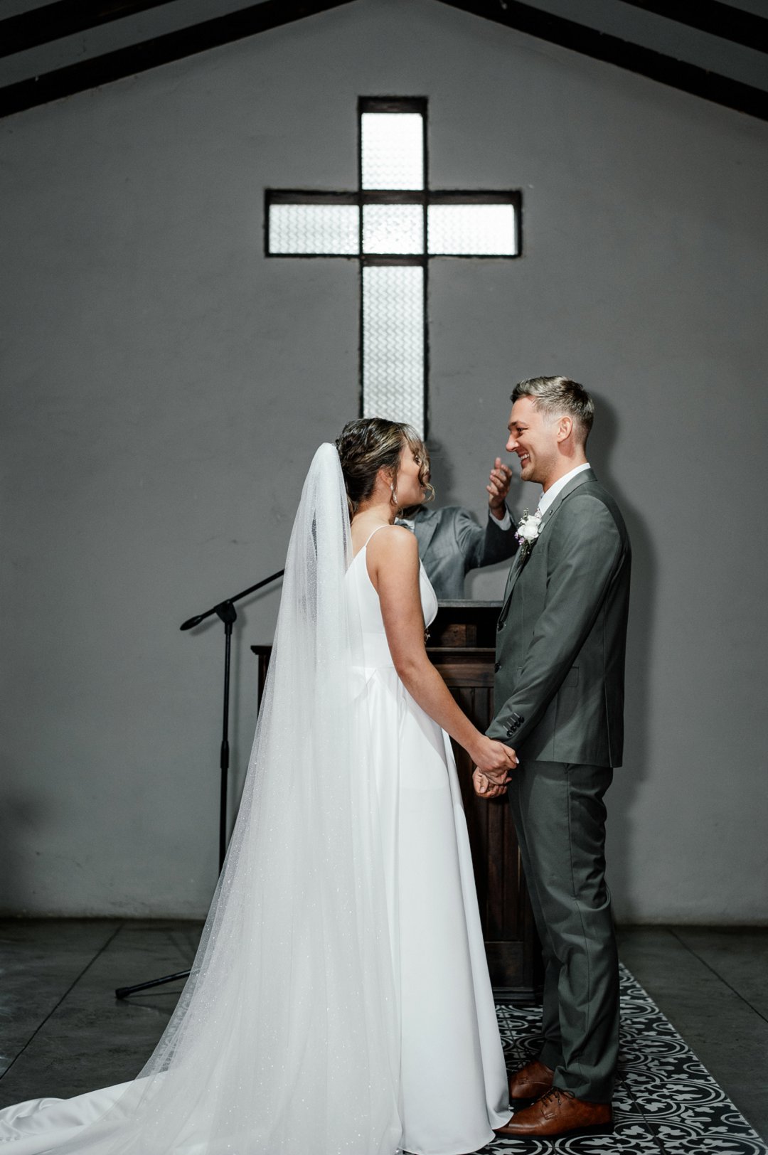 Ons was baie gefokus op ‘n minimalistiese gevoel, maar wat stylvol gedoen word en nie afgeskeep voel nie. Die algehele kleurskema waarvoor ons gegaan het was olyfgroen, ‘dusty’ pienk en wit om te pas by ‘n Koningsprotea-blom. Ons het baie gefokus op die groen kleur (byvoorbeeld, eukaliptus rangskikkings op die tafel, koeverte met spesiale boodskappe vir die gaste, ontvangsbord, bruidegom se pak, strooimeisierokke, ens.).