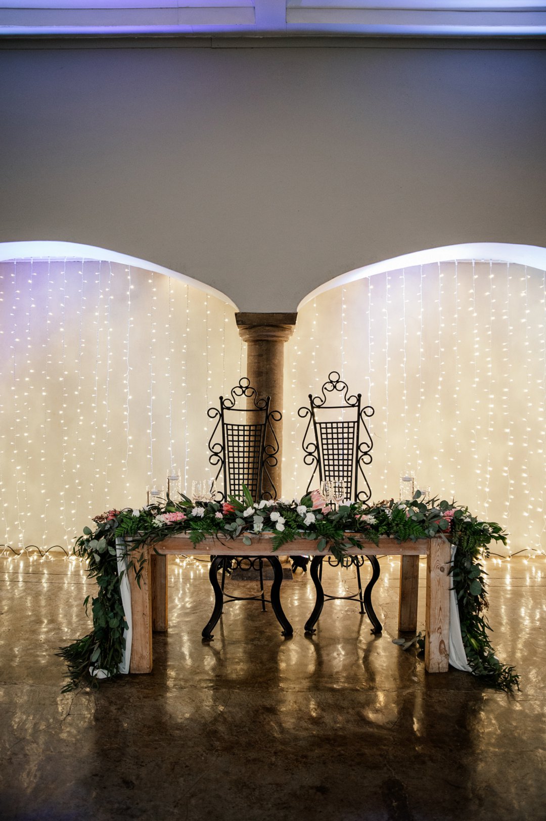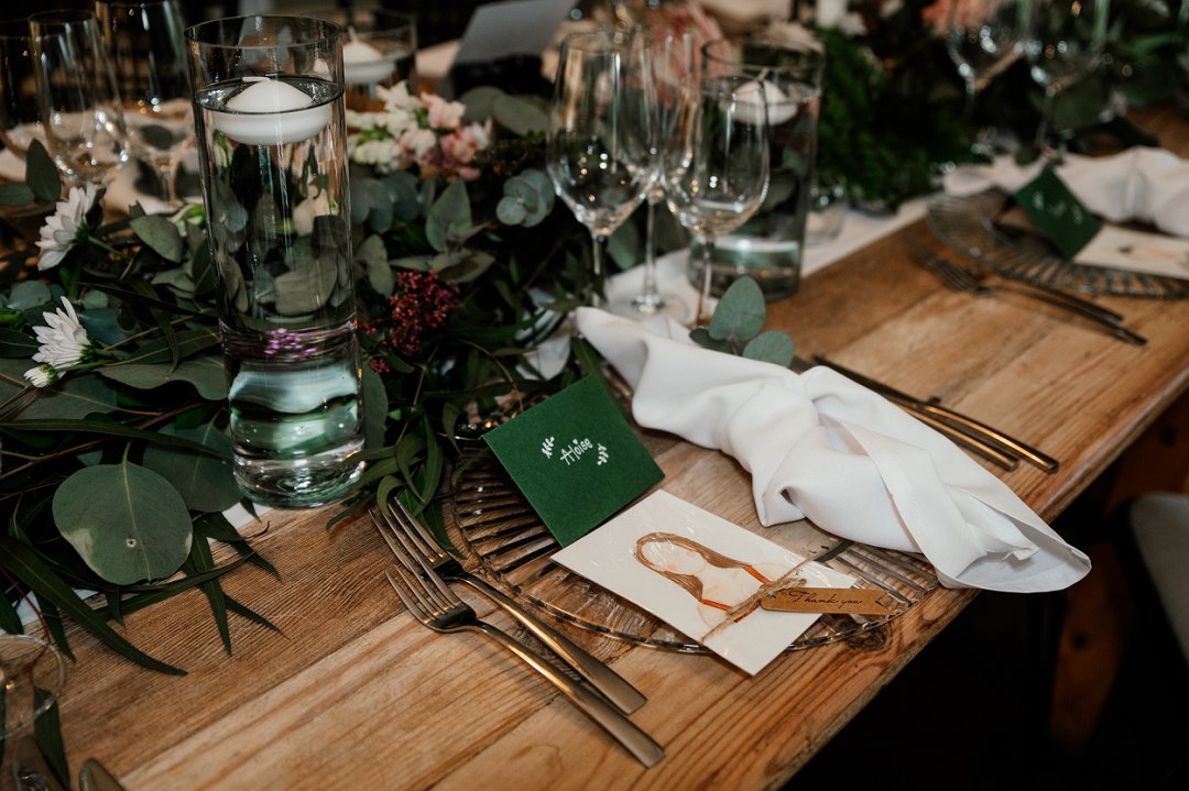 Die algehele gevoel van die troue was minimalisties en stylvol. Die kleurskema van olyfgroen, vuilpienk en wit is geïnspireer deur die majestueuse Koning Protea. Bliss Floral Creations het Jaco en Denise se visie pragtig tot lewe gebring met weelderige tafellopers van vars blare en asemrowende blommerangskikkings. Lang houttafels is gekomplementeer met swart metaalstoele, eenvoudige wit servette en goue eetgerei. Deursigtige glasvase met drywende kerse het ‘n romantiese atmosfeer geskep.
