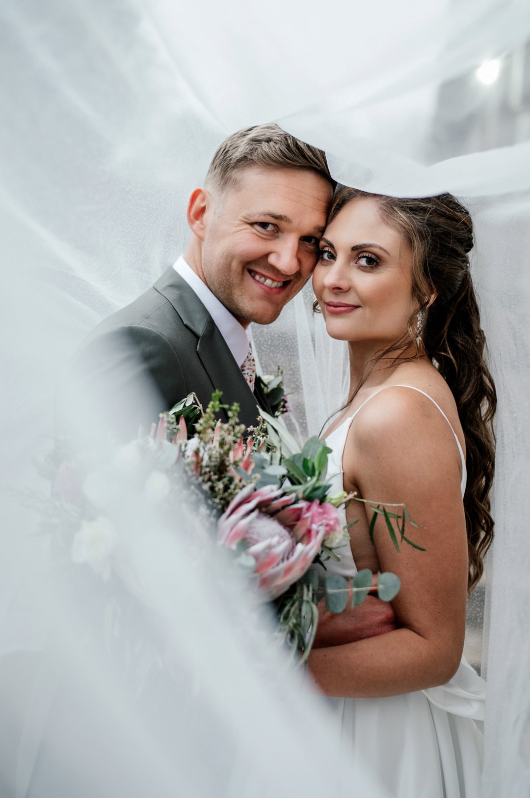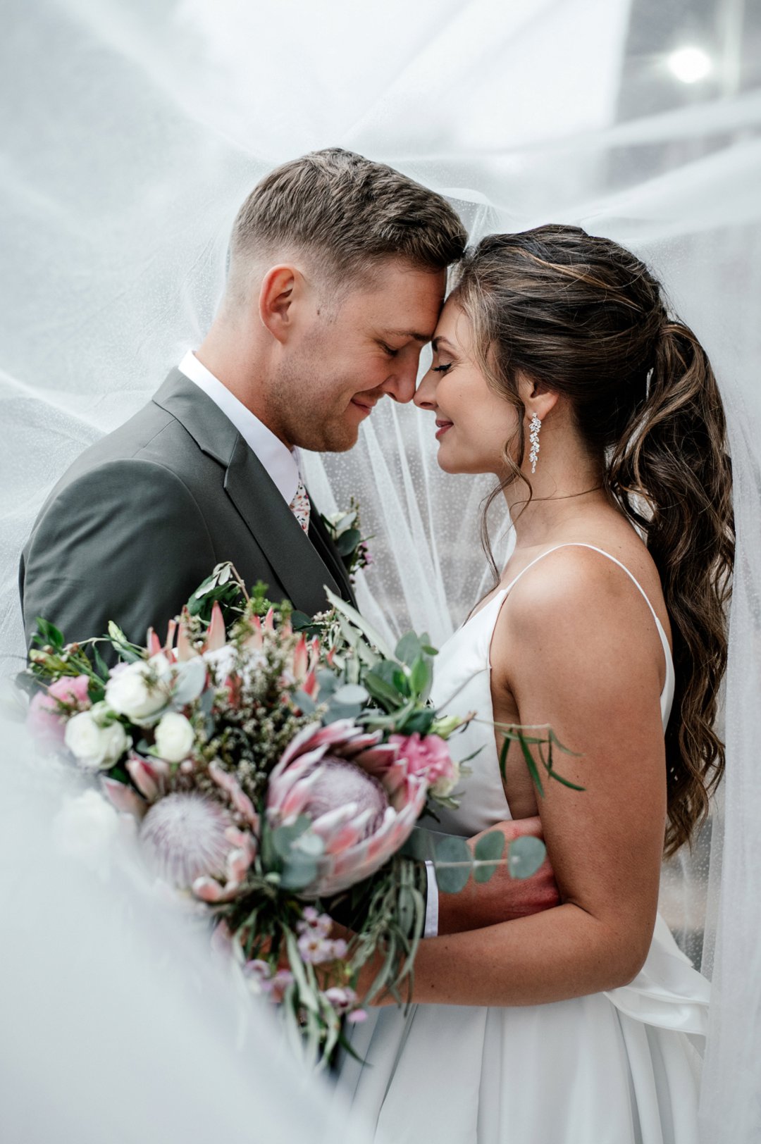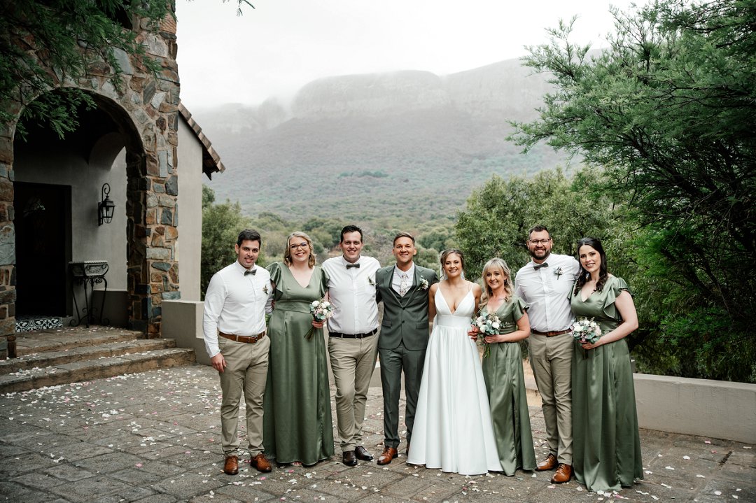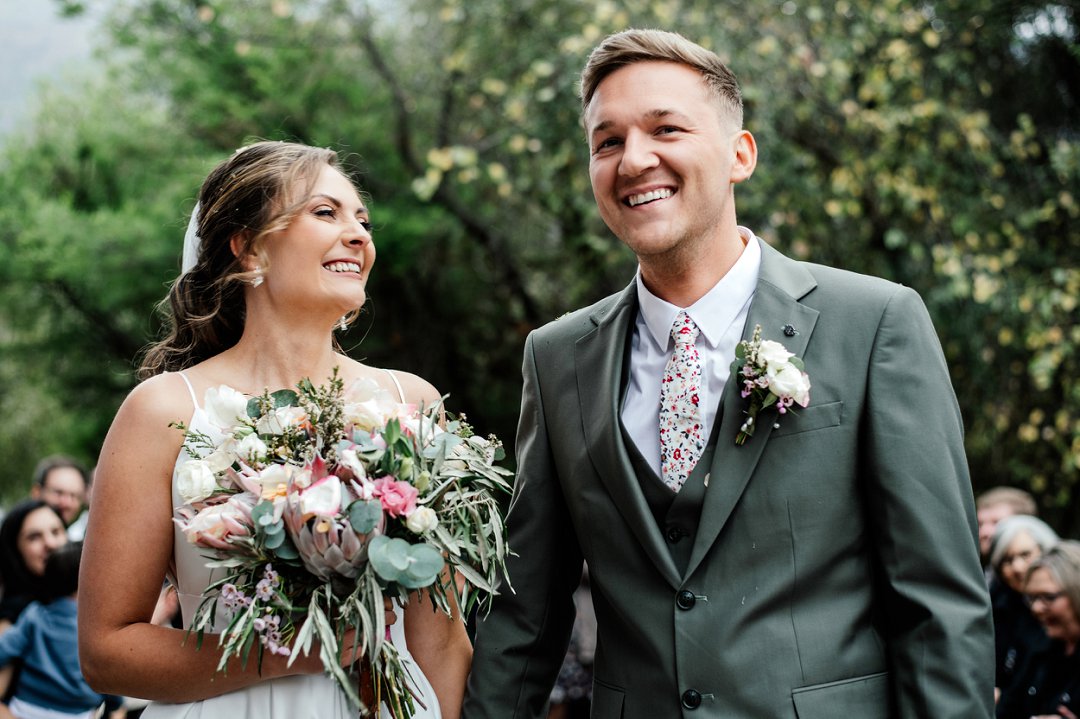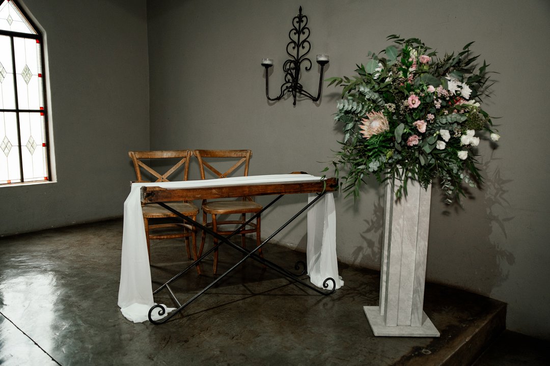 Ons was baie gefokus op ‘n minimalistiese gevoel, maar wat stylvol gedoen word en nie afgeskeep voel nie. Die algehele kleurskema waarvoor ons gegaan het was olyfgroen, ‘dusty’ pienk en wit om te pas by ‘n Koningsprotea-blom. Ons het baie gefokus op die groen kleur (byvoorbeeld, eukaliptus rangskikkings op die tafel, koeverte met spesiale boodskappe vir die gaste, ontvangsbord, bruidegom se pak, strooimeisierokke, ens.).