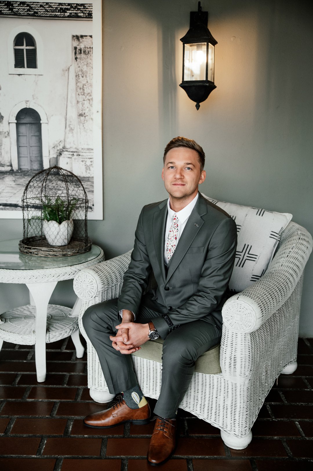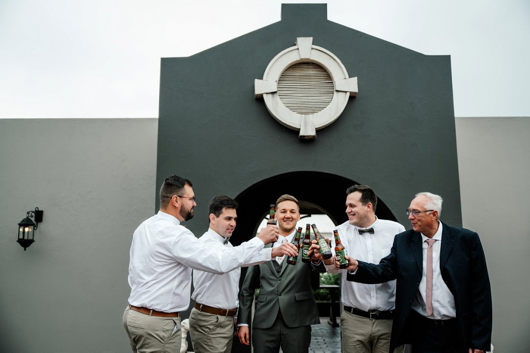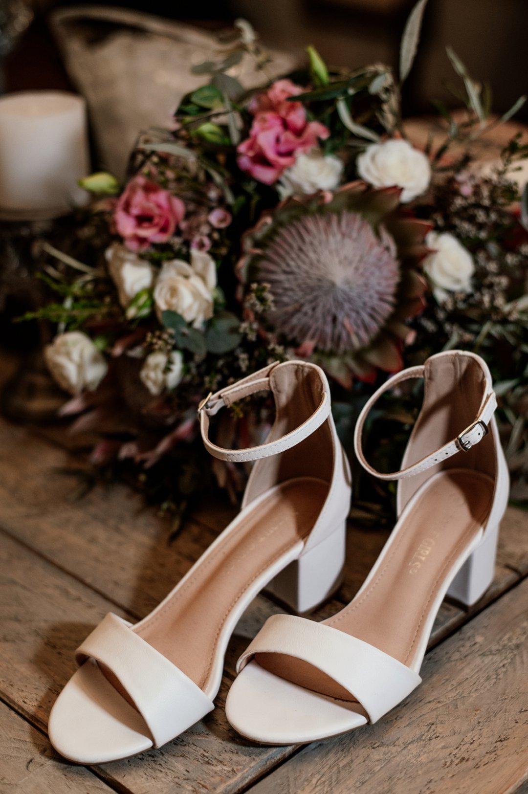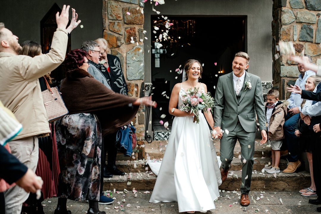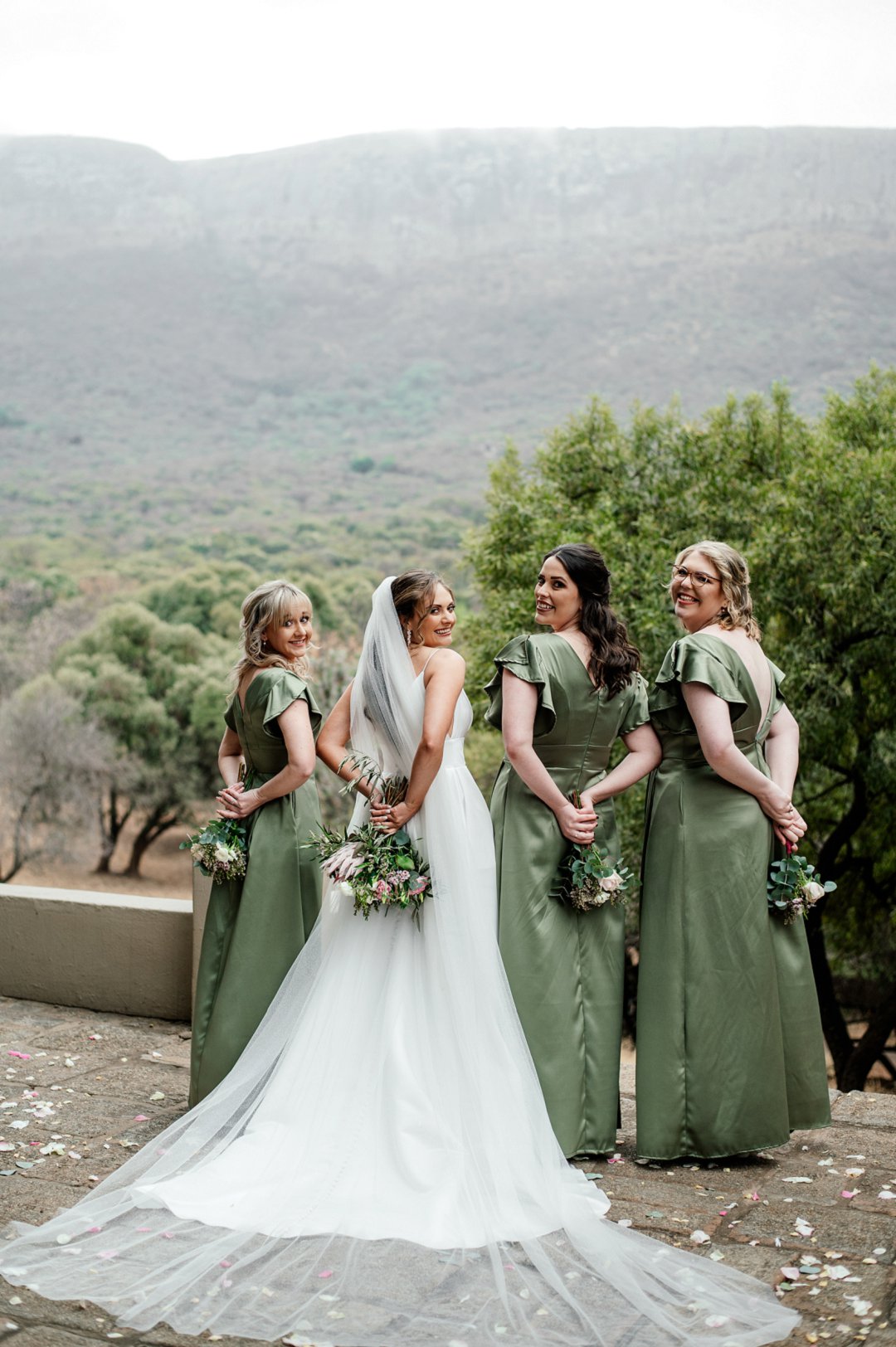 Ons was baie gefokus op ‘n minimalistiese gevoel, maar wat stylvol gedoen word en nie afgeskeep voel nie. Die algehele kleurskema waarvoor ons gegaan het was olyfgroen, ‘dusty’ pienk en wit om te pas by ‘n Koningsprotea-blom. Ons het baie gefokus op die groen kleur (byvoorbeeld, eukaliptus rangskikkings op die tafel, koeverte met spesiale boodskappe vir die gaste, ontvangsbord, bruidegom se pak, strooimeisierokke, ens.).
