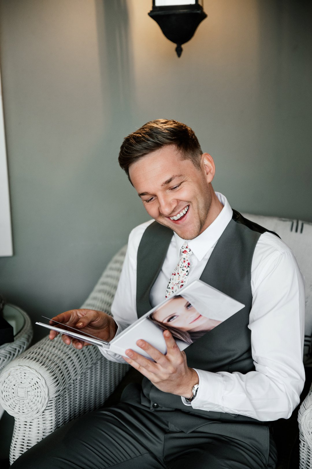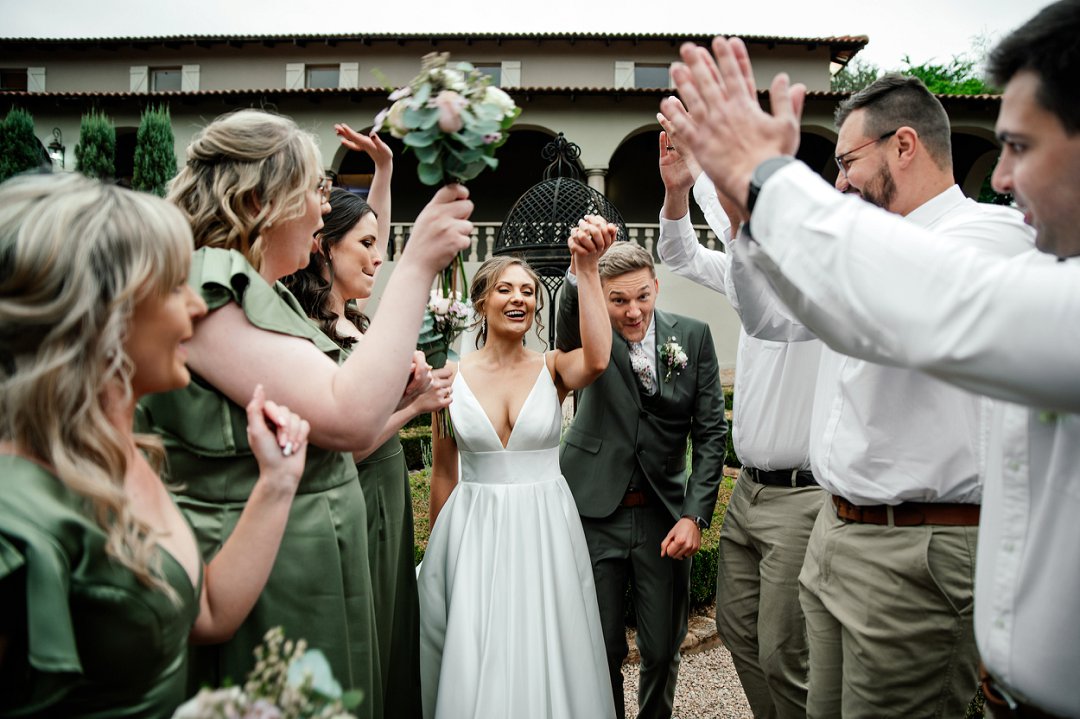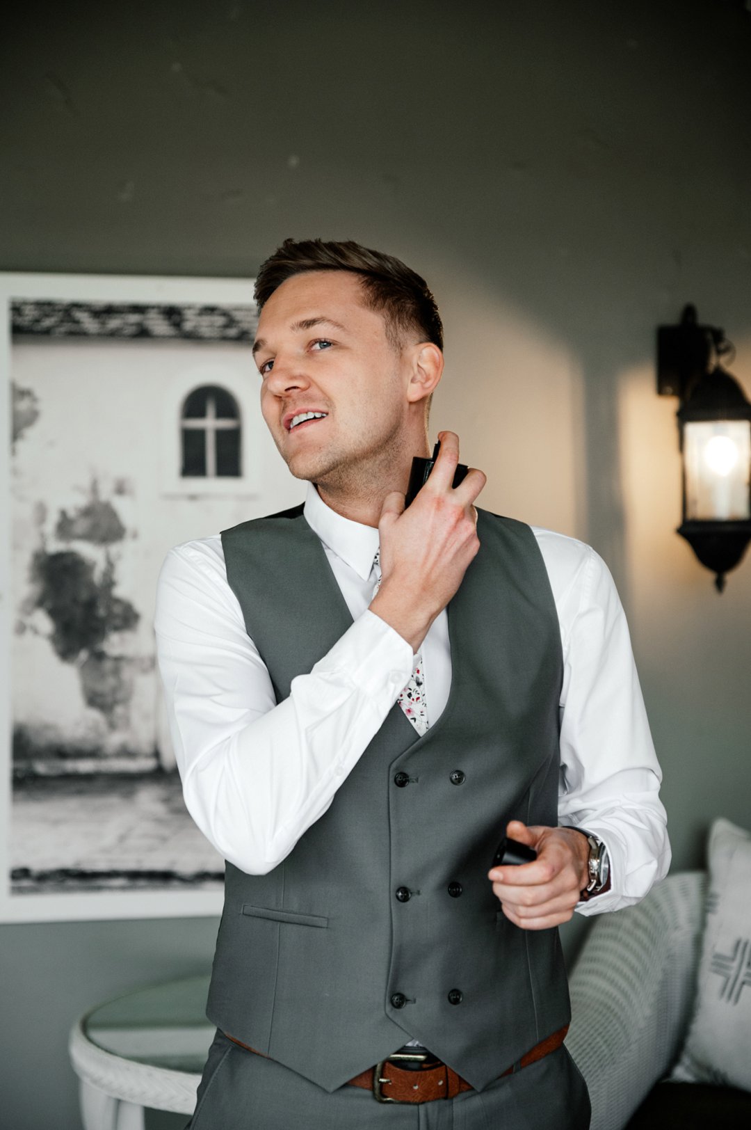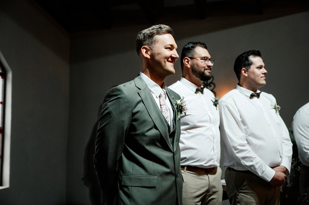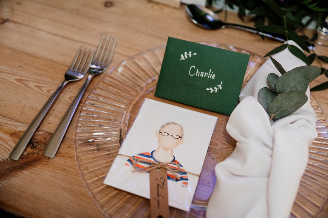 Ons was baie gefokus op ‘n minimalistiese gevoel, maar wat stylvol gedoen word en nie afgeskeep voel nie. Die algehele kleurskema waarvoor ons gegaan het was olyfgroen, ‘dusty’ pienk en wit om te pas by ‘n Koningsprotea-blom. Ons het baie gefokus op die groen kleur (byvoorbeeld, eukaliptus rangskikkings op die tafel, koeverte met spesiale boodskappe vir die gaste, ontvangsbord, bruidegom se pak, strooimeisierokke, ens.).