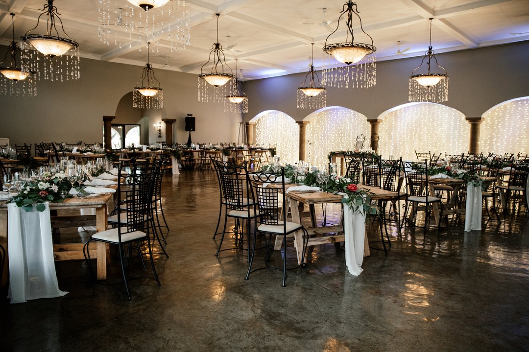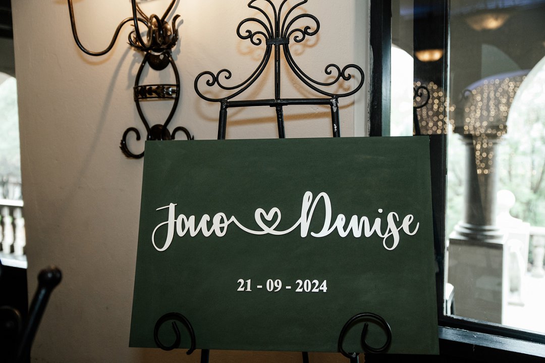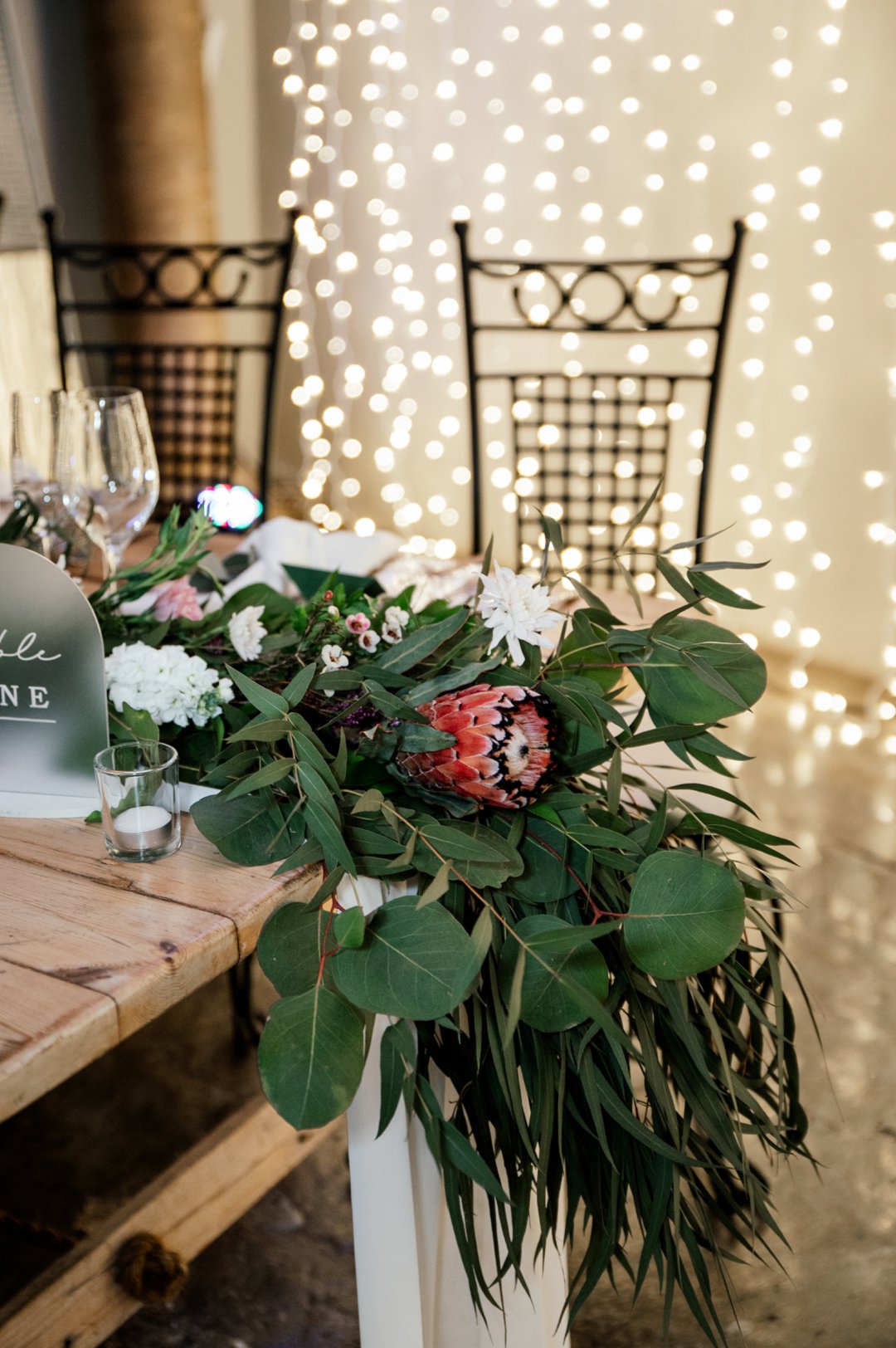 Die algehele gevoel van die troue was minimalisties en stylvol. Die kleurskema van olyfgroen, vuilpienk en wit is geïnspireer deur die majestueuse Koning Protea. Bliss Floral Creations het Jaco en Denise se visie pragtig tot lewe gebring met weelderige tafellopers van vars blare en asemrowende blommerangskikkings. Lang houttafels is gekomplementeer met swart metaalstoele, eenvoudige wit servette en goue eetgerei. Deursigtige glasvase met drywende kerse het ‘n romantiese atmosfeer geskep.