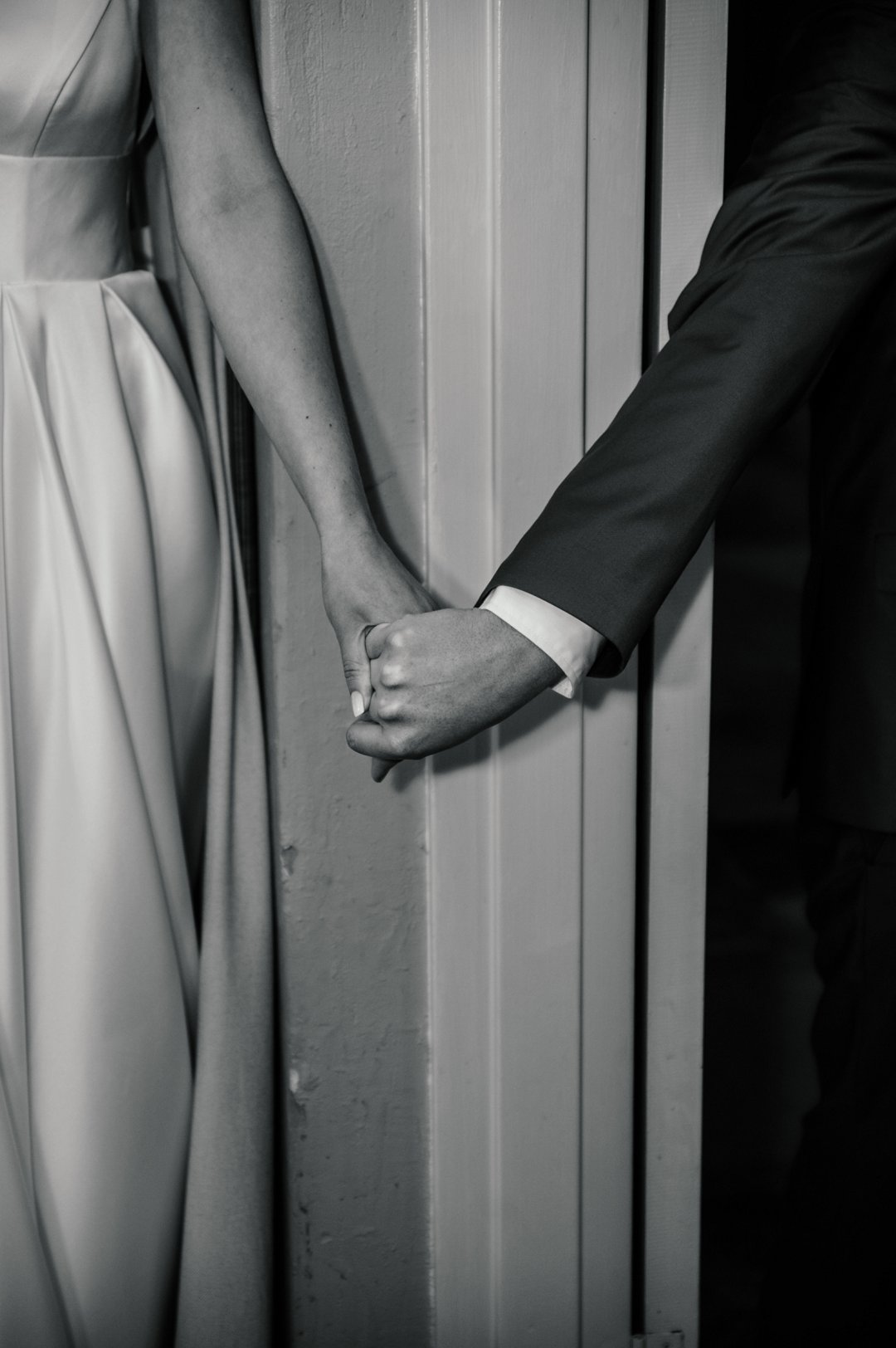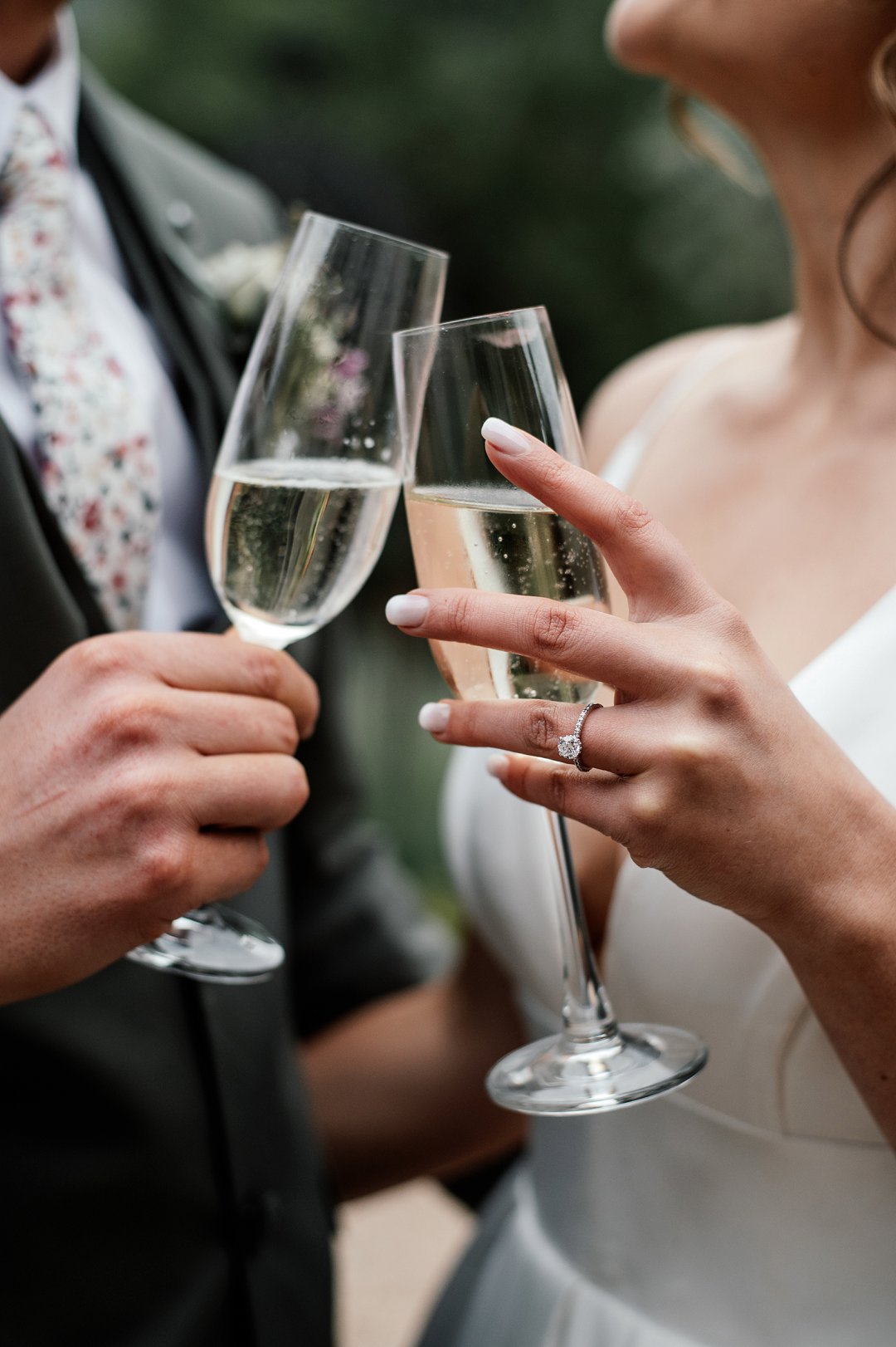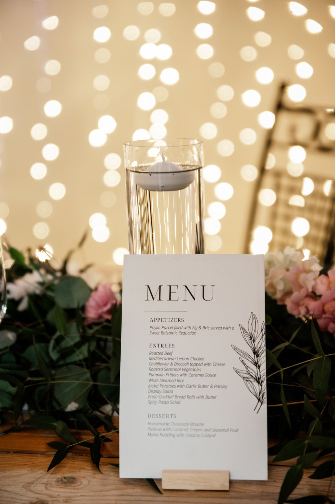 Die algehele gevoel van die troue was minimalisties en stylvol. Die kleurskema van olyfgroen, vuilpienk en wit is geïnspireer deur die majestueuse Koning Protea. Bliss Floral Creations het Jaco en Denise se visie pragtig tot lewe gebring met weelderige tafellopers van vars blare en asemrowende blommerangskikkings. Lang houttafels is gekomplementeer met swart metaalstoele, eenvoudige wit servette en goue eetgerei. Deursigtige glasvase met drywende kerse het ‘n romantiese atmosfeer geskep.