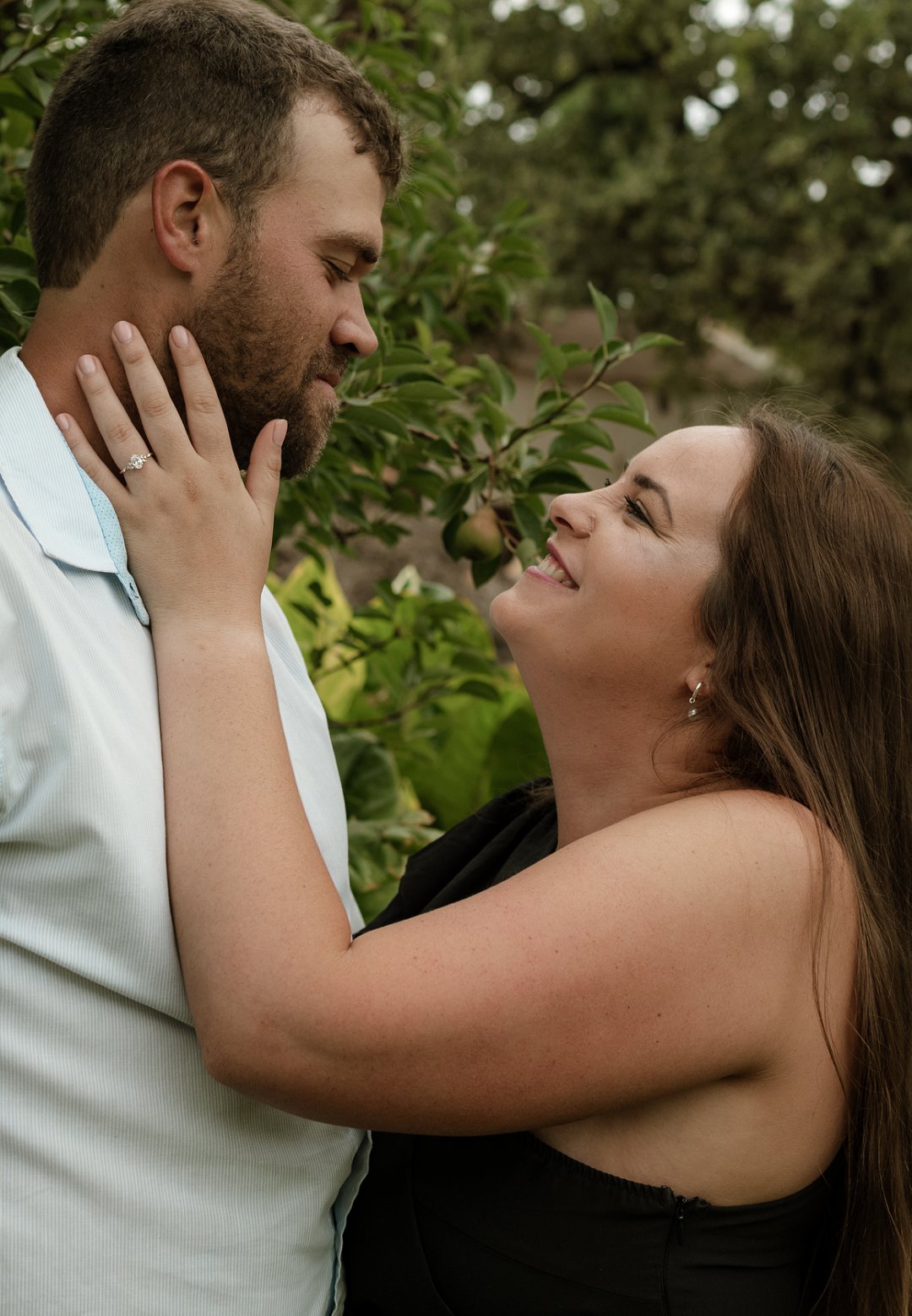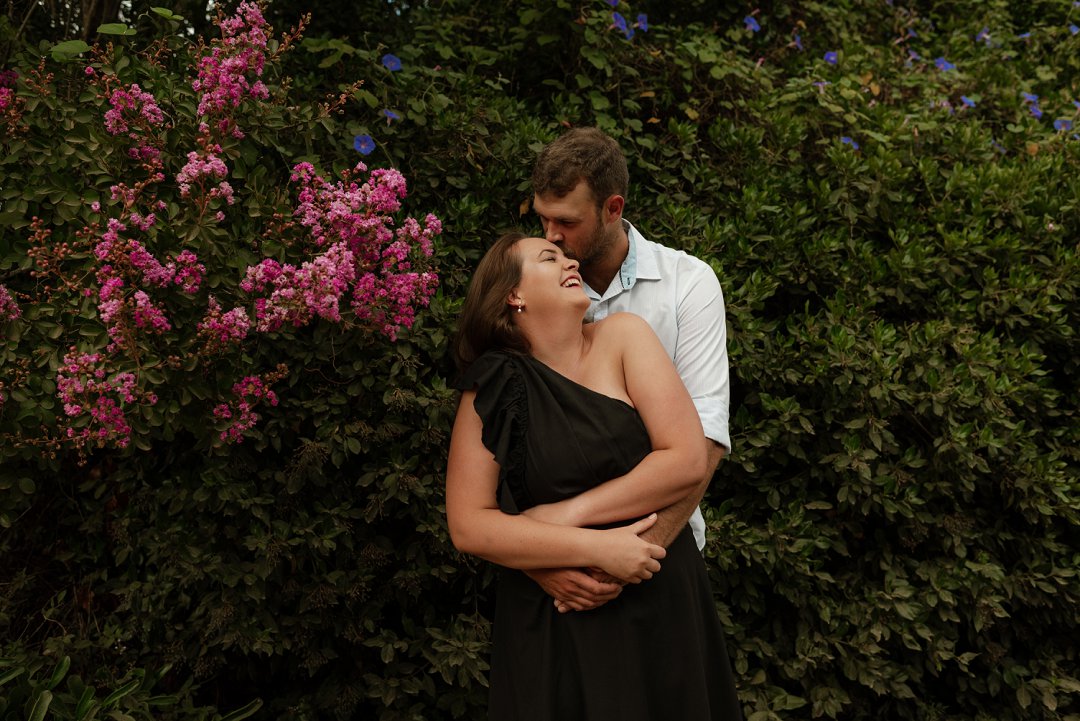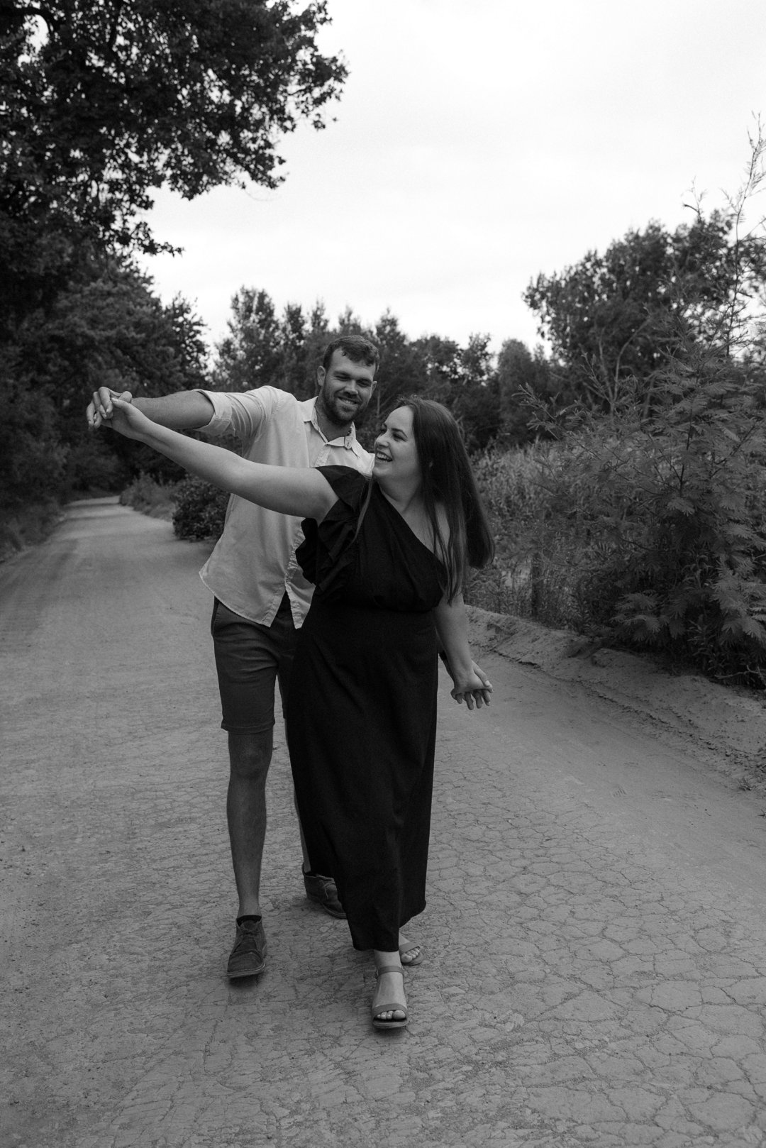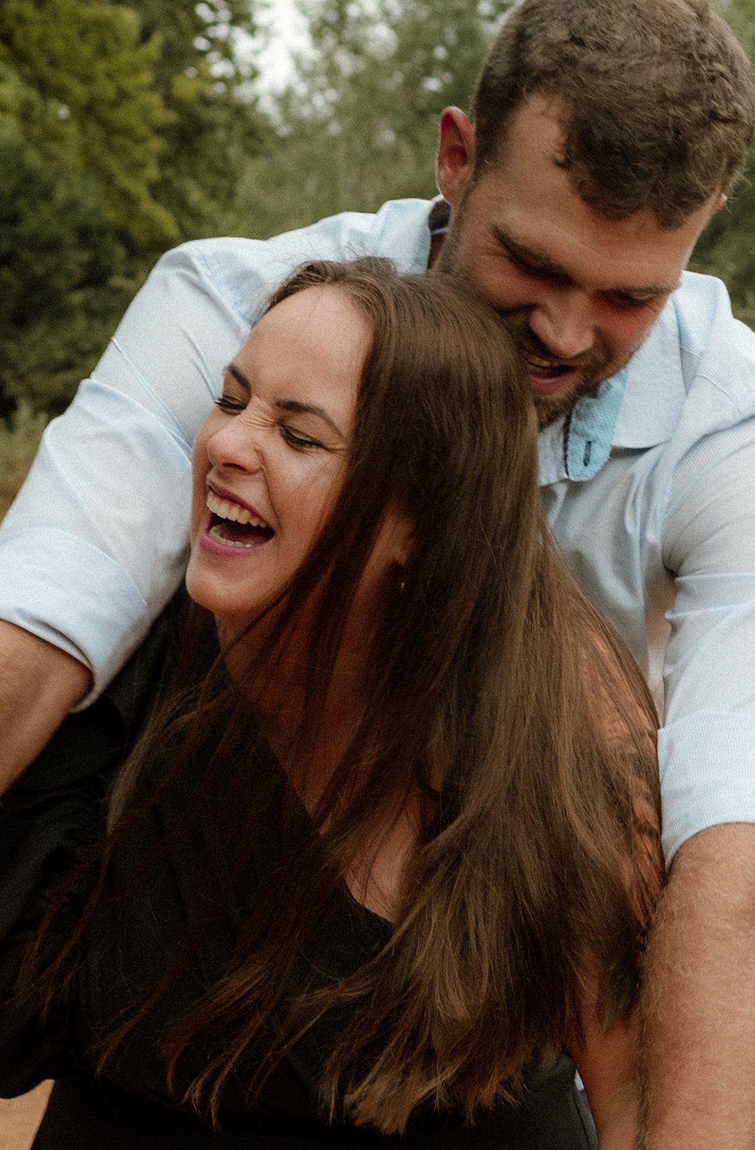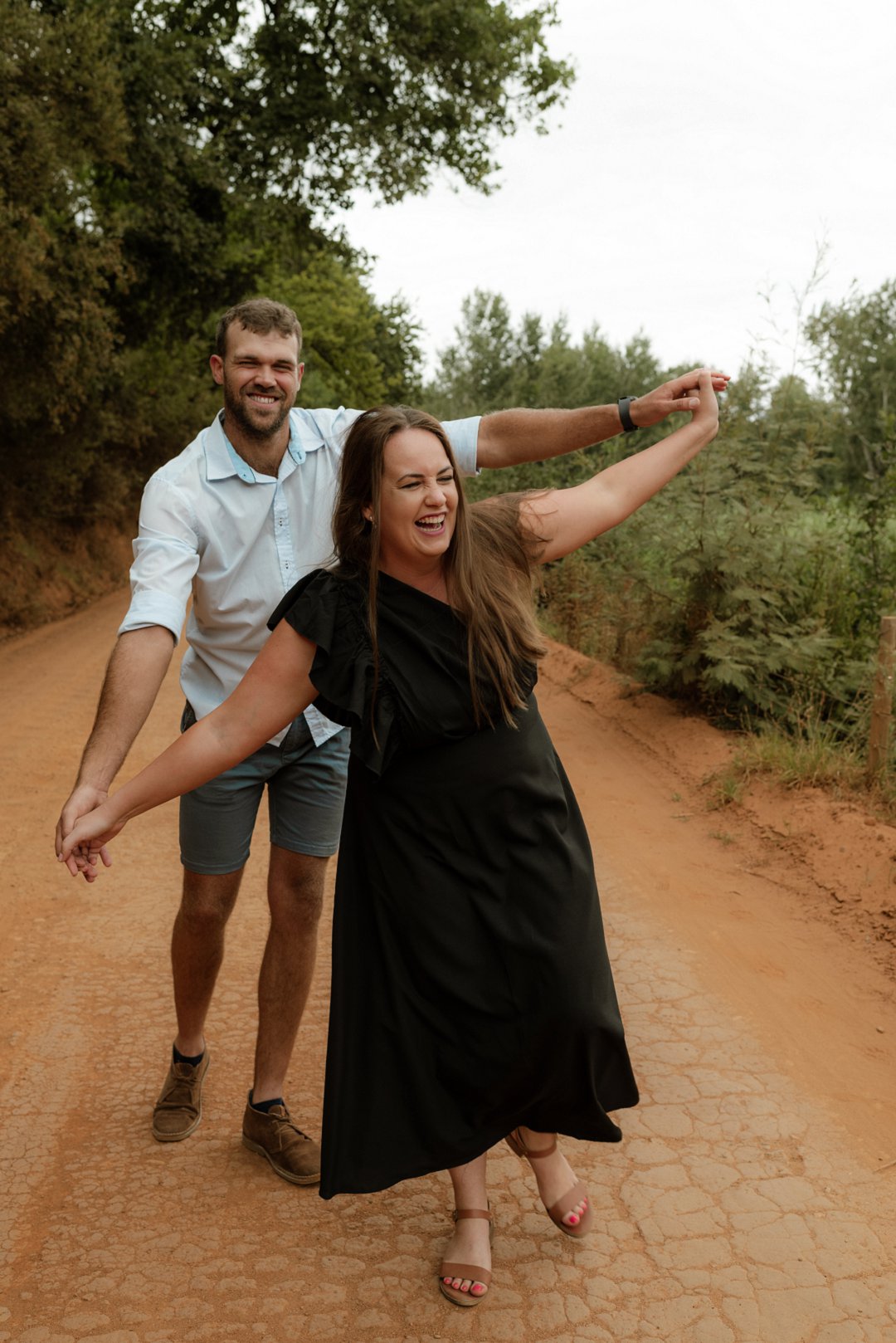 Rol af en geniet die opregte en gelukkige oomblikke vasgevang in Mark en Anke se dromerige verlowing fotosessie in die bos vol lag en liefde.