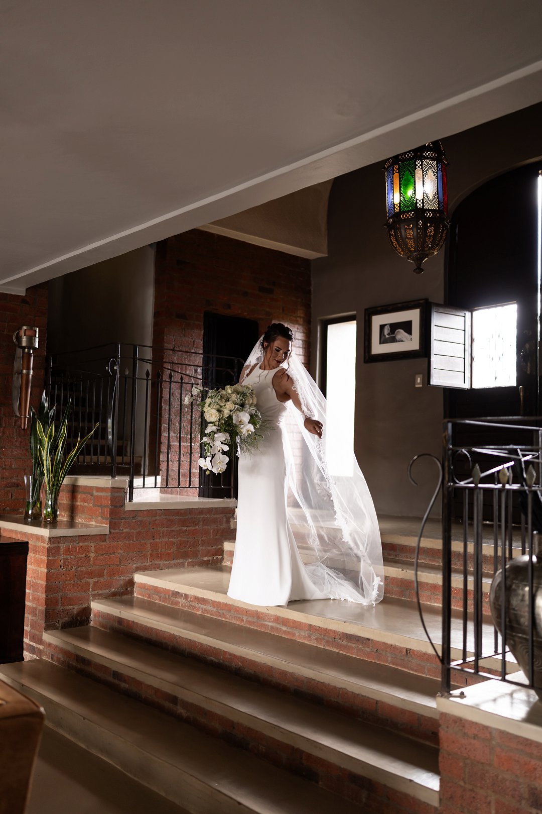 Die semi-meermin snit het my figuur met verfynde presisie beklemtoon,’n balans tussen romantiese vloei en subtiele drama. Die halternek het my postuur met koninklike grasie versterk, terwyl die oop rug met die fyn krale-band oor my skouerblaaie ‘n boeiende, delikate detail verskaf het, ‘n spel van lig en beweging soos ek gestap het. Elke verandering wat deur Lilia aangebring was, was soos die fyn laaste kwashale op ‘n meesterstuk, ‘n rok wat nie net ‘n klassieke simbool van skoonheid was nie, maar ‘n verlengstuk van my eie persoonlikheid, styl en daardie onmiskenbare gevoel van geluk op my spesiale dag.