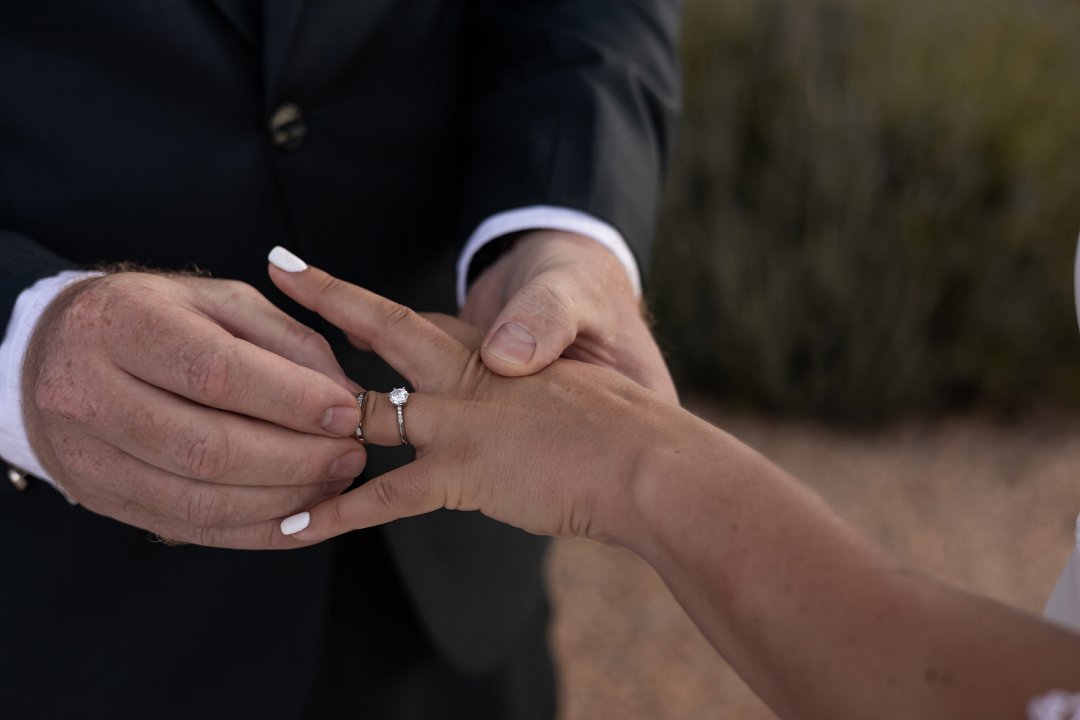 Die troupand dra die erfenis van liefde en toewyding, ‘n kosbare geskenk van Melissa se ma. Hierdie witgoud ring, met sy 18 fyn diamante, het reeds ‘n verhaal van vier dekades se liefde en verbintenis. Nou, as ‘n deel van Ruan en Melissa se reis, bly dit ‘n tydlose simbool van die sterk band wat hulle deel, ‘n herinnering aan die waarde van familie, tradisie en die belofte van ‘n leeftyd saam.